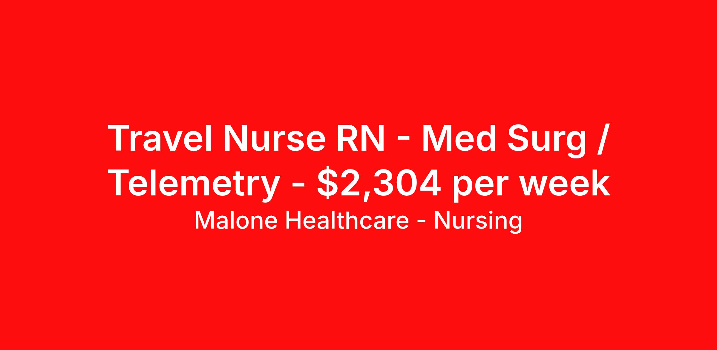 Malone Healthcare - Nursing is seeking a travel nurse RN Med Surg / Telemetry for a travel nursing job in Marion, Illinois. Job Description & Requirements Specialty: Med Surg / Telemetry Discipline: RN Start Date: 04/13/2026 Duration: 13 weeks 36 hours per week Shift: 12 hours, days, nights Employment Type: Travel About Malone Healthcare - Nursing With a commitment to providing a higher standard of service and experience in patient care, Malone Healthcare places expert nurses and allied health professionals in rewarding careers throughout the United States. As a leading healthcare staffing agency, Malone’s focus on compliance and integrity translates to a seamless experience for our team members and partner facilities. When you work with Malone Healthcare, you can rely on over 50 years of proven experience placing exceptional professionals in quality healthcare settings. Benefits Weekly pay Holiday Pay Guaranteed Hours Continuing Education 401k retirement plan Pet insurance Referral bonus Medical benefits Dental benefits Vision benefits License and certification reimbursement Life insurance