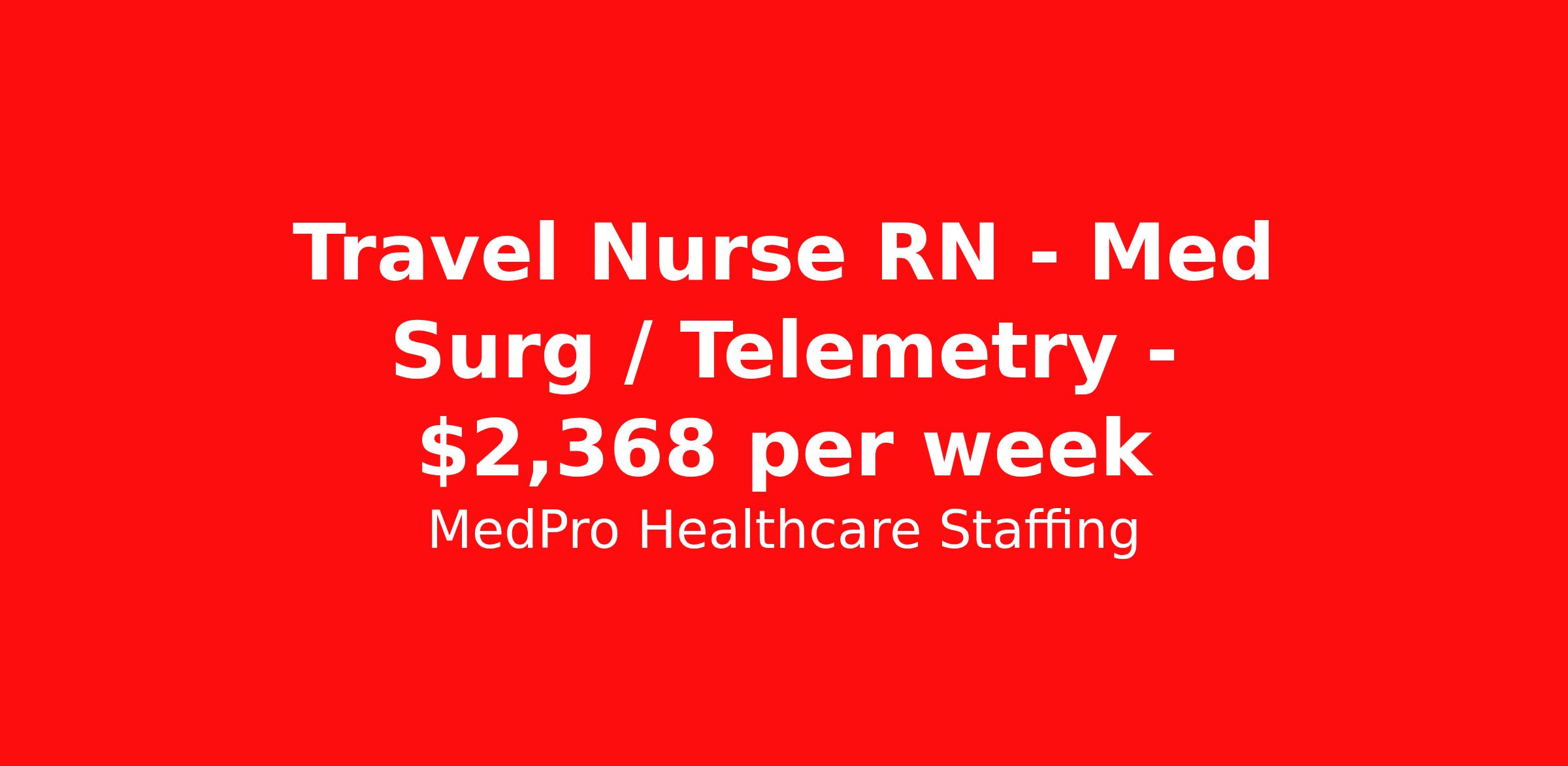 MedPro Healthcare Staffing is seeking a travel nurse RN Med Surg / Telemetry for a travel nursing job in Albany, New York. Job Description & Requirements Specialty: Med Surg / Telemetry Discipline: RN Start Date: 04/06/2026 Duration: 13 weeks 36 hours per week Shift: 12 hours Employment Type: Travel MedPro Healthcare Staffing , a Joint Commission-certified staffing agency, is seeking a quality Med-Surg registered nurse (RN) for a travel assignment with one of our top healthcare clients. Requirements Active RN License Degree from accredited nursing program BLS Certifications Eighteen months of recent experience in an Acute Care Med/Surg setting Other requirements to be determined by our client facility Benefits Weekly pay and direct deposit Full coverage of all credentialing fees Private housing or housing allowance Group Health insurance for you and your family Company-paid life and disability insurance Travel reimbursement 401(k) matching Unlimited Referral Bonuses up to $1,000 Duties Responsibilities Med-Surg Nurses (RN) provide care for primarily adult patients before and after surgical procedures; they also attend to those who are being treated with pharmaceuticals to manage illness. Due to the broad range of medical conditions Med/Surg Nurses will encounter, they must be well-versed in a large variety of health conditions. Complete assignments made by physicians. Provide routine treatment and post-surgical care. Assess changes in patient's health status and perform various treatments. Administer medication. Meticulous documentation as to medication and treatment administration to ensure continuity of care between nursing staff, physicians and other treatment team members. About Agency MedPro Healthcare Staffing is a Joint Commission certified provider of contract staffing services. Since 1983, we have placed nursing and allied travelers in top healthcare facilities nationwide. Join us today for your very own MedPro Experience®. If qualified and interested, please call for immediate consideration. MedPro Staffing is an Equal Opportunity Employer. All applicants will be considered for employment without attention to race, color, religion, national origin, age, sex, disability, marital status or veteran status. Key Words: Registered Nurse, RN, Medical-Surgical, Travel Nurse, Contract Nurse, Agency Nurse, Agency RN, RN-MS, RN- Medical Surgical, Travel RN, Contract, Nursing, RN Med-Surg, Travel Nursing *Weekly payment estimates are intended for informational purposes only and include a gross estimate of hourly wages and reimbursements for meal, incidental, and housing expenses. Your recruiter will confirm your eligibility and provide additional details. MedPro Job ID a0Fcx00000HqtrREAR. Pay package is based on 12 hour shifts and 36 hours per week (subject to confirmation) with tax-free stipend amount to be determined. Posted job title: Med-Surg/Telemetry Registered Nurse Nursing: Med Surg/Tele. About MedPro Healthcare Staffing At MedPro Healthcare Staffing , we believe no one cares more for caregivers than we do. Our mission is simple: you focus on your patients, and we’ll take care of the rest. As a Joint Commission-certified leader in temporary and contract healthcare staffing since 1983, MedPro has proudly connected nursing and allied travelers with top healthcare facilities across the nation. With thousands of job opportunities available nationwide, we make it easy to find assignments that align with your goals and lifestyle. Our on-staff clinical support team—alongside a compassionate group of experienced recruiters—provides hands-on guidance every step of the way. From Day 1 medical benefits and a 401(k) plan to personalized career support, we’re committed to ensuring every professional we serve feels valued, cared for, and empowered to succeed. Guided by a CEO who is a Registered Nurse, MedPro is built on a foundation of clinical insight and genuine compassion for the caregiving community. Through The MedPro Experience® , we deliver travel assignments that are rewarding, memorable, and designed to help you DREAM big, EXPLORE often, and ACHIEVE greatness. Benefits Day 1 medical, dental, and vision benefits for you and your family Weekly pay and direct deposit Unlimited Referral Bonuses starting at $500 On Staff Clinical Support Team Access to nationwide travel assignments MPX Mobile app -24/7 real-time access to jobs, credentials, assignment details, and more Full coverage of all credentialing fees Private housing or housing allowance Tax Free Per Diems, Housing Stipends and Travel Reimbursements Company-paid life and disability insurance Travel reimbursement 401(k) matching Benefits Weekly pay Referral bonus Employee assistance programs