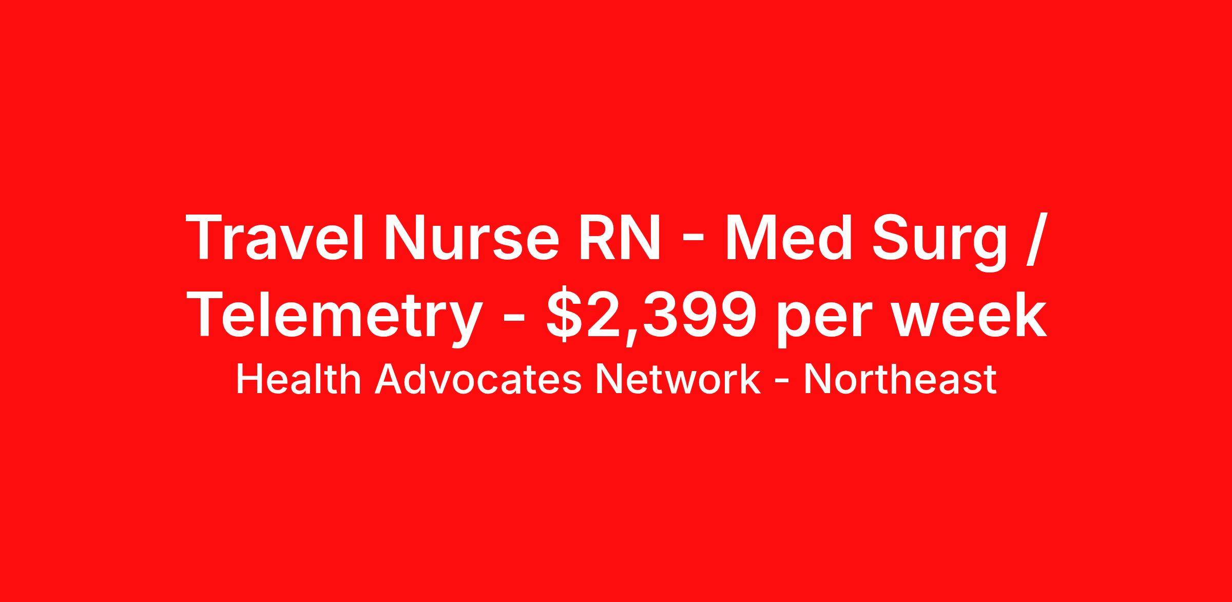 Health Advocates Network - Northeast is seeking a travel nurse RN Med Surg / Telemetry for a travel nursing job in Rochester, New York. Job Description & Requirements Specialty: Med Surg / Telemetry Discipline: RN Start Date: 04/03/2026 Duration: 12 weeks 36 hours per week Shift: 12 hours Employment Type: Travel Health Advocates Network is urgently hiring Med Surg Telemetry Registered Nurses (RNs) in the Rochester, NY area. Must have 2 years of Med Surg Telemetry experience. • Pay Rate: $2,399 weekly • Specialty: Med Surg Telemetry Registered Nurse (RN) • Shift: Rotating • 12 Week Contracts and more available! • Radius Rule: 50 mile radius applies Qualification and Requirements: • Authorized to work in the United States. • Graduate of an Accredited School of Nursing • 2 years of experience as a Med Surg Telemetry Registered Nurse (RN) • American Heart Association BLS • Telemetry Experience Required • An active, current (NY) state license or reciprocation if applicable Apply for this job now or to find out more about other opportunities with Health Advocates Network, Inc. reply to this posting, contact us at or call/text . We can provide you unparalleled access to exciting career opportunities. Benefits We Offer: Competitive pay rates, Referral Bonus, Medical, Dental, Vision and 401k. Travel reimbursement and per diem allowances, Employee discounts, educational opportunities, and more! Who We Are: Health Advocates Network matches highly skilled applicants to positions at the best healthcare companies on a temporary and temporary-to-hire basis. Our mission is to provide you with a rewarding job that is well-matched to your skills – helping you advance in your career. Our experience, combined with our client relationships, makes Health Advocates Network a great resource for your career. Health Advocates Network, Inc. is an equal-opportunity employer. All qualified applicants shall receive consideration for employment without regard to any legally protected basis protected by applicable federal or state law except where a bona fide occupational qualification applies. Refer a Registered Nurse for a $1000.00 bonus opportunity! HANStaff Northeast Job ID 381018. Pay package is based on 12 hour shifts and 36 hours per week (subject to confirmation) with tax-free stipend amount to be determined. Posted job title: RN - M/S Tele About Health Advocates Network - Northeast Health Advocates Network was founded on the basis of a shared aspiration, to improve the way healthcare staffing is done. We are a company established and led by nurses. Our flexible approach enables us to develop solutions customized to your specific needs. From short- and long-term travel contracts to local and per diem assignments and more, we are here to get you to your next adventure! By solving challenges, providing the best placements, and advocating for you, we stand to help you thrive and pave the path forward in your career. Benefits 401k retirement plan