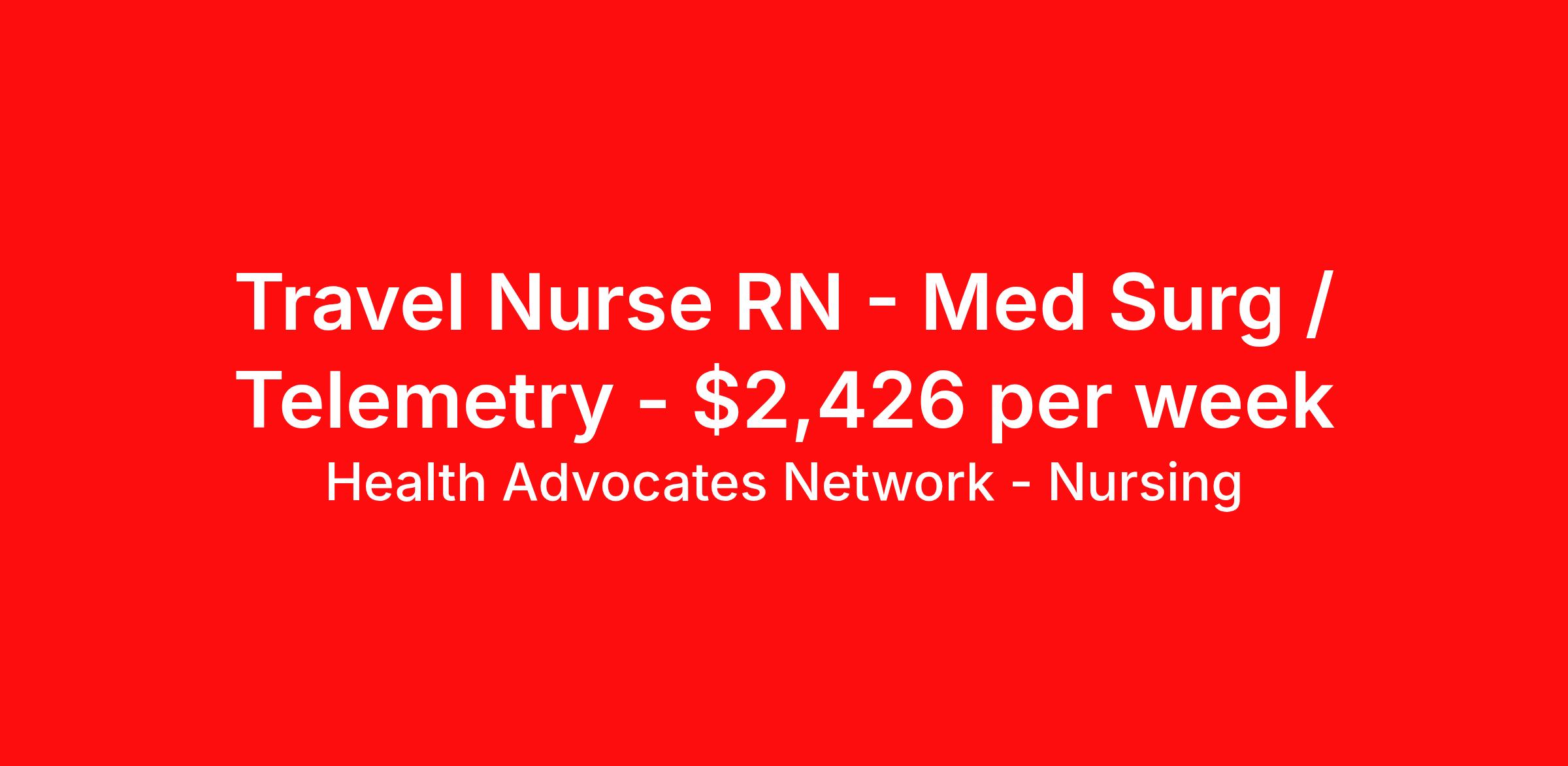 Health Advocates Network - Nursing is seeking a travel nurse RN Med Surg / Telemetry for a travel nursing job in Reno, Nevada. Job Description & Requirements Specialty: Med Surg / Telemetry Discipline: RN Start Date: 04/06/2026 Duration: 12 weeks 36 hours per week Shift: 12 hours, nights Employment Type: Travel RN – MS/Tele Registered Nurse - Health Advocates Network is urgently hiring MS/Tele RNs with at least 2 years of recent experience! IMMEDIATE STARTS! Travel packages up to $2426 weekly Shift: 12 hour DAY and NIGHT shifts available 13 week contracts available Specialty: MS/Tele Registered Nurse (RN) Requirements: Active NV State Registered Nurse License Valid BLS Graduate of an Accredited School of Nursing Additional certifications may be required Benefits We Offer: Competitive pay rates, Referral Bonus, Medical, Dental and Vision. Travel reimbursement and per diem allowances, Employee discounts, educational opportunities, and more! To apply for this job now or to find out more about other opportunities with Health Advocates Network, Inc. reply to this posting, contact us at or call/text XXX-XXX-XXXX. We can provide you unparalleled access to exciting career opportunities. Health Advocates Network, Inc . is an equal opportunity employer. All qualified applicants shall receive consideration for employment without regard to any legally protected basis protected by applicable federal or state law except where a bona fide occupational qualification applies. Refer a Registered Nurse for a $XXX.00 bonus opportunity! HANStaff Job ID 519263. Pay package is based on 12 hour shifts and 36 hours per week (subject to confirmation) with tax-free stipend amount to be determined. Posted job title: RN - M/S Tele About Health Advocates Network - Nursing Health Advocates Network was founded on the basis of a shared aspiration, to improve the way healthcare staffing is done. We are a company established and led by nurses. Our flexible approach enables us to develop solutions customized to your specific needs. From short- and long-term travel contracts to local and per diem assignments and more, we are here to get you to your next adventure! By solving challenges, providing the best placements, and advocating for you, we stand to help you thrive and pave the path forward in your career. Click on the videos below to learn more about our values!