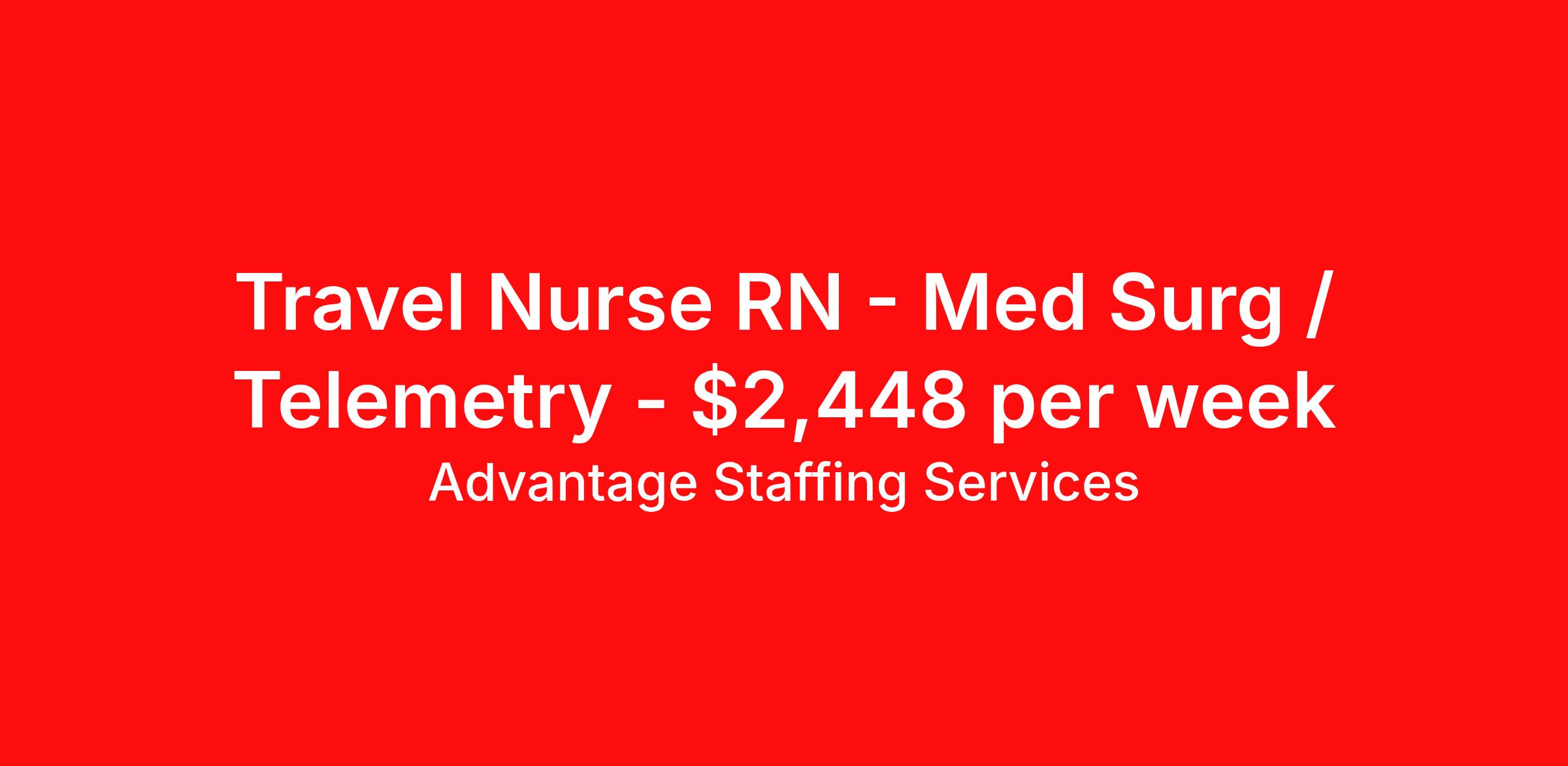 Advantage Staffing Services is seeking a travel nurse RN Med Surg / Telemetry for a travel nursing job in Boston, Massachusetts. Job Description & Requirements Specialty: Med Surg / Telemetry Discipline: RN Start Date: 04/06/2026 Duration: 13 weeks 36 hours per week Shift: 12 hours, rotating Employment Type: Travel No locals within 30 miles. Advantage Staffing Services Job ID 4832. Pay package is based on 12 hour shifts and 36 hours per week (subject to confirmation) with tax-free stipend amount to be determined. About Advantage Staffing Services At Advantage Staffing Services , we are a premier staffing agency specializing in healthcare talent solutions. With over 15 years of experience, we provide highly skilled professionals to healthcare facilities across the nation, focusing on nurses, allied health professionals, and other medical staff. Our headquarters is located in Arizona, and we proudly serve clients in a variety of healthcare settings, including hospitals, clinics, and long-term care facilities. What sets us apart? At Advantage Staffing Services, we prioritize both the professional growth of our staff and the satisfaction of our clients. We offer competitive pay, comprehensive benefits, and a supportive work environment. Whether you’re looking for temporary assignments or a long-term career opportunity, we provide personalized guidance to help you succeed. Our commitment to quality service, integrity, and teamwork ensures that our employees thrive in their roles and that our clients receive top-tier talent. Join us today and experience the difference of working with a company that truly values its people! Benefits Medical benefits Dental benefits Vision benefits Employee assistance programs Continuing Education