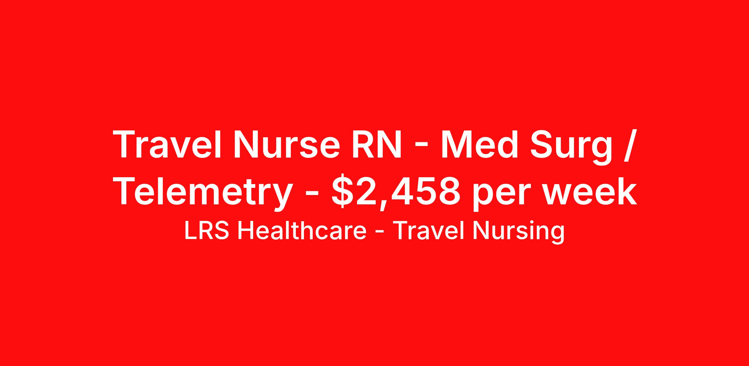 LRS Healthcare - Travel Nursing is seeking a travel nurse RN Med Surg / Telemetry for a travel nursing job in Anniston, Alabama. Job Description & Requirements Specialty: Med Surg / Telemetry Discipline: RN Duration: 13 weeks 48 hours per week Shift: 12 hours, nights Employment Type: Travel LRS Healthcare - Travel Nursing Job ID 031926-C. Pay package is based on 12 hour shifts and 48 hours per week (subject to confirmation) with tax-free stipend amount to be determined. About LRS Healthcare - Travel Nursing LRS Healthcare can lend a hand to take your career to new heights and places. As an industry leader in healthcare staffing, we work to connect you with jobs at top of the line facilities in the locations you’ve always wanted to live and visit. LRS is truly a full service medical staffing agency, so we take care of everything from housing and travel expenses to your itinerary, too. We handle it all because we want to be with you throughout your journey – not just your next placement. As a medical staffing agency that fosters long relationships with their employees, we’re determined to help amplify your personal and career growth through placement. We identify both temporary and permanent positions for candidates, and even some temp-to-perm positions that begin as 13-week programs. We have many positions available across the country, so let's discuss what would be a good fit for you! Benefits: Medical, Dental, and Vision Short-Term Disability Long-Term Disability Life Insurance 401(k) Certification & License Reimbursement Refer-a-friend Bonus Program Direct Deposit - Weekly 24-Hour Support Benefits Medical benefits Life insurance 401k retirement plan License and certification reimbursement Referral bonus Weekly pay