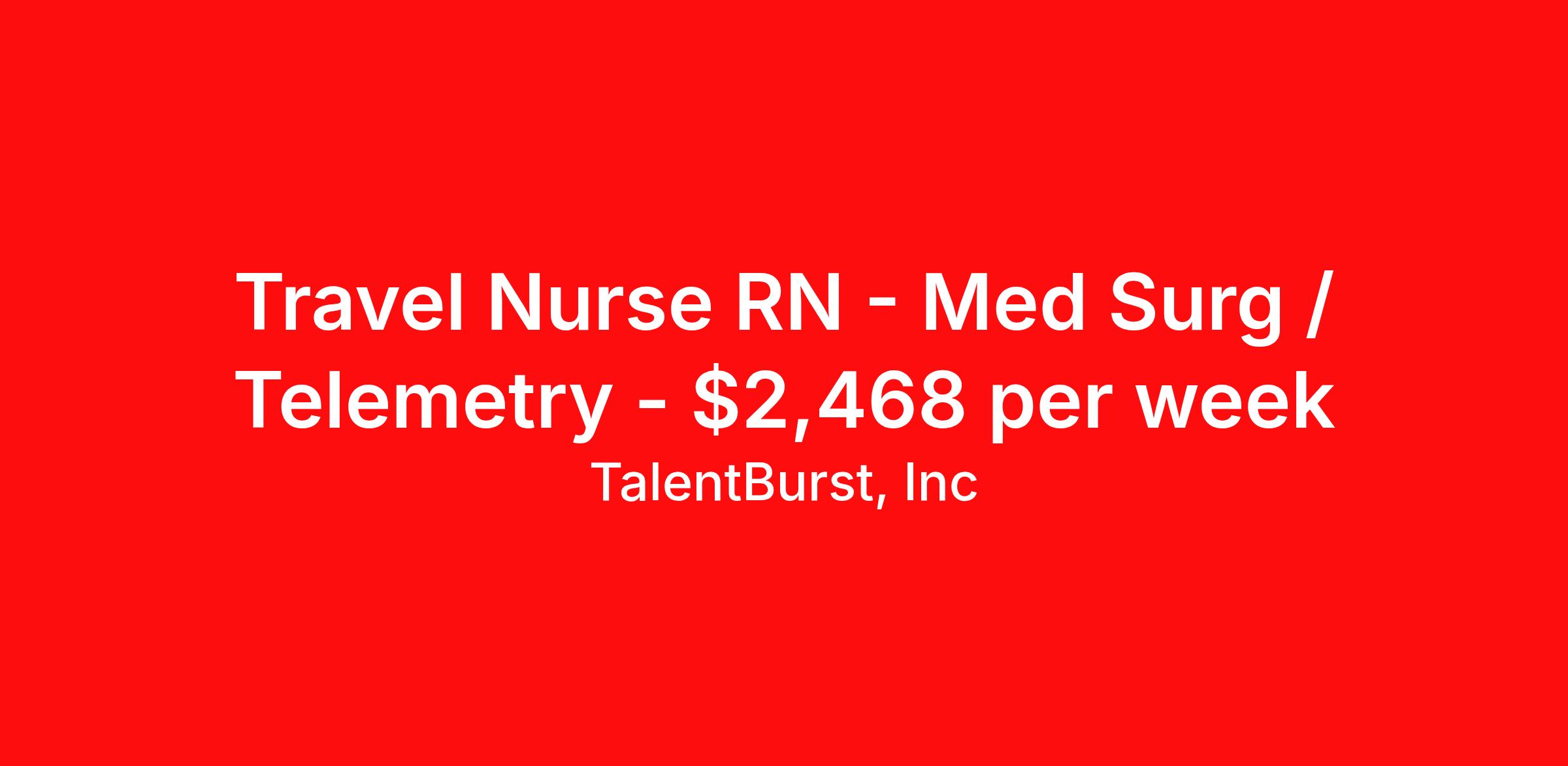TalentBurst, Inc is seeking a travel nurse RN Med Surg / Telemetry for a travel nursing job in Trenton, New Jersey. Job Description & Requirements Specialty: Med Surg / Telemetry Discipline: RN Duration: 13 weeks 36 hours per week Shift: 12 hours, days Employment Type: Travel Registered Nurse - MST Trenton, NJ Guaranteed Hour: 36 Time Type: 7:00am-7:30pm (7:00 AM - 7:30 PM) Unit Description This is for Med Surg/Tele Float Pool - Will float between RMC and Hopewell Campuses as needed Additional Information MST RN – Float Pool (ED Holds) We are seeking an experienced MST RN to join our Float Pool team! Floating required between RMC and Hopewell campuses, will go to any MST unit or ED Holds as needed. Position Details: Schedule: Every other weekend & every other holiday required Experience: Minimum 2 years of recent MST experience Certifications Required: ACLS, BLS, NIH License: Must have NJ or Compact RN license at the time of submission Scrub Color: Navy Blue EMR System: Cerner Vaccination Requirement: Flu vaccine required (no declinations accepted) Effective immediately, any RN who calls off a scheduled shift is required to make up the missed shift within the same week. Overtime to accommodate make-up shifts is not permitted. If the shift cannot be made up within the same week, the assignment end date will be extended to include the missed shift(s). JobDiva 26-02039 (M) About TalentBurst, Inc TalentBurst Health & Life Sciences is an established provider of healthcare workforce solutions, servicing healthcare facilities across the United States for over 15 years. As a Joint Commission Certified Agency, our commitment to quality, integrity, and exceptional service has made us a trusted name in the healthcare staffing landscape. Our mission is to bridge the gap between healthcare professionals seeking fulfilling opportunities and healthcare organizations striving to maintain their high standards of care. We are committed to providing top-notch healthcare professionals with access to facilities where they can focus on delivering exceptional patient care and thrive. Whether you're a nurse, allied health professional, or administrative personnel, we have the expertise to match your skills and aspirations with the perfect placement.