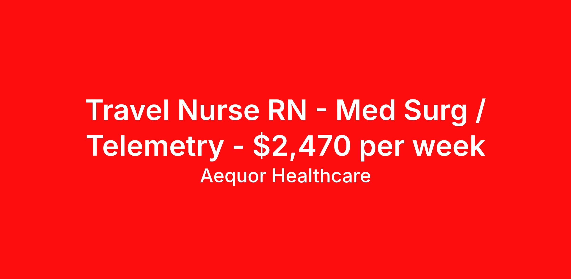 Aequor Healthcare is seeking a travel nurse RN Med Surg / Telemetry for a travel nursing job in Peoria, Illinois. Job Description & Requirements Specialty: Med Surg / Telemetry Discipline: RN Start Date: 05/18/2026 Duration: 13 weeks 36 hours per week Shift: 12 hours, nights Employment Type: Travel Carle Health Foundation Hospital MS Tele RN Shift: 3x12 Nights, 13 Weeks Location: Peoria, IL Start Date: 5/18 Weekly Gross: $2470 Hourly Taxable: $34.00 Weekly Stipend: $1246 Travel: $500 Required: 3 years exp, Level1 trauma exp, BLS/ACLS, IL RN License About Aequor Healthcare Aequor Travel Nursing is a premiere healthcare staffing agency that specializes in placing healthcare travelers in short term contracts throughout the US. Whether you’re a seasoned healthcare professional looking for your next great adventure or just starting out and looking for your first big opportunity, Aequor has the inside track on the top jobs available in today’s healthcare and clinical markets. At Aequor, our top priority is to be the best resource to help you connect with the perfect career opportunity and take the best care of you from the moment we first connect until your last shift is worked. We pride ourselves on always offering top industry competitive pay. We have positions for nationwide covering every single state and ranging from 4 weeks – 26 weeks. Benefits Weekly pay Holiday Pay 401k retirement plan Referral bonus Medical benefits Dental benefits Vision benefits