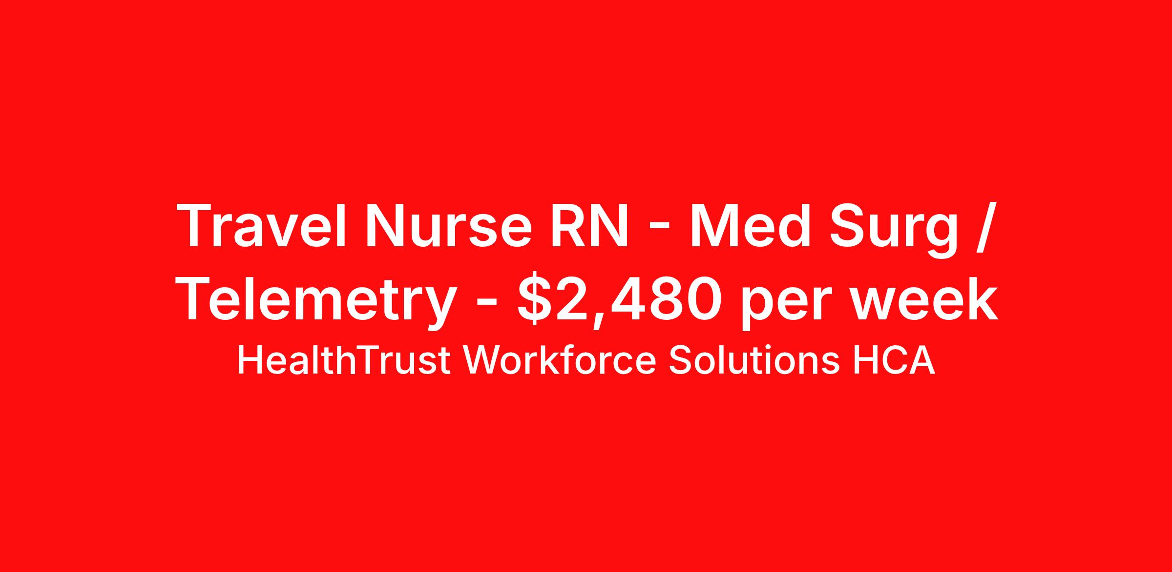 HealthTrust Workforce Solutions HCA is seeking a travel nurse RN Med Surg / Telemetry for a travel nursing job in Asheville, North Carolina. Job Description & Requirements Specialty: Med Surg / Telemetry Discipline: RN Start Date: 04/20/2026 Duration: 13 weeks 36 hours per week Shift: 12 hours, days, nights Employment Type: Travel About HealthTrust Workforce Solutions HCA At HealthTrust Workforce Solutions, healthcare is not just about the four walls of a facility but about the people who provide and receive care. Our focus is on empowering healthcare professionals to deliver exceptional patient experiences by providing them with the necessary skills, tools, and support. We partner with healthcare facilities nationwide to ensure that the right professionals are in the right roles. We prioritize our clinicians by giving them a voice and access to opportunities to fulfill their mission of improving lives by providing quality patient care. We are committed to our core values of Trust, Innovation, Adaptability, Courage, and Accountability. We are dedicated to positively impacting the healthcare industry by providing first-priority access to more than 200,000 jobs nationwide to our healthcare professionals. Join us and be part of the HealthTrust family, where you can make a difference every day. We embrace our changing environment, and we maintain a culture that has a rich tradition of transforming itself to meet the challenges of the future. MISSION STATEMENT While putting great people in the right roles is essential, our mission is far greater. We want our clinicians to be part of the HealthTrust family, where healthcare professionals have a voice and are empowered with the right tools and opportunities to fulfill their personal mission of improving lives. Plus, as a preferred partner to thousands of top-performing hospitals, we provide our healthcare professionals with first-priority access to more than 200,000 jobs nationwide. Benefits Dental benefits Vision benefits Referral bonus Continuing Education Life insurance