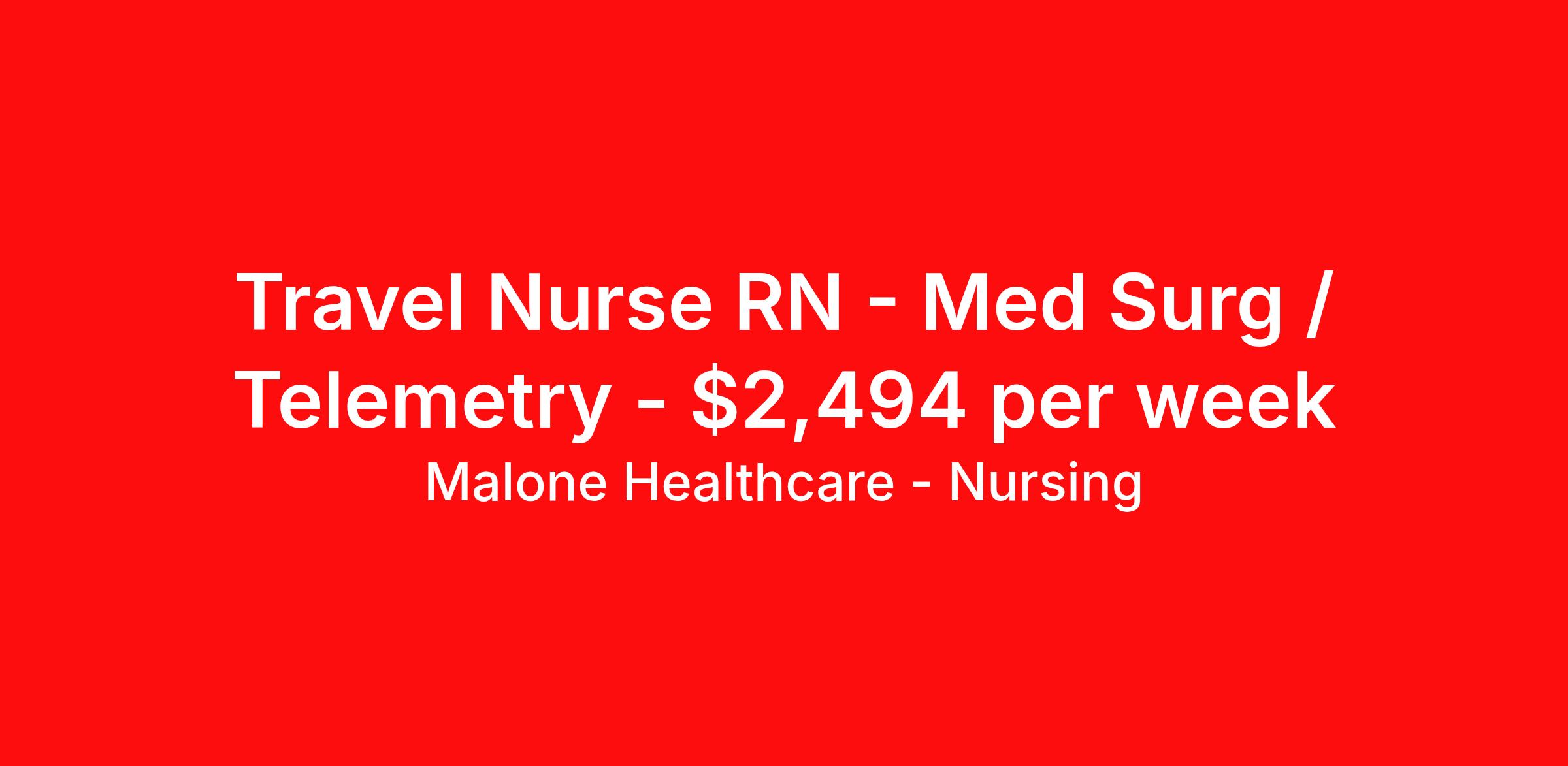 Malone Healthcare - Nursing is seeking a travel nurse RN Med Surg / Telemetry for a travel nursing job in Florence, South Carolina. Job Description & Requirements Specialty: Med Surg / Telemetry Discipline: RN Start Date: 03/29/2026 Duration: 13 weeks 48 hours per week Shift: 12 hours, days, flexible Employment Type: Travel About Malone Healthcare - Nursing With a commitment to providing a higher standard of service and experience in patient care, Malone Healthcare places expert nurses and allied health professionals in rewarding careers throughout the United States. As a leading healthcare staffing agency, Malone’s focus on compliance and integrity translates to a seamless experience for our team members and partner facilities. When you work with Malone Healthcare, you can rely on over 50 years of proven experience placing exceptional professionals in quality healthcare settings. Benefits Weekly pay Holiday Pay Guaranteed Hours Continuing Education 401k retirement plan Pet insurance Referral bonus Medical benefits Dental benefits Vision benefits License and certification reimbursement Life insurance