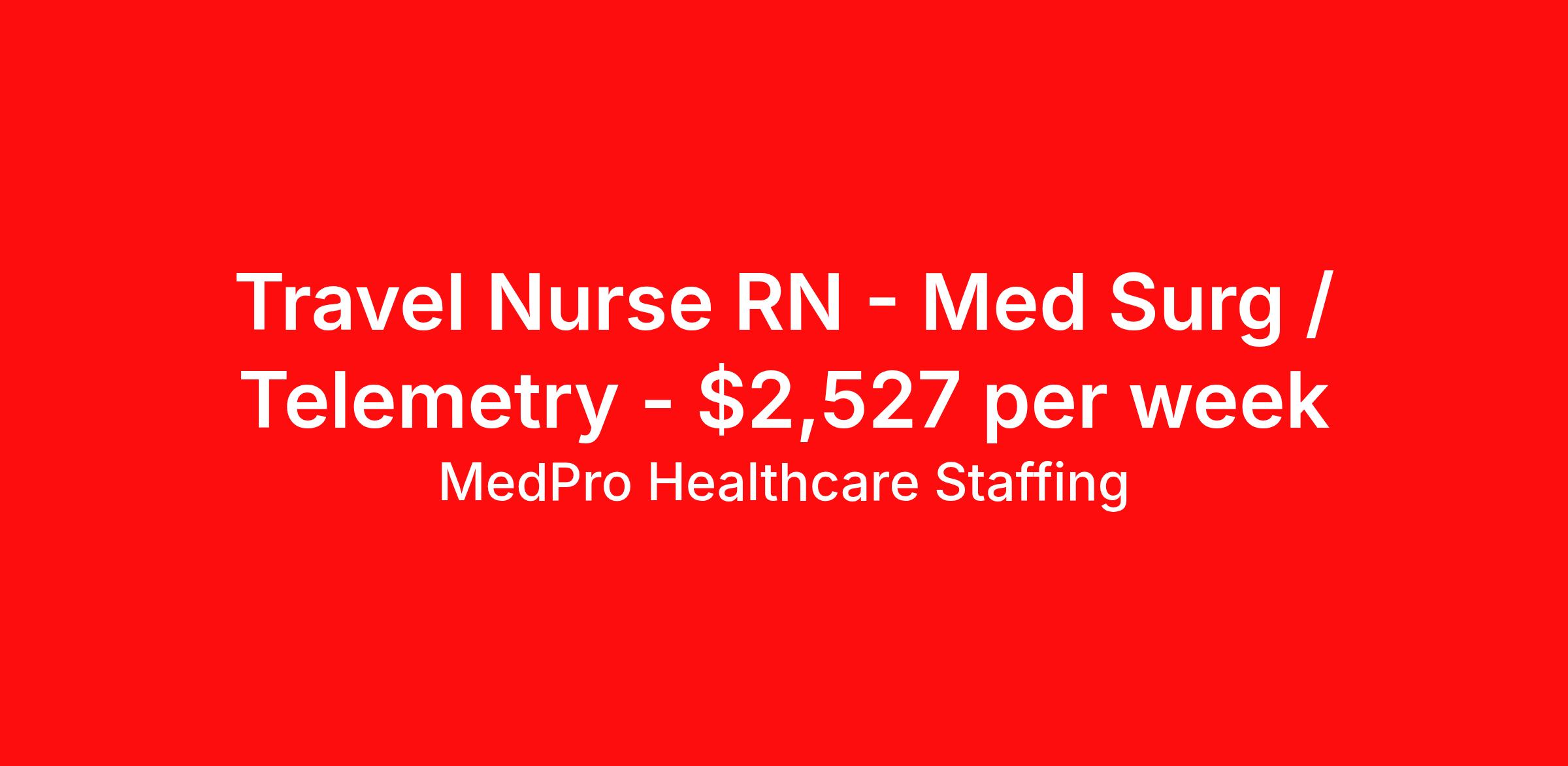 MedPro Healthcare Staffing is seeking a travel nurse RN Med Surg / Telemetry for a travel nursing job in Cleveland, Ohio. Job Description & Requirements Specialty: Med Surg / Telemetry Discipline: RN Start Date: 04/17/2026 Duration: 13 weeks 36 hours per week Shift: 12 hours, days Employment Type: Travel MedPro Healthcare Staffing , a Joint Commission-certified staffing agency, is seeking a quality Med-Surg registered nurse (RN) for a travel assignment with one of our top healthcare clients. Requirements Active RN License Degree from accredited nursing program BLS Certifications Eighteen months of recent experience in an Acute Care Med/Surg setting Other requirements to be determined by our client facility Benefits Weekly pay and direct deposit Full coverage of all credentialing fees Private housing or housing allowance Group Health insurance for you and your family Company-paid life and disability insurance Travel reimbursement 401(k) matching Unlimited Referral Bonuses up to $1,000 Duties Responsibilities Med-Surg Nurses (RN) provide care for primarily adult patients before and after surgical procedures; they also attend to those who are being treated with pharmaceuticals to manage illness. Due to the broad range of medical conditions Med/Surg Nurses will encounter, they must be well-versed in a large variety of health conditions. Complete assignments made by physicians. Provide routine treatment and post-surgical care. Assess changes in patient's health status and perform various treatments. Administer medication. Meticulous documentation as to medication and treatment administration to ensure continuity of care between nursing staff, physicians and other treatment team members. About Agency MedPro Healthcare Staffing is a Joint Commission certified provider of contract staffing services. Since 1983, we have placed nursing and allied travelers in top healthcare facilities nationwide. Join us today for your very own MedPro Experience®. If qualified and interested, please call for immediate consideration. MedPro Staffing is an Equal Opportunity Employer. All applicants will be considered for employment without attention to race, color, religion, national origin, age, sex, disability, marital status or veteran status. Key Words: Registered Nurse, RN, Medical-Surgical, Travel Nurse, Contract Nurse, Agency Nurse, Agency RN, RN-MS, RN- Medical Surgical, Travel RN, Contract, Nursing, RN Med-Surg, Travel Nursing *Weekly payment estimates are intended for informational purposes only and include a gross estimate of hourly wages and reimbursements for meal, incidental, and housing expenses. Your recruiter will confirm your eligibility and provide additional details. MedPro Job ID a0Fcx00000GCNCXEA5. Pay package is based on 12 hour shifts and 36 hours per week (subject to confirmation) with tax-free stipend amount to be determined. Posted job title: Med-Surg/Telemetry Registered Nurse Nursing: Med Surg/Tele. About MedPro Healthcare Staffing At MedPro Healthcare Staffing , we believe no one cares more for caregivers than we do. Our mission is simple: you focus on your patients, and we’ll take care of the rest. As a Joint Commission-certified leader in temporary and contract healthcare staffing since 1983, MedPro has proudly connected nursing and allied travelers with top healthcare facilities across the nation. With thousands of job opportunities available nationwide, we make it easy to find assignments that align with your goals and lifestyle. Our on-staff clinical support team—alongside a compassionate group of experienced recruiters—provides hands-on guidance every step of the way. From Day 1 medical benefits and a 401(k) plan to personalized career support, we’re committed to ensuring every professional we serve feels valued, cared for, and empowered to succeed. Guided by a CEO who is a Registered Nurse, MedPro is built on a foundation of clinical insight and genuine compassion for the caregiving community. Through The MedPro Experience® , we deliver travel assignments that are rewarding, memorable, and designed to help you DREAM big, EXPLORE often, and ACHIEVE greatness. Benefits Day 1 medical, dental, and vision benefits for you and your family Weekly pay and direct deposit Unlimited Referral Bonuses starting at $500 On Staff Clinical Support Team Access to nationwide travel assignments MPX Mobile app -24/7 real-time access to jobs, credentials, assignment details, and more Full coverage of all credentialing fees Private housing or housing allowance Tax Free Per Diems, Housing Stipends and Travel Reimbursements Company-paid life and disability insurance Travel reimbursement 401(k) matching Benefits Weekly pay Referral bonus Employee assistance programs