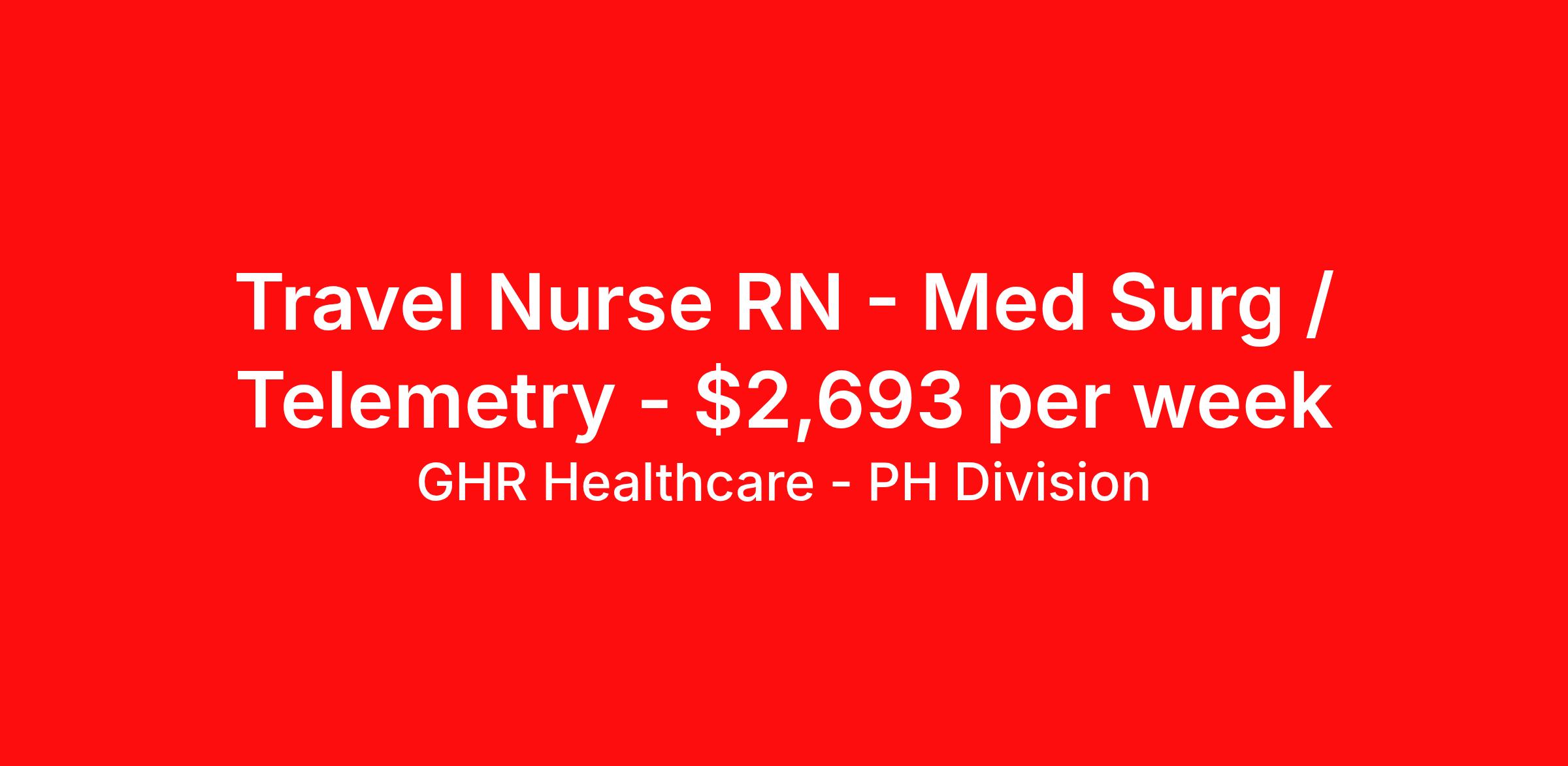GHR Healthcare - PH Division is seeking a travel nurse RN Med Surg / Telemetry for a travel nursing job in Cambridge, Massachusetts. Job Description & Requirements Specialty: Med Surg / Telemetry Discipline: RN Start Date: ASAP Duration: 13 weeks 36 hours per week Shift: 12 hours Employment Type: Travel Travel Med/Surg Telemetry Registered Nurse (RN) – Cambridge, MA Advance your nursing career as a Travel Med/Surg Telemetry Registered Nurse (RN) in Cambridge, Massachusetts! This 8-week travel nursing contract places you in a top healthcare facility, offering hands-on experience in a vibrant city known for its world-class universities and rich cultural heritage. Join our healthcare team and make a real impact on patient care in the heart of Massachusetts. Estimated Weekly Salary Estimated weekly salary: $2,310 - $2,470 Med/Surg Telemetry RN Job Details Location: Cambridge, MA 02138 (Massachusetts healthcare jobs) Facility Setting: Nursing Float Pool – Medical-Surgical (Telemetry) Contract Length: 8 weeks (January 5, 2026 – February 28, 2026) Shift: 12-hour nights (7:00 PM – 7:30 AM) Hours: 36 hours per week (72 hours biweekly guaranteed) Employment Type: Travel RN contract Registered Nurse Qualifications Active Registered Nurse (RN) license (Massachusetts RN license preferred) Minimum 2 years of recent Med/Surg Telemetry nursing experience Current ACLS and BLS certifications required Proficiency with EPIC EMR system Ability to work 12-hour night shifts and float to multiple hospital units Strong clinical assessment, communication, and patient care skills Travel nurses only – local Massachusetts candidates not eligible Med/Surg Telemetry RN Responsibilities Provide high-quality nursing care to patients in the Medical-Surgical Telemetry unit Monitor, interpret, and respond to cardiac rhythms and changes in patient condition Collaborate with interdisciplinary healthcare teams to develop and implement patient care plans Accurately document patient assessments, interventions, and outcomes in EPIC EMR Float to various units within the hospital as needed to provide clinical support Deliver compassionate education and support to patients and their families Take the next step in your travel nursing career with this rewarding Med/Surg Telemetry RN job in Cambridge, MA. Apply now to join our dedicated healthcare team and experience the best of Massachusetts nursing opportunities! Benefits 401K with Matching, Healthcare, Dental and Vision About GHR With over 30 years of healthcare staffing experience, GHR Healthcare is your trusted partner in finding the perfect contract or permanent role in the healthcare industry. Our specialized teams have placed thousands of healthcare professionals nationwide. You will have a dedicated recruiter, providing access to new opportunities and guidance every step of the way. Whatever your career goals, GHR Healthcare is here to support you and find your perfect fit. Get to know us:www.ghrhealthcare.com Equal Opportunity We are an equal opportunity employer and value diversity across our organization. We do not discriminate on the basis of race, religion, color, national origin, gender, sexual orientation, age, marital status, veteran status, or disability status. Planet Healthcare Job ID 434000. Pay package is based on 12 hour shifts and 36 hours per week (subject to confirmation) with tax-free stipend amount to be determined. Posted job title: Med/Surg Tele About GHR Healthcare - PH Division For over 30 years, GHR Healthcare has been the bridge between healthcare professionals and the facilities that need them nationwide. We're committed to uncovering your ideal fit, supported by GHR's dedication to competitive compensation, transparent communication, and a devoted team that genuinely cares about your career journey. You can trust us to stand by your side as your advocate, confidante, and partner in advancing your career. At GHR, care and consideration are at the heart of everything we do. Visit ghrhealthcare.com to learn more.