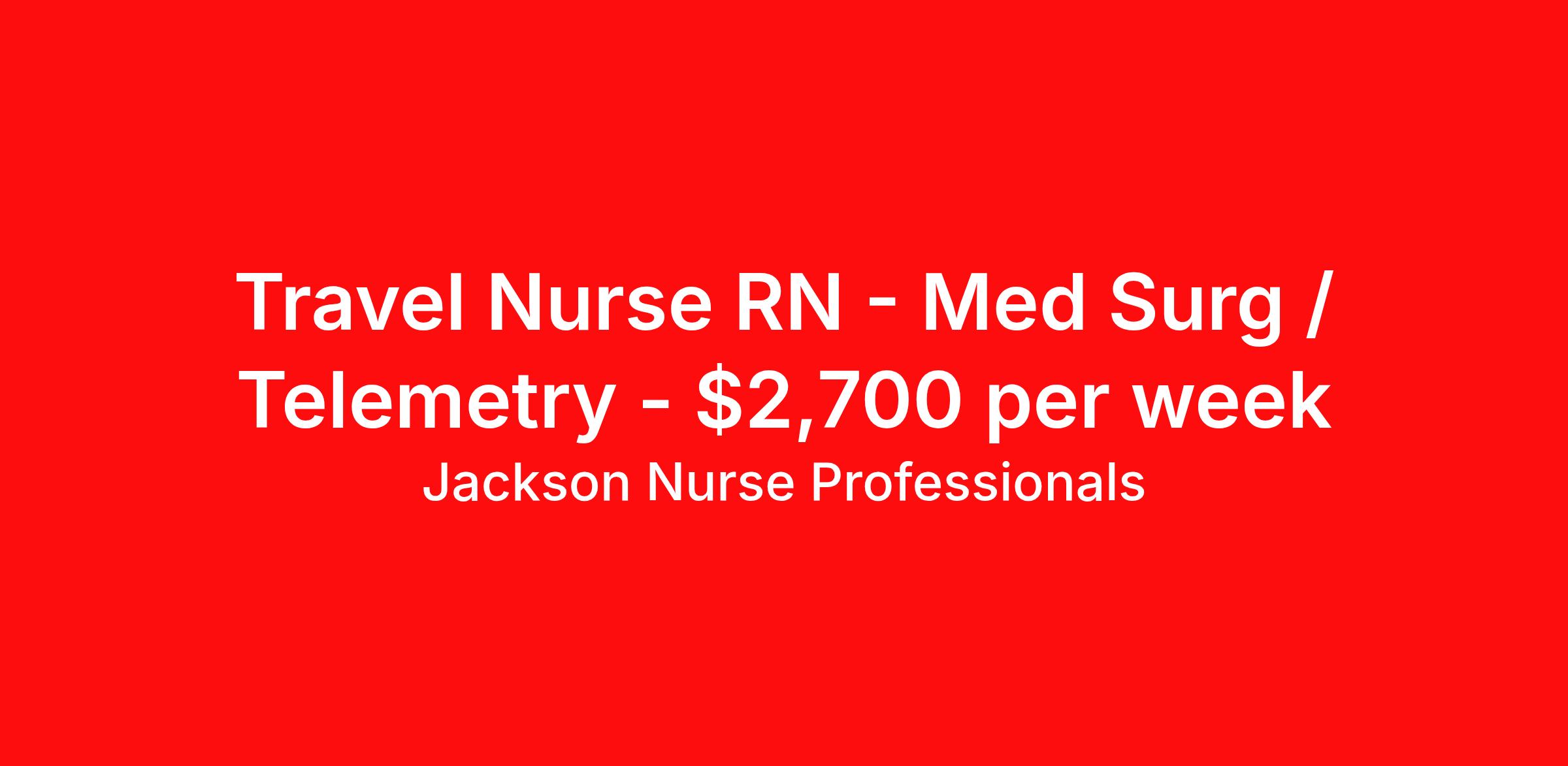 Jackson Nurse Professionals is seeking a travel nurse RN Med Surg / Telemetry for a travel nursing job in Tuscaloosa, Alabama. Job Description & Requirements Specialty: Med Surg / Telemetry Discipline: RN Start Date: 04/13/2026 Duration: 13 weeks 48 hours per week Shift: 12 hours, days, nights Employment Type: Travel About Jackson Nurse Professionals Filling critical needs in patient care, Jackson Nurse Professionals delivers cost-effective travel nurse staffing solutions to over 500 hospitals, outpatient clinics, and home health clients nationwide. Awarded Best of Staffing - Talent and Client 2024, and rated as a Top Workplace 2023 by the Orlando Sentinel, Jackson Nurse Professionals goes the extra mile to provide travel nurses the career they deserve, while providing clients with a large range of highly skilled nurses to fill short, long-term, and temporary assignments. As a member of Jackson Healthcare’s family of award-winning staffing companies, we’re part of a growing community that’s impacting 10 million patients nationwide. Join our mission to improve the delivery of patient care, and the lives of everyone we touch.