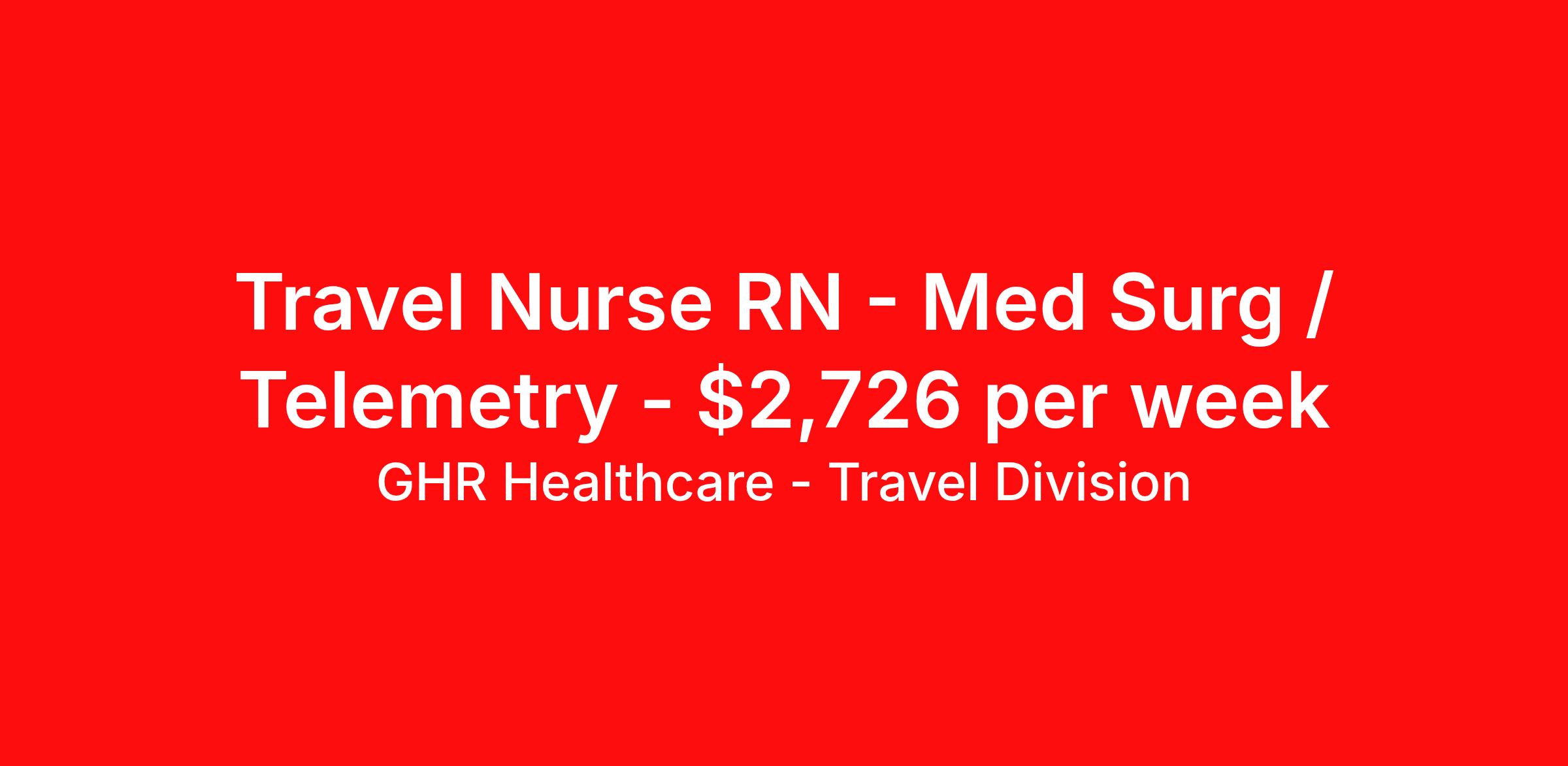 GHR Healthcare - Travel Division is seeking a travel nurse RN Med Surg / Telemetry for a travel nursing job in Burlington, Massachusetts. Job Description & Requirements Specialty: Med Surg / Telemetry Discipline: RN Start Date: 04/13/2026 Duration: 13 weeks 36 hours per week Shift: 12 hours, nights Employment Type: Travel About GHR Healthcare - Travel Division For over 30 years, GHR Healthcare has been the bridge between healthcare professionals and the facilities that need them nationwide. We're committed to uncovering your ideal fit, supported by GHR's dedication to competitive compensation, transparent communication, and a devoted team that genuinely cares about your career journey. You can trust us to stand by your side as your advocate, confidante, and partner in advancing your career. At GHR, care and consideration are at the heart of everything we do. Visit ghrhealthcare.com to learn more.