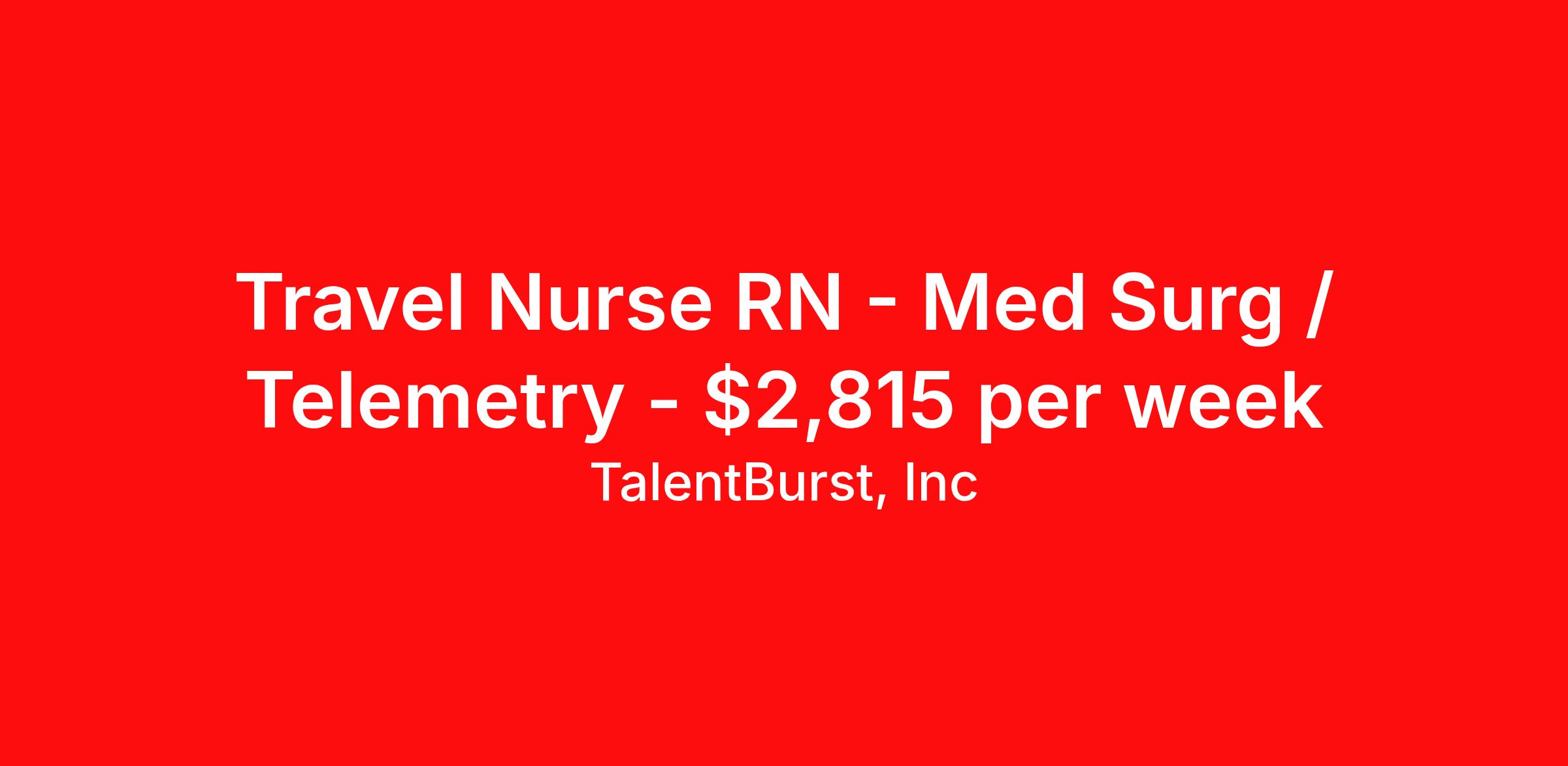 TalentBurst, Inc is seeking a travel nurse RN Med Surg / Telemetry for a travel nursing job in Methuen, Massachusetts. Job Description & Requirements Specialty: Med Surg / Telemetry Discipline: RN Start Date: 04/13/2026 Duration: 14 weeks 36 hours per week Shift: 12 hours, nights Employment Type: Travel Facility: Merrimack Health Job Title: Registered Nurse - MedSurg / Telemetry Orientation dates: 03/11 Location: Methuen, MA 12hr NIGHT About TalentBurst, Inc TalentBurst Health & Life Sciences is an established provider of healthcare workforce solutions, servicing healthcare facilities across the United States for over 15 years. As a Joint Commission Certified Agency, our commitment to quality, integrity, and exceptional service has made us a trusted name in the healthcare staffing landscape. Our mission is to bridge the gap between healthcare professionals seeking fulfilling opportunities and healthcare organizations striving to maintain their high standards of care. We are committed to providing top-notch healthcare professionals with access to facilities where they can focus on delivering exceptional patient care and thrive. Whether you're a nurse, allied health professional, or administrative personnel, we have the expertise to match your skills and aspirations with the perfect placement.