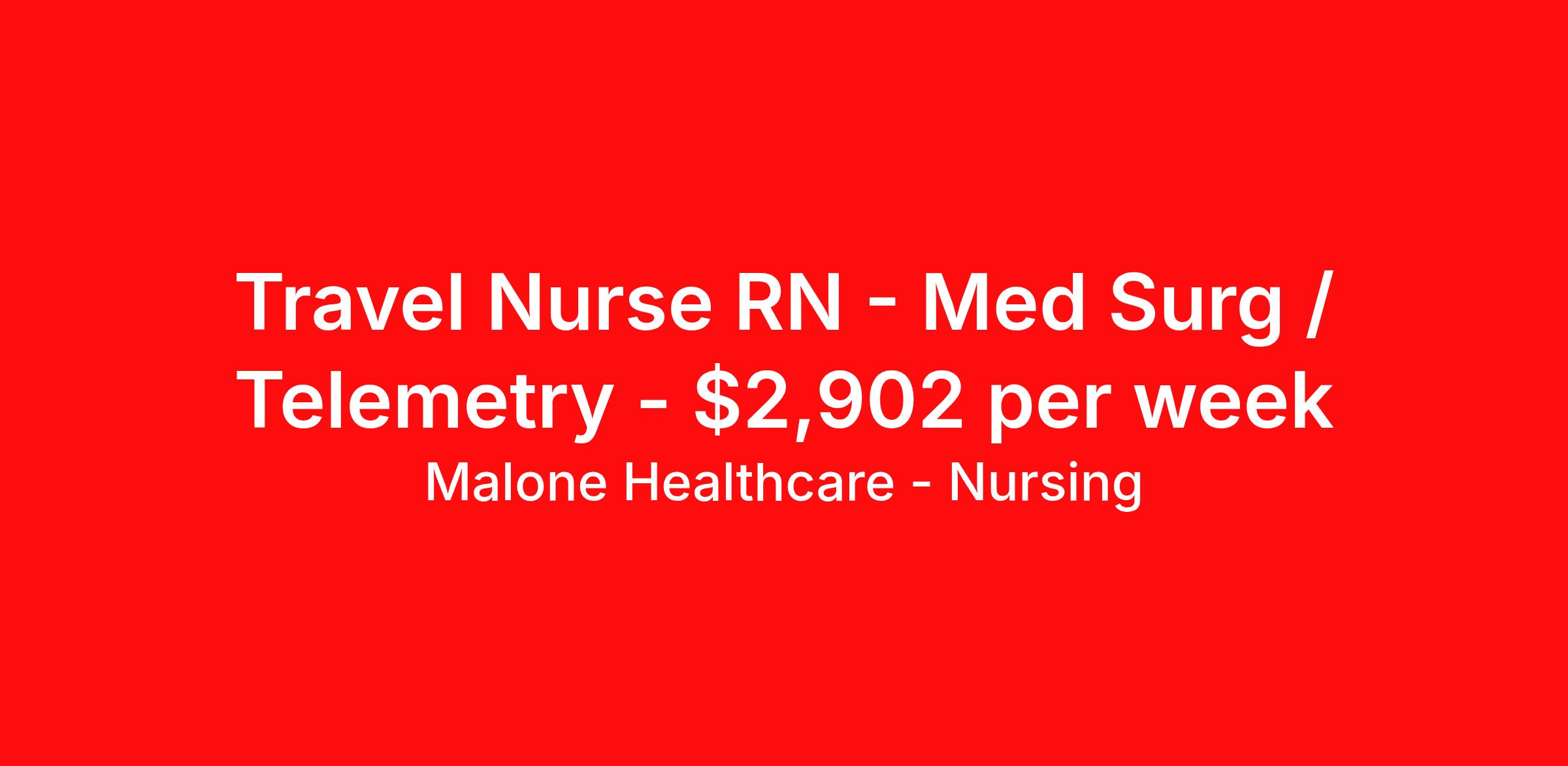 Malone Healthcare - Nursing is seeking a travel nurse RN Med Surg / Telemetry for a travel nursing job in Chesapeake, Virginia. Job Description & Requirements Specialty: Med Surg / Telemetry Discipline: RN Start Date: 03/26/2026 Duration: 13 weeks 48 hours per week Shift: 12 hours, days, flexible Employment Type: Travel About Malone Healthcare - Nursing With a commitment to providing a higher standard of service and experience in patient care, Malone Healthcare places expert nurses and allied health professionals in rewarding careers throughout the United States. As a leading healthcare staffing agency, Malone’s focus on compliance and integrity translates to a seamless experience for our team members and partner facilities. When you work with Malone Healthcare, you can rely on over 50 years of proven experience placing exceptional professionals in quality healthcare settings. Benefits Weekly pay Holiday Pay Guaranteed Hours Continuing Education 401k retirement plan Pet insurance Referral bonus Medical benefits Dental benefits Vision benefits License and certification reimbursement Life insurance
