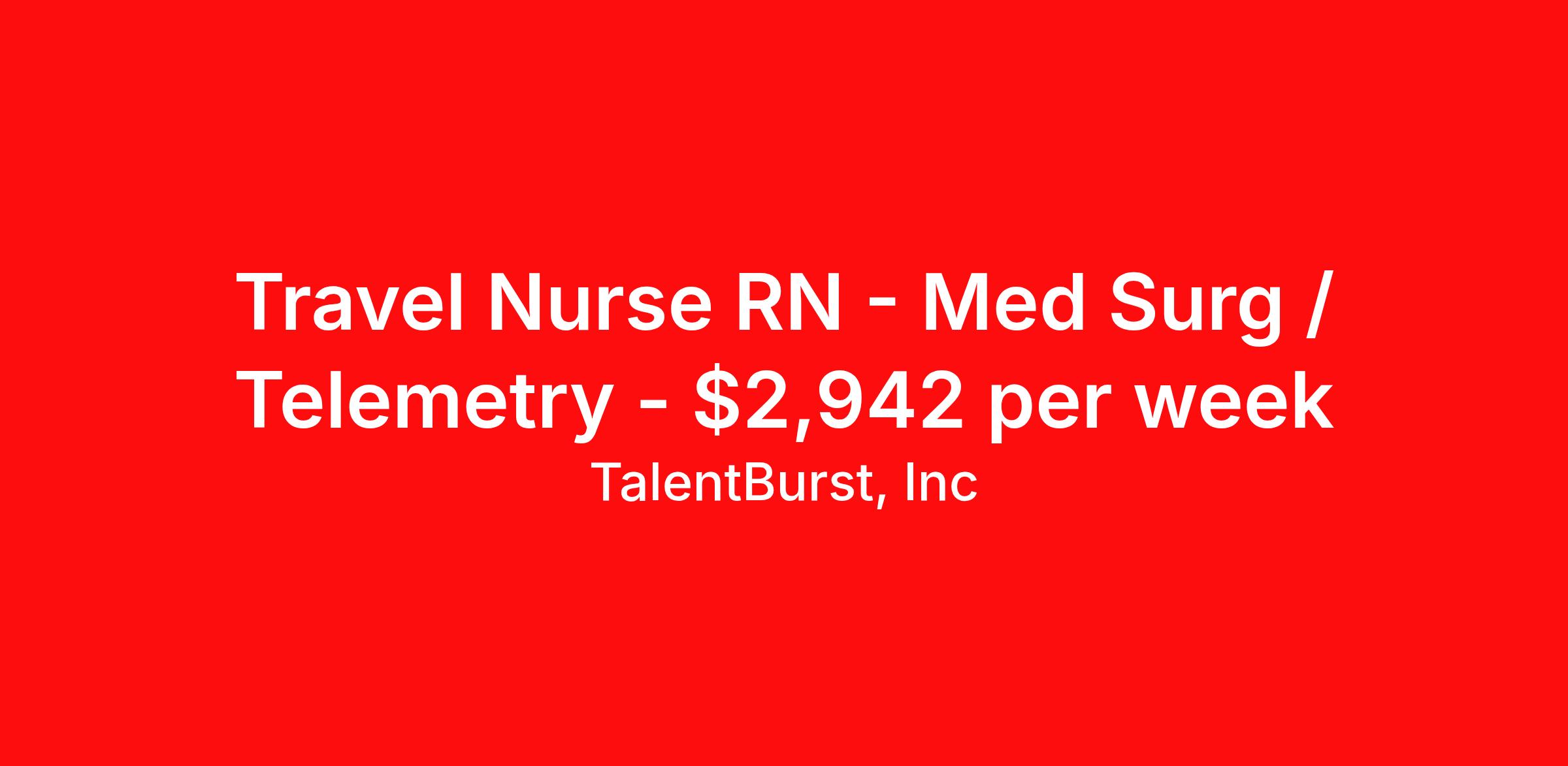 TalentBurst, Inc is seeking a travel nurse RN Med Surg / Telemetry for a travel nursing job in Burlington, Massachusetts. Job Description & Requirements Specialty: Med Surg / Telemetry Discipline: RN Start Date: ASAP Duration: 8 weeks 36 hours per week Shift: 12 hours, nights Employment Type: Travel Facility: Lahey Hospital and Medical Center 03/09/26 to 05/02/26 8 Weeks 36 Hours/week 12H Night 07:00 PM - 07:30 AM Position Description: Epic experience required. Day one pass/fail testing will be administered. Relias practice tests will be available via Relias. Every other weekend will be required. (Weekends for days - Sat and Sun, weekends for nights will be Fri, Sat, Sun). BLS-AHA required. ACLS-AHA, NIHSS preferred. Ratios will be between 1:3-5 and will be expected to float to ED holds, inpatient holds, PACU and other boarding units. Weekly start dates (Mondays). Floating occurs in 4 hour blocks while on shift - while floating every 4 hours is rare, it could happen. Level 1 trauma experience is preferred. If no prior travel, level 1 trauma will be required. Must be separated from BILH for a min of 6 months to be considered (perm, per diem, contract). Our interview services team will CALL for IVS review prior to sending to manager. About TalentBurst, Inc TalentBurst Health & Life Sciences is an established provider of healthcare workforce solutions, servicing healthcare facilities across the United States for over 15 years. As a Joint Commission Certified Agency, our commitment to quality, integrity, and exceptional service has made us a trusted name in the healthcare staffing landscape. Our mission is to bridge the gap between healthcare professionals seeking fulfilling opportunities and healthcare organizations striving to maintain their high standards of care. We are committed to providing top-notch healthcare professionals with access to facilities where they can focus on delivering exceptional patient care and thrive. Whether you're a nurse, allied health professional, or administrative personnel, we have the expertise to match your skills and aspirations with the perfect placement.