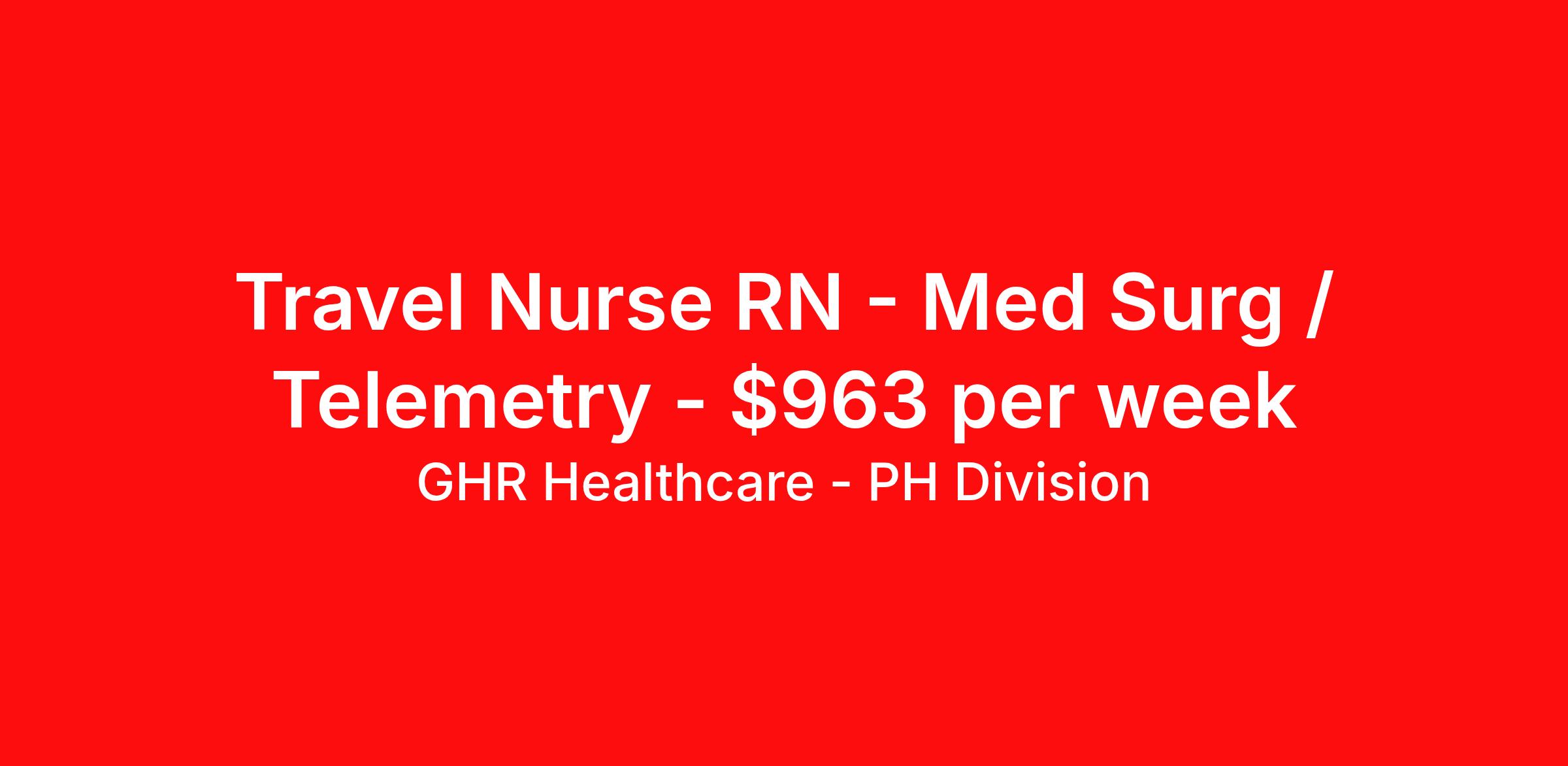 GHR Healthcare - PH Division is seeking a travel nurse RN Med Surg / Telemetry for a travel nursing job in Staten Island, New York. Job Description & Requirements Specialty: Med Surg / Telemetry Discipline: RN Start Date: 04/07/2026 Duration: 13 weeks 12 hours per week Shift: 12 hours Employment Type: Travel Registered Nurse (RN) – Med/Surg Telemetry (PRN) in Staten Island, NY: Flexible PRN nursing job supporting cardiac telemetry care. Registered Nurse (RN) – Med/Surg Tele (PRN) | Med/Surg Telemetry Nurse | Staten Island, NY Join our dedicated healthcare team as a Med/Surg Tele Registered Nurse in Staten Island, New York (ZIP code 10310). This PRN nursing opportunity offers the chance to provide high-quality medical-surgical and telemetry care in a supportive hospital environment. Ideal for experienced RNs and telemetry nurses seeking flexible PRN shifts in New York nursing jobs. Job Details Weekly Estimated Pay: $805 - $895 (estimated) Location: Staten Island, NY 10310 — Staten Island healthcare / New York nursing jobs Employment Type: PRN (as needed) Setting: Medical-Surgical Telemetry (Med/Surg Telemetry) Shift: 12-hour days Shifts per Week: 1 (flexible PRN schedule) Duration: 52 weeks Start Date: April 7, 2026 Qualifications / Job Requirements Minimum 1 year of recent experience in a Med/Surg Telemetry setting or similar telemetry unit Active Registered Nurse (RN) license in the state of New York Basic Life Support (BLS) certification required Strong clinical assessment, ECG interpretation, and communication skills Ability to work independently and collaboratively within a multidisciplinary care team Key Responsibilities Provide direct patient care on a medical-surgical telemetry unit as a bedside RN Monitor, interpret, and respond to cardiac rhythms using telemetry and ECG monitoring Administer medications and treatments safely and document therapy in the electronic health record (EHR) Collaborate with physicians, advanced practice providers, and allied health staff to optimize patient outcomes Accurately document patient assessments, interventions, and progress notes Educate patients and families on care plans, condition management, and discharge instructions Why join us: Work in a diverse Staten Island community with easy access to Manhattan, scenic parks, and waterfront views while advancing your telemetry nursing skills. This is a great opportunity for RNs focused on medical-surgical and cardiac telemetry care. Apply now to be considered for this PRN Registered Nurse (RN) — Med/Surg Telemetry position in Staten Island, NY. Join our healthcare team today and continue building your career in New York nursing jobs. Benefits 401K with Matching, Healthcare, Dental and Vision Equal Opportunity We are an equal opportunity employer and value diversity across our organization. We do not discriminate on the basis of race, religion, color, national origin, gender, sexual orientation, age, marital status, veteran status, or disability status. Planet Healthcare Job ID 468451. Pay package is based on 12 hour shifts and 12 hours per week (subject to confirmation) with tax-free stipend amount to be determined. Posted job title: Med/Surg Tele About GHR Healthcare - PH Division For over 30 years, GHR Healthcare has been the bridge between healthcare professionals and the facilities that need them nationwide. We're committed to uncovering your ideal fit, supported by GHR's dedication to competitive compensation, transparent communication, and a devoted team that genuinely cares about your career journey. You can trust us to stand by your side as your advocate, confidante, and partner in advancing your career. At GHR, care and consideration are at the heart of everything we do. Visit ghrhealthcare.com to learn more.
