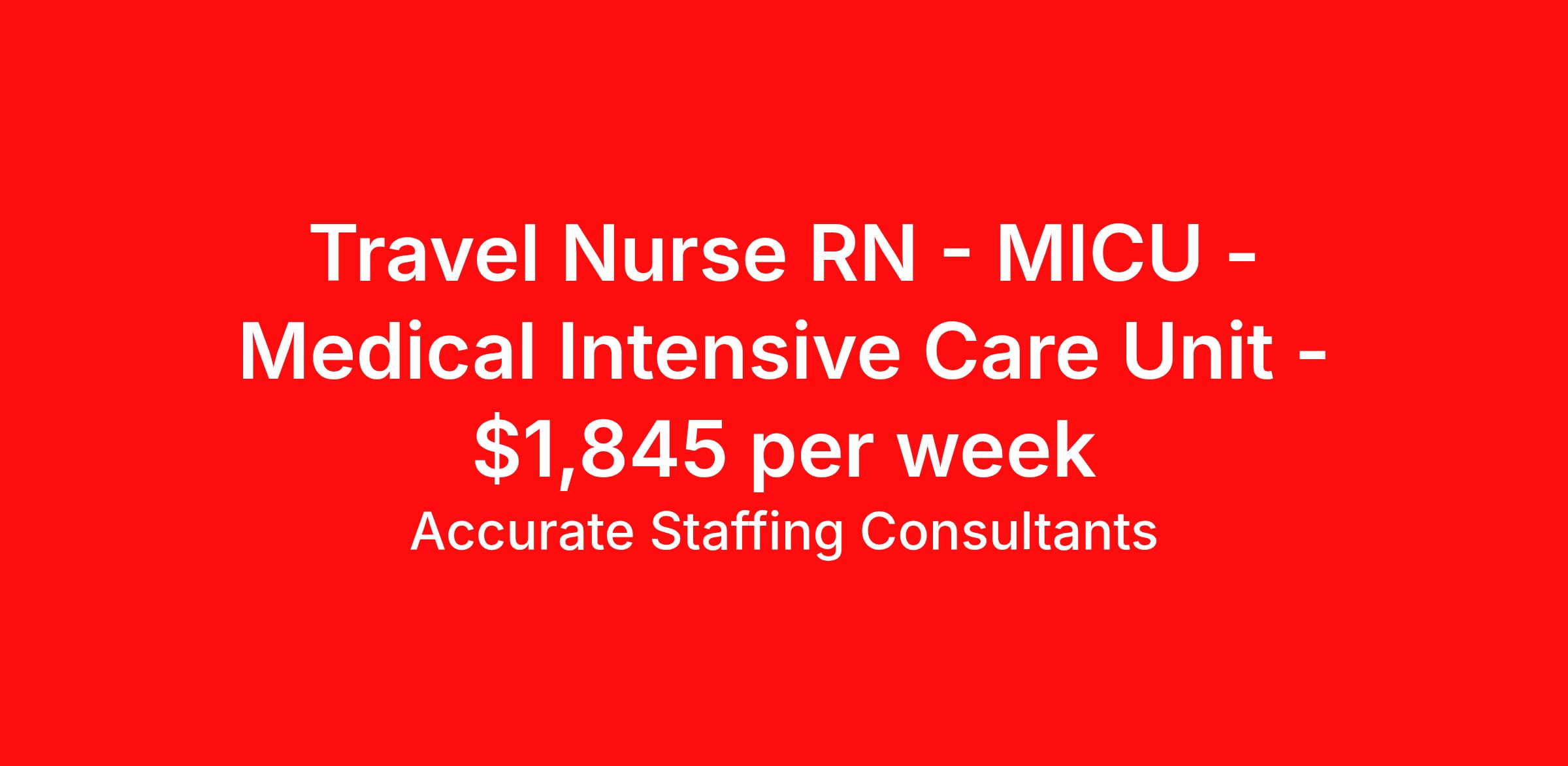 Accurate Staffing Consultants is seeking a travel nurse RN MICU - Medical Intensive Care Unit for a travel nursing job in Monroe, North Carolina. Job Description & Requirements Specialty: MICU - Medical Intensive Care Unit Discipline: RN Start Date: 03/23/2026 Duration: 12 weeks 36 hours per week Shift: 12 hours, nights Employment Type: Travel AccurateStaffing Job ID 4433. Pay package is based on 12 hour shifts and 36 hours per week (subject to confirmation) with tax-free stipend amount to be determined. Posted job title: RN - Medical Intensive Care Unit
