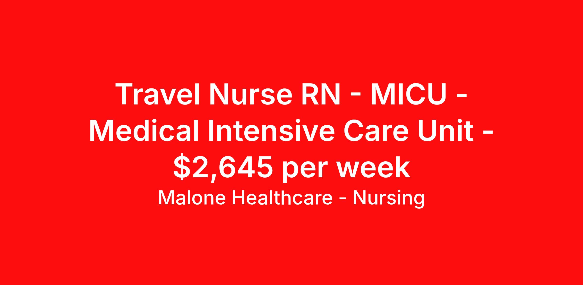 Malone Healthcare - Nursing is seeking a travel nurse RN MICU - Medical Intensive Care Unit for a travel nursing job in Cleveland, Ohio. Job Description & Requirements Specialty: MICU - Medical Intensive Care Unit Discipline: RN Start Date: 04/20/2026 Duration: 13 weeks 36 hours per week Shift: 12 hours, days, nights Employment Type: Travel About Malone Healthcare - Nursing With a commitment to providing a higher standard of service and experience in patient care, Malone Healthcare places expert nurses and allied health professionals in rewarding careers throughout the United States. As a leading healthcare staffing agency, Malone’s focus on compliance and integrity translates to a seamless experience for our team members and partner facilities. When you work with Malone Healthcare, you can rely on over 50 years of proven experience placing exceptional professionals in quality healthcare settings. Benefits Weekly pay Holiday Pay Guaranteed Hours Continuing Education 401k retirement plan Pet insurance Referral bonus Medical benefits Dental benefits Vision benefits License and certification reimbursement Life insurance