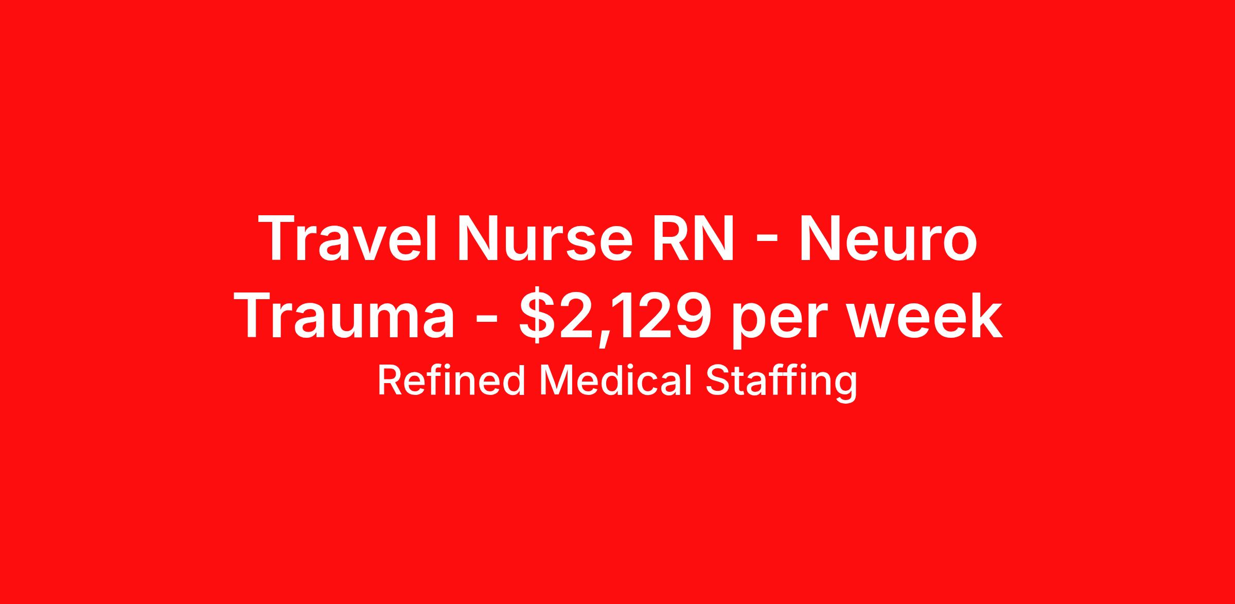 Refined Medical Staffing is seeking a travel nurse RN Neuro Trauma for a travel nursing job in Evansville, Indiana. Job Description & Requirements Specialty: Neuro Trauma Discipline: RN Start Date: 04/13/2026 Duration: 13 weeks 36 hours per week Shift: 12 hours, nights Employment Type: Travel Refined Medical Staffing Job ID ASC-43101. Pay package is based on 12 hour shifts and 36 hours per week (subject to confirmation) with tax-free stipend amount to be determined. About Refined Medical Staffing Founded in 2018, Refined Medical Staffing’s leadership team emphasizes our commitment to partnership, communication and proactive service in every aspect of our daily operations. Our leaderships’ decades of industry experience paired with our engaging and transparent staff create a team unlike any other. We are committed to empowering Healthcare Professionals with the skills and knowledge they need to further their careers while making the travel experience as stress-free and enjoyable as possible. We understand that you are on the front line and there for all of us let us, let Refined be there for you. Benefits Benefits start day 1 License and certification reimbursement Life insurance Weekly pay Continuing Education Referral bonus Medical benefits Holiday Pay Mileage reimbursement Dental benefits Guaranteed Hours Vision benefits