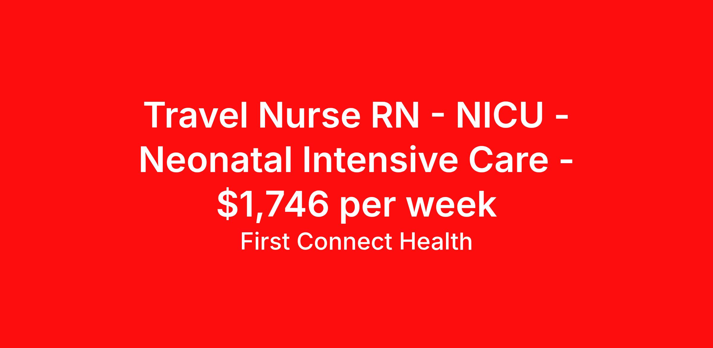 First Connect Health is seeking a travel nurse RN NICU - Neonatal Intensive Care for a travel nursing job in Canton, Georgia. Job Description & Requirements Specialty: NICU - Neonatal Intensive Care Discipline: RN Duration: 13 weeks 36 hours per week Shift: 11 hours, nights, flexible Employment Type: Travel Job Title: Registered Nurse – Neonatal Intensive Care Unit (NICU) Location: Canton, GA (No local candidates within 50 miles) Department: 651C Special Care Nursery Schedule: 7:00 PM – 7:30 AM (Varies) Assignment Duration: 13 weeks Job Summary: We are seeking an experienced Registered Nurse to join our Level III Neonatal Intensive Care Unit (Special Care Nursery) for a 13-week assignment. This role involves providing advanced care to neonates with medical and/or surgical needs using specialized equipment. Unit Overview: The Special Care Nursery (SCN) provides care to infants born at Northside Hospital and evaluates admissions/transfers from other hospitals on a case-by-case basis. Nurses in this unit work with ReCam ophthalmic imaging systems, cardiac monitors, warmer beds, and isolettes. Key Responsibilities: Provide direct care to neonates with medical and/or surgical conditions. Monitor patient condition using specialized neonatal equipment. Collaborate with multidisciplinary teams to ensure quality patient care. Document patient care accurately and comply with hospital protocols. Requirements: Minimum 2 years of NICU or specialty neonatal nursing experience. Current BLS certification. NRP (Neonatal Resuscitation Program) certification required. Ability to work flexible night shifts (7 PM – 7:30 AM). About First Connect Health At First Connect Health , we take pride in being a Joint Commission–certified healthcare staffing agency , headquartered in Newark, New Jersey. This prestigious certification is more than just a seal — it's a reflection of our commitment to excellence, safety, and quality in everything we do. By meeting the rigorous standards set by The Joint Commission, one of the most respected accrediting bodies in healthcare, we've demonstrated that our processes, compliance, and patient care standards are aligned with the highest levels of quality in the industry. But our dedication goes beyond certifications. Nurses choose First Connect Health because: ✅ Trust and Transparency: We foster honest communication, timely updates, and full transparency throughout your placement journey. ✅ Best Pay & Benefits: We offer industry-leading compensation packages, along with benefits that support your career goals. ✅ Flexibility & Choice: Whether you're seeking short-term assignments, long-term contracts, or local opportunities, we provide the flexibility to suit your preferences. ✅ Personalized Support: Our recruiters take the time to understand your needs, guiding you with care, respect, and responsiveness at every step. When you work with First Connect Health, you're not just another number — you're a valued professional. Join a team that’s focused on your success, your well-being, and your future in healthcare. Benefits Medical benefits Sick pay 401k retirement plan Weekly pay Referral bonus