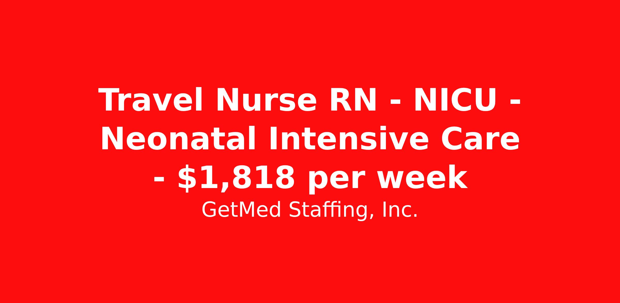 GetMed Staffing, Inc. is seeking a travel nurse RN NICU - Neonatal Intensive Care for a travel nursing job in San Luis Obispo, California. Job Description & Requirements Specialty: NICU - Neonatal Intensive Care Discipline: RN Start Date: ASAP Duration: 13 weeks 36 hours per week Shift: 12 hours, nights Employment Type: Travel GetMed Staffing is searching for a strong NICU RN to assist our traveler-friendly client. A minimum of 1-2 years of experience is required. Traveling with GetMed Staffing offers the unique opportunity to gain diverse experiences, both personally and professionally. Gain experience that matters. GetMed Staffing, Inc. Job ID 36004732. Pay package is based on 12 hour shifts and 36.0 hours per week (subject to confirmation) with tax-free stipend amount to be determined. Posted job title: RN:NICU,19:00:00-07:00:00 About GetMed Staffing, Inc. We are a diversity owned company, specializing in healthcare recruiting services. We truly understand how important a healthcare travelers' relationship is with their recruiter, as well as our relationship is with our healthcare facilities. We recognize that the needs of our healthcare travelers can vary, and therefore we provide the personalized touch necessary to ensure a successful travel assignment each and every time. Our healthcare facilities and clients benefit from us putting our healthcare travelers first. GetMed Staffing is excited to be a leader within the industry by focusing on providing healthcare travelers with more choices and possibilities as they plan for their next healthcare travel assignment. Benefits Life insurance Medical benefits Dental benefits Vision benefits 401k retirement plan