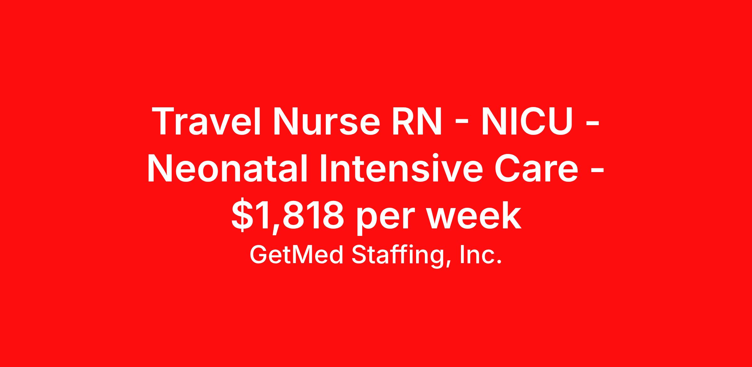 GetMed Staffing, Inc. is seeking a travel nurse RN NICU - Neonatal Intensive Care for a travel nursing job in San Luis Obispo, California. Job Description & Requirements Specialty: NICU - Neonatal Intensive Care Discipline: RN Start Date: ASAP Duration: 13 weeks 36 hours per week Shift: 12 hours, nights Employment Type: Travel GetMed Staffing is searching for a strong NICU RN to assist our traveler-friendly client. A minimum of 1-2 years of experience is required. Traveling with GetMed Staffing offers the unique opportunity to gain diverse experiences, both personally and professionally. Gain experience that matters. GetMed Staffing, Inc. Job ID 36004732. Pay package is based on 12 hour shifts and 36.0 hours per week (subject to confirmation) with tax-free stipend amount to be determined. Posted job title: RN:NICU,19:00:00-07:00:00 About GetMed Staffing, Inc. We are a diversity owned company, specializing in healthcare recruiting services. We truly understand how important a healthcare travelers' relationship is with their recruiter, as well as our relationship is with our healthcare facilities. We recognize that the needs of our healthcare travelers can vary, and therefore we provide the personalized touch necessary to ensure a successful travel assignment each and every time. Our healthcare facilities and clients benefit from us putting our healthcare travelers first. GetMed Staffing is excited to be a leader within the industry by focusing on providing healthcare travelers with more choices and possibilities as they plan for their next healthcare travel assignment. Benefits Life insurance Medical benefits Dental benefits Vision benefits 401k retirement plan