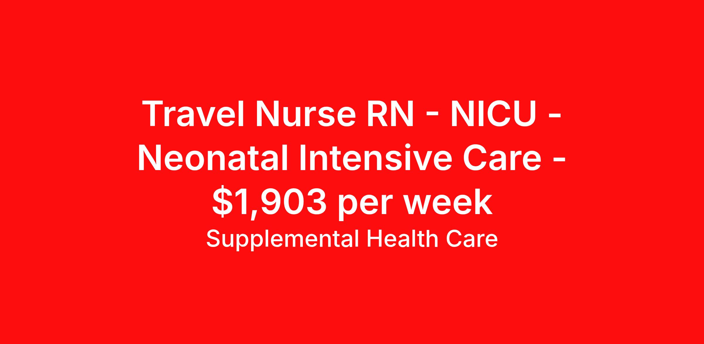 Supplemental Health Care is seeking a travel nurse RN NICU - Neonatal Intensive Care for a travel nursing job in Winchester, Tennessee. Job Description & Requirements Specialty: NICU - Neonatal Intensive Care Discipline: RN Start Date: ASAP Duration: 13 weeks 36 hours per week Shift: 12 hours, nights Employment Type: Travel Job Description: Supplemental Health Care is hiring NICU RNs for contract assignments at partnering hospitals in Winchester, Tennessee. Whether you’re looking to travel or stay local, we’re committed to helping Neonatal Intensive Care Unit Registered Nurses find the right fit with top hospitals across the country. With more than 40 years of experience in healthcare staffing, Supplemental Health Care offers reliable support, competitive pay, and great benefits every step of the way. Qualifications: Tennessee RN License or Compact State RN License American Heart Association BLS NRP or NALS 2 years of recent Neonatal Intensive Care Unit experience PALS certification is preferred NICU RN Contract Details: $1,728 - $1,903 per week* NOC shift available 13-week contract with possibility to extend Provide neonatal care for pediatric patients Provide care for neonatal patients recovering from complex surgery or treatments and may be on medication drips, ventilator, central lines, arterial lines, CVP, or foleys Monitor patient vitals and telemetry strips and intervene as necessary *Estimated weekly payment may include both taxable wages and tax-free reimbursements for meals, housing, and incidentals. Please speak with a recruiter for details. Apply today to get started with this NICU RN contract opportunity, or talk to our team about the full range of Registered Nurse opportunities available. What We Offer: Full medical, dental, vision, life, and even pet insurance! Round the clock support. No matter where you are or what time it is, Supplemental Health Care is standing by. SHC's Share the Care referral program is the most dynamic, profitable referral program in the industry. 401(k) Retirement Savings Program with a wide range of investment options. Discounted and free online access to CEU courses through Supplemental University. Supplemental Health Care is an Equal Opportunity Employer. All candidates, including veterans and those with disabilities, are encouraged to apply. SHC will consider for employment qualified applicants with criminal histories in a manner consistent with the requirements of applicable local, state, or federal law. To learn more, visit www.shccares.com/eeo Supplemental Health Care Job ID 1472588. Pay package is based on 12 hour shifts and 36 hours per week (subject to confirmation) with tax-free stipend amount to be determined. Posted job title: NICU RN - Registered Nurse About Supplemental Health Care At Supplemental Health Care, a simple belief in the power of caring guides a unique commitment to world-class service in healthcare staffing. For 40 years, we’ve supported talented professionals pursuing their life calling in hospitals, schools, home health, corrections, behavioral health, and other settings. At SHC, we inspire vital connections and enrich lives and inspire better outcomes. As recipients of the Best in Staffing Awards for both Client and Talent, Supplemental Health Care is proud to be among only 2% of staffing companies singled out for the distinction based on the real feedback of our employees and the clients we serve. SHC has also earned The Joint Commission’s Gold Seal of Approval and is named among the Largest Health Care Staffing companies in the United States by Staffing Industry Analysts. We are also thrilled to recognize our very own SLP, Dr. Kelly Byrd as the American Staffing Association 2024 National Staffing Employee of the Year and Health Care Sector All-Star. We’re honored to connect Dr. Byrd to employment, share her incredible story, and support her family literacy nonprofit. For everyone that we serve, SHC is the place where caring hearts thrive. Benefits Referral bonus Benefits start day 1 401k retirement plan Continuing Education Discount program Health savings account
