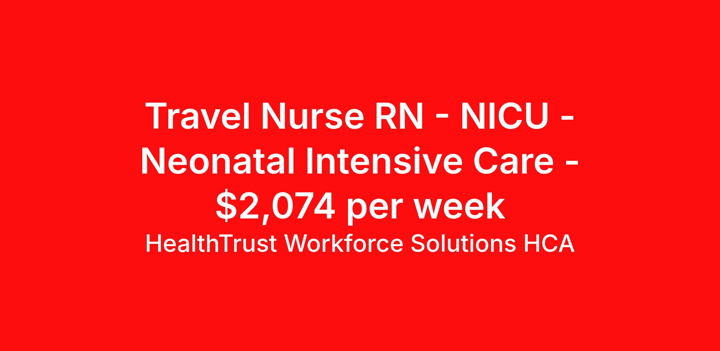 HealthTrust Workforce Solutions HCA is seeking a travel nurse RN NICU - Neonatal Intensive Care for a travel nursing job in Wichita, Kansas. Job Description & Requirements Specialty: NICU - Neonatal Intensive Care Discipline: RN Start Date: 04/13/2026 Duration: 13 weeks 36 hours per week Shift: 12 hours, nights Employment Type: Travel Not the right fit? No worries – I’ve got jobs all over. Text or call me, Kalee, at and let’s find somewhere that works for you. About HealthTrust Workforce Solutions HCA At HealthTrust Workforce Solutions, healthcare is not just about the four walls of a facility but about the people who provide and receive care. Our focus is on empowering healthcare professionals to deliver exceptional patient experiences by providing them with the necessary skills, tools, and support. We partner with healthcare facilities nationwide to ensure that the right professionals are in the right roles. We prioritize our clinicians by giving them a voice and access to opportunities to fulfill their mission of improving lives by providing quality patient care. We are committed to our core values of Trust, Innovation, Adaptability, Courage, and Accountability. We are dedicated to positively impacting the healthcare industry by providing first-priority access to more than 200,000 jobs nationwide to our healthcare professionals. Join us and be part of the HealthTrust family, where you can make a difference every day. We embrace our changing environment, and we maintain a culture that has a rich tradition of transforming itself to meet the challenges of the future. MISSION STATEMENT While putting great people in the right roles is essential, our mission is far greater. We want our clinicians to be part of the HealthTrust family, where healthcare professionals have a voice and are empowered with the right tools and opportunities to fulfill their personal mission of improving lives. Plus, as a preferred partner to thousands of top-performing hospitals, we provide our healthcare professionals with first-priority access to more than 200,000 jobs nationwide. Benefits Dental benefits Vision benefits Referral bonus Continuing Education Life insurance