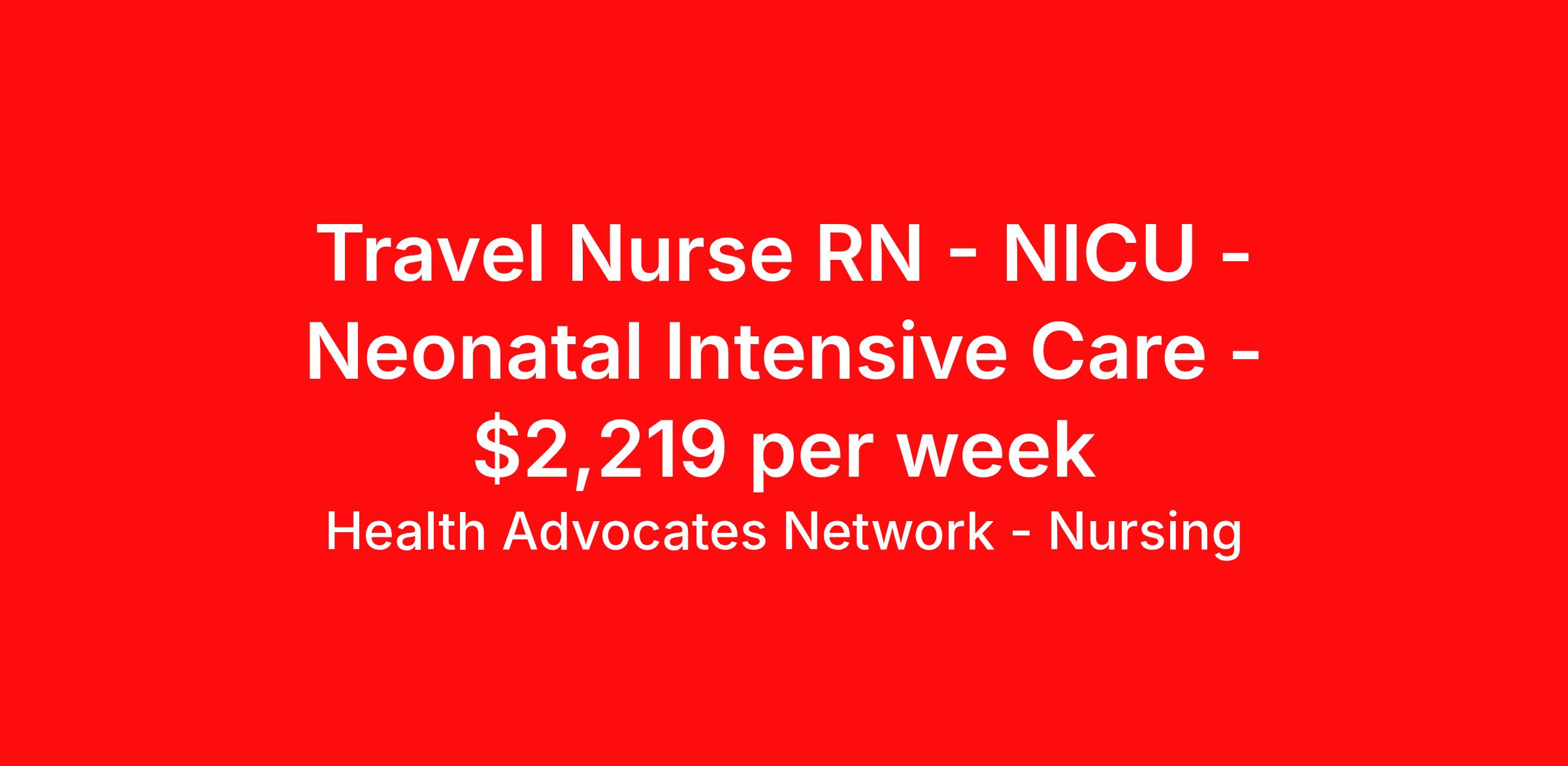 Health Advocates Network - Nursing is seeking a travel nurse RN NICU - Neonatal Intensive Care for a travel nursing job in Largo, Maryland. Job Description & Requirements Specialty: NICU - Neonatal Intensive Care Discipline: RN Start Date: 04/08/2026 Duration: 13 weeks 36 hours per week Shift: 12 hours, nights Employment Type: Travel RN – NICU Registered Nurse - Health Advocates Network is urgently hiring NICU RNs with at least 2 years of recent experience! IMMEDIATE STARTS! Travel packages up to $2,219 weekly 12 hour DAY and NIGHT shifts available 13 week contracts available Specialty: NICU Registered Nurse (RN) Requirements: Active MD State or Compact Registered Nurse License if applicable Valid BLS, PALS Graduate of an Accredited School of Nursing Additional certifications may be required Benefits We Offer: Competitive pay rates, Referral Bonus, Medical, Dental and Vision. Travel reimbursement and per diem allowances, Employee discounts, educational opportunities, and more! To apply for this job now or to find out more about other opportunities with Health Advocates Network, Inc. reply to this posting, contact us at or call/text . We can provide you unparalleled access to exciting career opportunities. Health Advocates Network, Inc . is an equal opportunity employer. All qualified applicants shall receive consideration for employment without regard to any legally protected basis protected by applicable federal or state law except where a bona fide occupational qualification applies. Refer a Registered Nurse for a $1,000.00 bonus opportunity! HANStaff Job ID 519629. Pay package is based on 12 hour shifts and 36 hours per week (subject to confirmation) with tax-free stipend amount to be determined. Posted job title: RN - NICU About Health Advocates Network - Nursing Health Advocates Network was founded on the basis of a shared aspiration, to improve the way healthcare staffing is done. We are a company established and led by nurses. Our flexible approach enables us to develop solutions customized to your specific needs. From short- and long-term travel contracts to local and per diem assignments and more, we are here to get you to your next adventure! By solving challenges, providing the best placements, and advocating for you, we stand to help you thrive and pave the path forward in your career. Click on the videos below to learn more about our values!