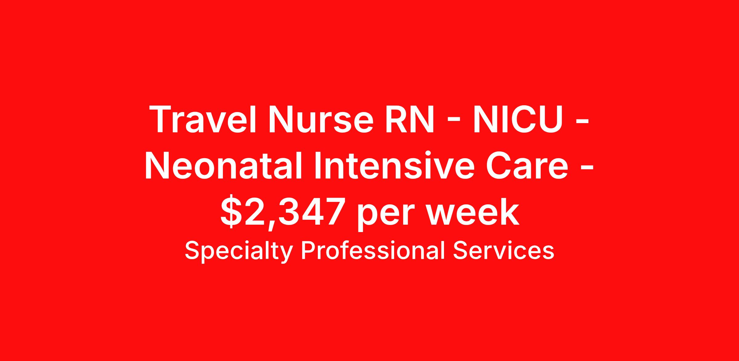 Specialty Professional Services is seeking a travel nurse RN NICU - Neonatal Intensive Care for a travel nursing job in Plainsboro, New Jersey. Job Description & Requirements Specialty: NICU - Neonatal Intensive Care Discipline: RN Start Date: 03/31/2026 Duration: 51 weeks 36 hours per week Shift: 12 hours, nights Employment Type: Travel Specialty Professional Services Job ID 62346219. Pay package is based on 12 hour shifts and 36 hours per week (subject to confirmation) with tax-free stipend amount to be determined. About Specialty Professional Services SPECIALTY offers a variety of benefits to ensure rewarding work experience for healthcare professionals. One standout feature is our lucrative referral program, where anyone—whether or not they are employed by the company—can earn bonuses for referring candidates. Bonuses vary depending on the position, with higher amounts for advanced roles like Nurse Practitioners and Physician Assistants. To receive a referral bonus, certain conditions must be met, such as ensuring the referred individual is not already in the database and completing a W-4 form. In addition to the referral program, SPECIALTY offers guaranteed contract time, ensuring job stability with assignments ranging from one week to several months. Healthcare workers can choose flexible shifts, with no cancellations, providing continuity of care for patients. Specialty also provides long-term benefits, including a 401(k) retirement plan that starts immediately without any minimum hourly requirements, allowing employees to start saving for their future. For full-time employees, comprehensive health benefits are available through United Healthcare, which includes major medical, prescription, and hospitalization coverage. There is a 60-day probationary period before signing up for the medical plan, and premiums are deducted pre-tax for added convenience. Benefits 401k retirement plan Guaranteed Hours Sick pay License and certification reimbursement Medical benefits Weekly pay Referral bonus