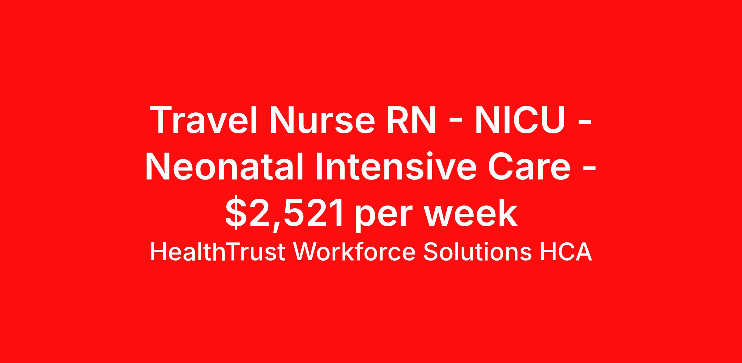 HealthTrust Workforce Solutions HCA is seeking a travel nurse RN NICU - Neonatal Intensive Care for a travel nursing job in Richmond, Virginia. Job Description & Requirements Specialty: NICU - Neonatal Intensive Care Discipline: RN Start Date: 04/13/2026 Duration: 13 weeks 36 hours per week Shift: 12 hours, days Employment Type: Travel Weekly pay, medical benefits and guaranteed hours. About HealthTrust Workforce Solutions HCA At HealthTrust Workforce Solutions, healthcare is not just about the four walls of a facility but about the people who provide and receive care. Our focus is on empowering healthcare professionals to deliver exceptional patient experiences by providing them with the necessary skills, tools, and support. We partner with healthcare facilities nationwide to ensure that the right professionals are in the right roles. We prioritize our clinicians by giving them a voice and access to opportunities to fulfill their mission of improving lives by providing quality patient care. We are committed to our core values of Trust, Innovation, Adaptability, Courage, and Accountability. We are dedicated to positively impacting the healthcare industry by providing first-priority access to more than 200,000 jobs nationwide to our healthcare professionals. Join us and be part of the HealthTrust family, where you can make a difference every day. We embrace our changing environment, and we maintain a culture that has a rich tradition of transforming itself to meet the challenges of the future. MISSION STATEMENT While putting great people in the right roles is essential, our mission is far greater. We want our clinicians to be part of the HealthTrust family, where healthcare professionals have a voice and are empowered with the right tools and opportunities to fulfill their personal mission of improving lives. Plus, as a preferred partner to thousands of top-performing hospitals, we provide our healthcare professionals with first-priority access to more than 200,000 jobs nationwide. Benefits Dental benefits Vision benefits Referral bonus Continuing Education Life insurance