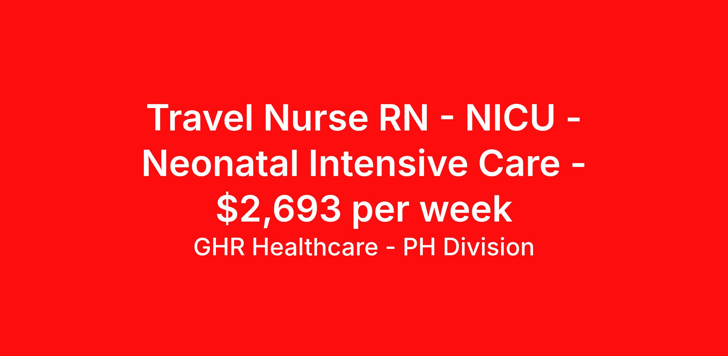 GHR Healthcare - PH Division is seeking a travel nurse RN NICU - Neonatal Intensive Care for a travel nursing job in Danville, Pennsylvania. Job Description & Requirements Specialty: NICU - Neonatal Intensive Care Discipline: RN Start Date: 04/06/2026 Duration: 13 weeks 36 hours per week Shift: 12 hours Employment Type: Travel NICU Registered Nurse (RN) – Travel Assignment | Danville, PA NICU Registered Nurse (RN) – Travel Assignment in Danville, PA. 13-week contract starting April 6, 2026. Must have 2 years NICU experience and an active RN license. Join a skilled neonatal care team in a scenic Central Pennsylvania community. Job Details Location: Danville, PA 17822 (Central Pennsylvania travel nursing opportunity) Position Type / Specialty: Travel Nurse – NICU / Neonatal Intensive Care Unit Assignment Length: 13 weeks Start Date: April 6, 2026 End Date: July 5, 2026 Estimated Weekly Salary: $2,470–$2,600/week Shift: Day/Night rotation (minimum 4 nights in 4 weeks) Shift Options: 0700–1930 & 1900–0730 Hours per Week: 36 hours (3 x 12-hour shifts) Employment Type: Travel RN Number of Positions: 6 Qualifications / Job Requirements Active RN license required (state requirements must be met) Minimum 2 years of NICU experience required — demonstrated neonatal care skills preferred Ability to work both day and night shifts and rotate as scheduled Willingness to work every other holiday during the contract Flexibility to be pulled to PICU or to provide 1:1 patient care as needed Responsibilities Provide high-quality, evidence-based nursing care to neonates in the Neonatal Intensive Care Unit (NICU) Monitor and assess newborn patient conditions; recognize and respond to acute changes Administer medications, manage IVs/infusions, and follow neonatal protocols Document patient care, interventions, and progress accurately in the medical record Collaborate with neonatologists, respiratory therapists, lactation consultants, and multidisciplinary teams Participate in day/night rotations and meet weekend and holiday staffing requirements Adapt to unit needs, including possible temporary assignment to PICU or 1:1 bedside care Why apply: This travel nursing job is an excellent opportunity for NICU RNs and neonatal nurses looking for short-term travel assignments in Pennsylvania. Enjoy hands-on neonatal care experience in a supportive team environment and explore the scenic river views and outdoor recreation Danville offers during your contract. Apply now — Submit your resume, active RN license information, and NICU experience details to be considered for this travel nursing assignment in Danville, PA. Join our neonatal care team today. Benefits 401K with Matching, Healthcare, Dental and Vision Equal Opportunity We are an equal opportunity employer and value diversity across our organization. We do not discriminate on the basis of race, religion, color, national origin, gender, sexual orientation, age, marital status, veteran status, or disability status. Planet Healthcare Job ID 467651. Pay package is based on 12 hour shifts and 36 hours per week (subject to confirmation) with tax-free stipend amount to be determined. Posted job title: NICU About GHR Healthcare - PH Division For over 30 years, GHR Healthcare has been the bridge between healthcare professionals and the facilities that need them nationwide. We're committed to uncovering your ideal fit, supported by GHR's dedication to competitive compensation, transparent communication, and a devoted team that genuinely cares about your career journey. You can trust us to stand by your side as your advocate, confidante, and partner in advancing your career. At GHR, care and consideration are at the heart of everything we do. Visit ghrhealthcare.com to learn more.