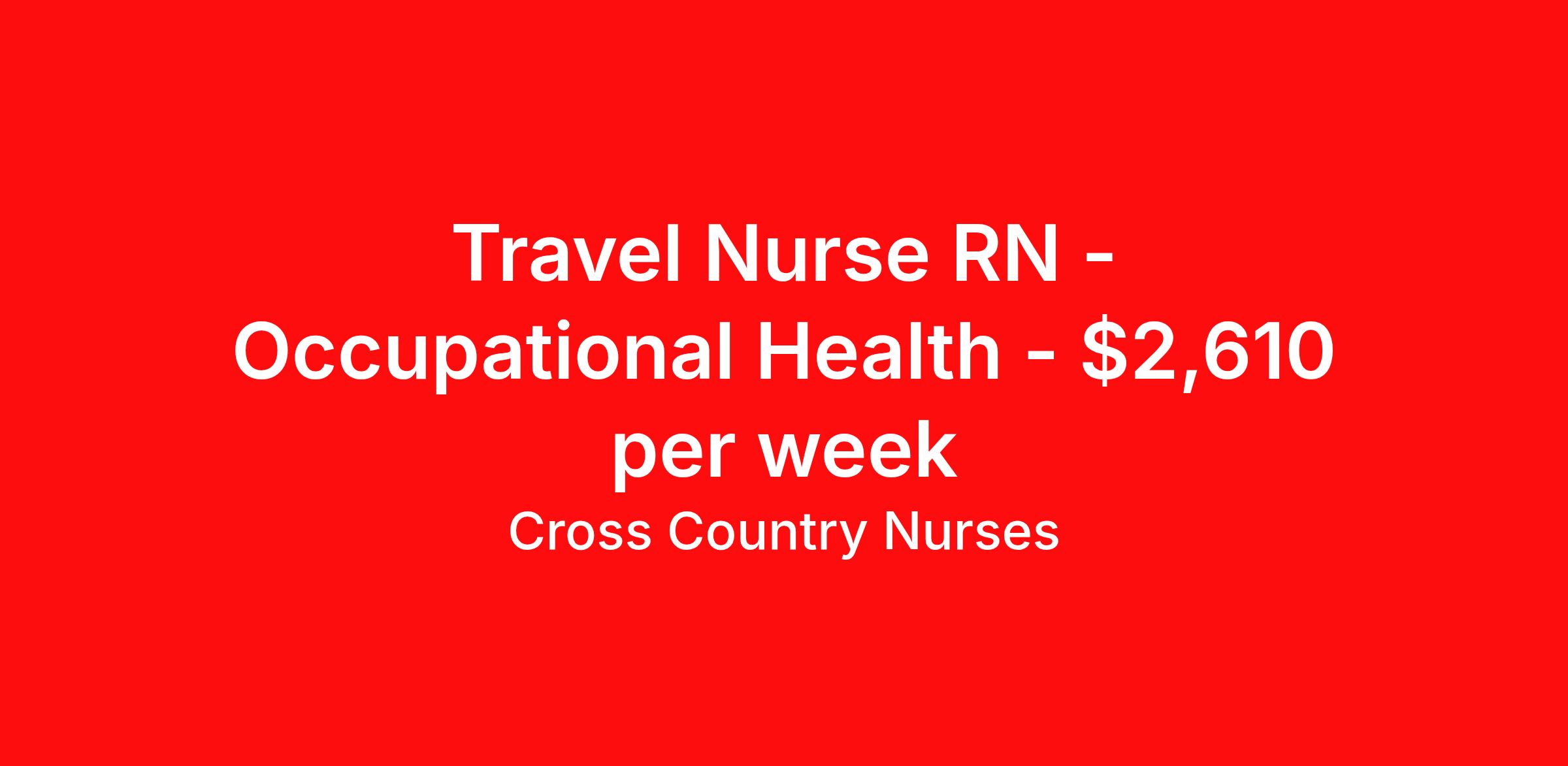 Cross Country Nurses is seeking a travel nurse RN Occupational Health for a travel nursing job in Salinas, California. Job Description & Requirements Specialty: Occupational Health Discipline: RN Start Date: 04/27/2026 Duration: 13 weeks 40 hours per week Shift: 8 hours, days Employment Type: Travel Job Description As a registered nurse - occupational employee health (RN), also called an occupational health nurse or employee health nurse, you'll focus on the health and safety of employees. The roles of occupational health nurses are diverse, and depending on your position, you'll serve as a case manager, educator, consultant or clinician in corporate, academic, industrial or government settings. Your duties may include teaching health and safety best practices, evaluating patients, treating injuries, immunizing workers or managing disaster preparedness programs. Minimum Requirements At least 1 year of recent acute care experience in specialty Active RN license Benefits The benefits of taking a travel nursing job with Cross Country include: Private housing or generous housing allowance Comprehensive health insurance with prescription coverage Dependent health insurance with prescription coverage Competitive salaries Referral bonuses Travel reimbursement 401(k) retirement plan Direct deposit/free checking Unlimited free CE credits Cross Country Job ID 1237259. Pay package is based on 8 hour shifts and 40 hours per week (subject to confirmation) with tax-free stipend amount to be determined. Posted job title: Registered Nurse / Occupational Employee Health About Cross Country Nurses You care for others — we’re here to care for you. At Cross Country, we know travel nursing is about more than just the job. It’s about building a career that supports your lifestyle, your values, and your impact. We offer competitive pay, full benefits, and 24/7 support from a team that truly understands what it means to be on the front lines. Wherever your journey takes you, we’re with you every step of the way. Let’s build your best life — one assignment at a time. Benefits 401k retirement plan Referral bonus