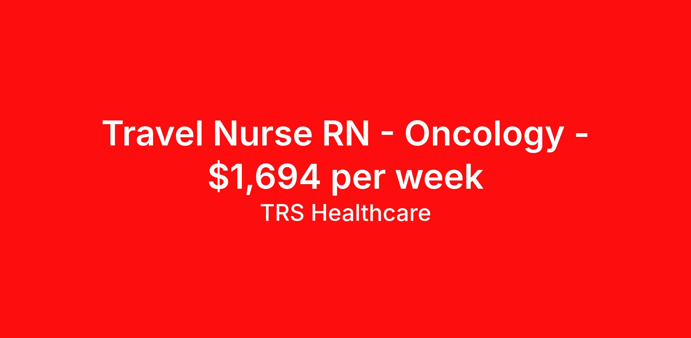 TRS Healthcare is seeking a travel nurse RN Oncology for a travel nursing job in Columbia, Missouri. Job Description & Requirements Specialty: Oncology Discipline: RN Start Date: 04/13/2026 Duration: 13 weeks 40 hours per week Shift: 8 hours, days Employment Type: Travel TRS Healthcare Job ID 1448328. Pay package is based on 8 hour shifts and 40 hours per week (subject to confirmation) with tax-free stipend amount to be determined. Posted job title: Oncology Registered Nurse About TRS Healthcare TRS Healthcare has been a leader in the healthcare staffing industry for over 25 years, providing exceptional career opportunities for travel nurses and allied health professionals. An RN-founded, woman-owned company, TRS Healthcare has team members in all 50 states. We recruit and support registered nurses, licensed practical nurses, surgical technicians, respiratory therapists, imaging technologists, laboratory specialists, and other experienced nursing and allied healthcare professionals. We staff hundreds of healthcare facilities across the U.S. in urban, rural, and underserved areas, including multi-state hospital systems, critical access hospitals, rural community hospitals, long-term care facilities, trauma centers, standalone clinics, and more. Learn more about TRS Healthcare at trshealthcare.com .
