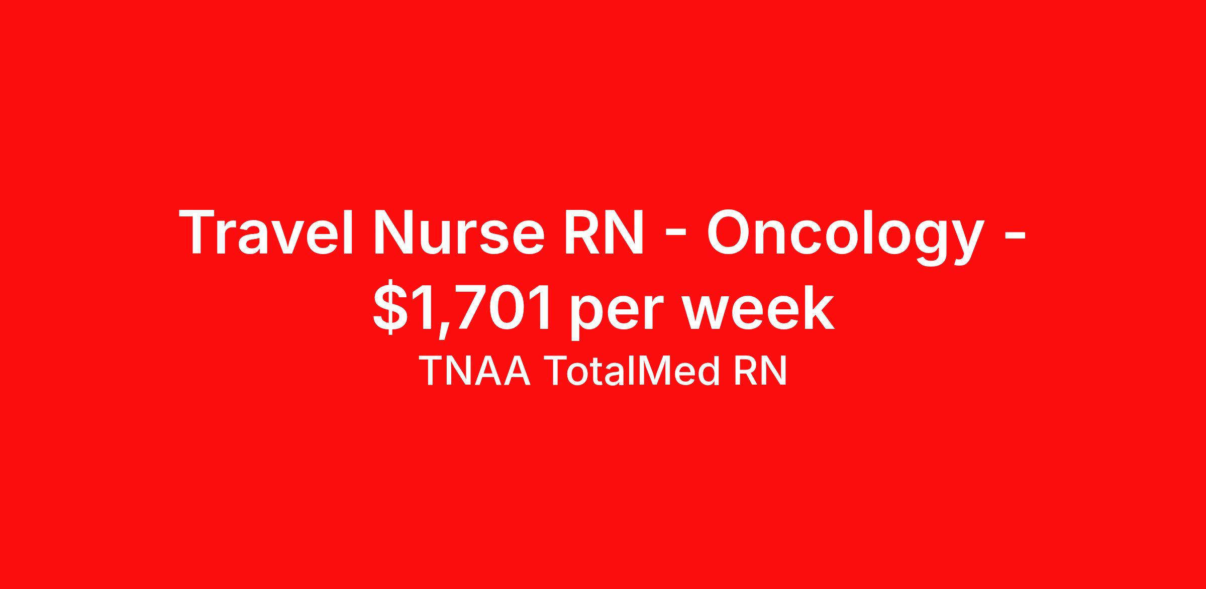 TNAA TotalMed RN is seeking a travel nurse RN Oncology for a travel nursing job in Saint Joseph, Michigan. Job Description & Requirements Specialty: Oncology Discipline: RN Duration: 13 weeks 36 hours per week Shift: 12 hours, nights Employment Type: Travel We're looking for Oncology RNs for an immediate travel nurse opening in Saint Joseph, MI. The right RN should have 1-2 years recent acute care experience. Read below for more requirements. As an Oncology RN, you'll provide top-level care for critically or chronically ill cancer patients. Under direction from a physician, you may administer chemotherapy, implement new methods of symptom treatment, and monitor patients' progress. Oncology Travel Nurses are crucial in creating a supportive care environment. A large portion of this important job is educating cancer patients about treatment options and procedures. As an Oncology Travel Nurse, you should be prepared to perform the following tasks: Coordinate treatment plans. Provide patient education and treatment tracking. Be a reliable source of comfort and support for cancer patients and their families. Attend to a great number of details while working under pressure. Implement best practice treatment protocols in a variety of settings. Oncology Travel Nurses should be able to stand and walk for long periods of time, as well as bend, lean and stoop without difficulty. RNs should be able to easily lift 20 pounds. Moving or lifting of patients may require lifting of up to 50 pounds at times. Oncology RNs may face hazards from exposure to chemicals and infectious diseases. Requirements*: BLS, 2 Years * Additional certifications may be required before beginning an assignment. TotalMed Travel Job ID 1378485. Pay package is based on 12 hour shifts and 36 hours per week (subject to confirmation) with tax-free stipend amount to be determined. Posted job title: Oncology - Oncology RN - Travel Nurse About TNAA TotalMed RN TotalMed is a Top Ten, travel nursing and healthcare staffing agency with the mission of igniting purpose in healthcare. The organization staffs nurses, therapists, pharmacists, and other clinicians of all specialties in all 50 states. They offer local and travel jobs and match caregivers with the right organization to assist both facilities and patients. As an organization, they focus on putting highly-skilled staff into facilities to ensure adequate staffing for a better patient experience. TotalMed specializes in recruiting and placing healthcare professionals in travel, PRN, and permanent positions across the country in Nursing and Allied Health. Throughout 2020, the organization filled roles at even the most short-staffed facilities during the most challenging time in healthcare. By matching the right travel healthcare professional with the right organization, TotalMed continues to offer a lifeline to facilities and their patients. Benefits Weekly pay Guaranteed Hours Continuing Education 401k retirement plan Sick pay Wellness and fitness programs Referral bonus Employee assistance programs Medical benefits Dental benefits Vision benefits Benefits start day 1