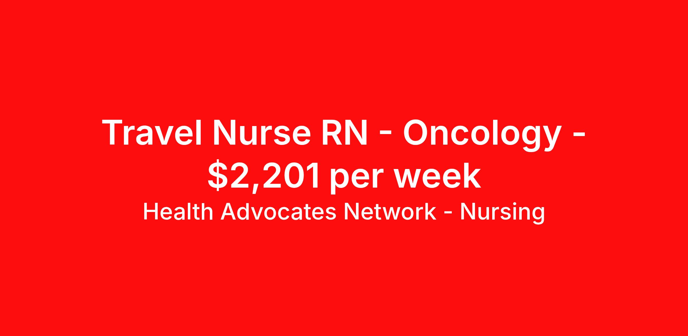 Health Advocates Network - Nursing is seeking a travel nurse RN Oncology for a travel nursing job in Webster, Texas. Job Description & Requirements Specialty: Oncology Discipline: RN Start Date: ASAP Duration: 13 weeks 36 hours per week Shift: 12 hours, nights Employment Type: Travel RN – Oncology Registered Nurse - Health Advocates Network is urgently hiring Oncology RNs with at least 2 years of recent experience! IMMEDIATE STARTS! Travel package: $2,201.00 weekly Shift: 12- hour NIGHT shifts available 13 -week contracts available Specialty: Oncology Registered Nurse (RN) Requirements: Active TX or COMPACT State Registered Nurse License Valid BLS Graduate of an Accredited School of Nursing Additional certifications may be required Chemo/Biotherapy administration experience BMT/Bone Marrow transplant experience Hematology experience Benefits We Offer: Competitive pay rates, Referral Bonus, Medical, Dental, Vision, and 401k. Travel reimbursement and per diem allowances, Employee discounts, educational opportunities, and more! To apply for this job now or to find out more about other opportunities with Health Advocates Network, Inc., reply to this posting, contact us at , or call/text . We can provide you with unparalleled access to exciting career opportunities. Health Advocates Network, Inc . is an equal opportunity employer. All qualified applicants shall receive consideration for employment without regard to any legally protected basis protected by applicable federal or state law, except where a bona fide occupational qualification applies. Refer a qualified Allied Professional for a $1,000.00 bonus opportunity! HANStaff Job ID 511504. Pay package is based on 12 hour shifts and 36 hours per week (subject to confirmation) with tax-free stipend amount to be determined. Posted job title: RN - Oncology About Health Advocates Network - Nursing Health Advocates Network was founded on the basis of a shared aspiration, to improve the way healthcare staffing is done. We are a company established and led by nurses. Our flexible approach enables us to develop solutions customized to your specific needs. From short- and long-term travel contracts to local and per diem assignments and more, we are here to get you to your next adventure! By solving challenges, providing the best placements, and advocating for you, we stand to help you thrive and pave the path forward in your career. Click on the videos below to learn more about our values!