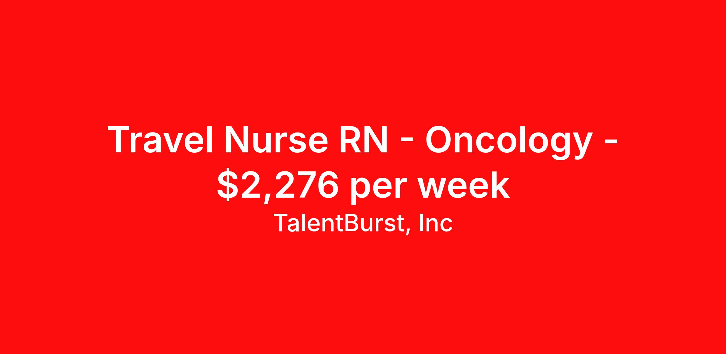 TalentBurst, Inc is seeking a travel nurse RN Oncology for a travel nursing job in Atlanta, Georgia. Job Description & Requirements Specialty: Oncology Discipline: RN Start Date: 04/20/2026 Duration: 12 weeks 40 hours per week Shift: 8 hours, days Employment Type: Travel Job Title: Registered Nurse - Oncology No local candidates within 50 miles. Schedule 830am-5pm Mon-Fri 13 weeks Short Description: Min of 2 years of experience within specialty. Required: AHA BLS, Chemo Cert & MUST Administer Chemotherapy JOB DESCRIPTION Position Title: Registered Nurse FLSA Status: Non-Exempt Department: All Departments/Campuses, as Assigned Reports To: Supervisor, Coordinator, or Manager Occupational Summary The Registered Professional Nurse (RN) independently plans and delivers patient-centered care in accordance with physician orders, established clinical guidelines, and the scope of practice defined by the Georgia Nurse Practice Act. Professional nursing practice aligns with the American Nurses Association (ANA) Scope and Standards of Practice , emphasizing clinical excellence, leadership, accountability, and evidence-based care. The Staff RN is a competent nurse who manages care for an assigned patient population, demonstrating advanced clinical judgment, adaptability, and professional growth. Primary Nursing Duties and Responsibilities – Staff RN Demonstrate clinical competency in the management of complex patients and family care needs. Provide safe, effective, and evidence-based patient care in accordance with current clinical guidelines. Independently implement the nursing process and adapt care to rapidly changing patient conditions. Utilize patient care technology and clinical information systems efficiently and safely. Delegate patient care appropriately in alignment with scope of practice. Serve as a preceptor and mentor for new employees and students. Establish and pursue professional development and lifelong learning goals. Perform self-assessment and identify opportunities for growth. Recognize and address ethical issues in clinical practice. Collaborate with interdisciplinary teams to ensure continuity of care. Apply evidence-based policies and procedures in clinical decision-making. Participate in quality improvement, patient safety initiatives, and regulatory readiness activities. Additional Duties and Responsibilities Perform non-waived point-of-care testing within scope of practice, in accordance with all applicable standards and regulations, following successful completion of required training and competency validation (as applicable to department). Perform other duties as assigned by supervisor. Disclaimer: The above statements are intended to describe the general nature and level of work performed and are not intended to be an exhaustive list of all responsibilities. Patient Population Patient populations served vary by unit and may include: Unit/Department Neonate/Infant Child Adolescent Adult Geriatric Bone Marrow Transplant ✓ ✓ Breast Care Center ✓ ✓ ✓ Cancer Center (Radiation Oncology) ✓ ✓ ✓ Critical Care ✓ ✓ ✓ Emergency Department ✓ ✓ ✓ ✓ ✓ Family Centered Care ✓ ✓ ✓ GI Lab ✓ ✓ ✓ High Risk Perinatal ✓ ✓ ✓ IV Therapy ✓ ✓ ✓ Labor and Delivery ✓ ✓ ✓ Medical/Surgical ✓ ✓ ✓ Neurosciences ✓ ✓ ✓ Oncology ✓ ✓ ✓ Pain Treatment & Spine Centers ✓ ✓ ✓ Radiology ✓ ✓ ✓ ✓ Renal Services ✓ ✓ Screen Atlanta ✓ ✓ ✓ Special Care Nurseries ✓ Surgical Services ✓ ✓ ✓ ✓ ✓ Urodiagnostics ✓ ✓ Required Qualifications Graduate of an accredited school of nursing Current Registered Nurse (RN) license in the State of Georgia in good standing Minimum of two (2) years of full-time RN experience (post-orientation or residency) Current Basic Life Support (BLS) certification through the American Heart Association Additional certifications (e.g., ACLS, NRP, PALS) as required by specific unit Preferred Qualifications Bachelor of Science in Nursing (BSN) National certification in a clinical specialty Additional unit-specific experience or certifications Core Competencies Language Skills Effective communication with patients, families, and healthcare teams Ability to read and interpret clinical, technical, and regulatory materials Writing skills for documentation and communication as required Mathematical Skills Basic math proficiency Reasoning Ability Ability to interpret complex instructions and clinical data Strong problem-solving skills in dynamic healthcare environments Service Excellence Expectations Demonstrates professionalism Communicates respectfully and effectively Responds promptly to patient and team needs Takes ownership and accountability Demonstrates compassion and teamwork Supervision Reports To: Supervisor, Coordinator, or Manager, Nursing Services Supervises: LPNs, CNAs, Technicians, Medical Assistants, and other support staff (unit-specific) Working Conditions Exposure to infectious diseases, hazardous materials, needlesticks, and bodily fluids Potential exposure to radiation and radioactive materials Hepatitis B vaccination offered Corporate Compliance Adheres to all organizational policies, laws, regulations, and standards of conduct. Reports any suspected violations through appropriate channels. Physical Demands (Refer to unit-specific requirements for additional detail) Activity Frequency Close visual work (computer, documentation) Frequent Standing, walking, light lifting ( 50 lbs) Occasional to Frequent depending on unit Disclaimer This job description outlines the general nature and level of work performed and is not intended to be a comprehensive list of all duties and responsibilities. Talent Burst Job ID 26-07275. Pay package is based on 8 hour shifts and 40 hours per week (subject to confirmation) with tax-free stipend amount to be determined. Posted job title: Registered Nurse - Oncology About TalentBurst, Inc TalentBurst Health & Life Sciences is an established 