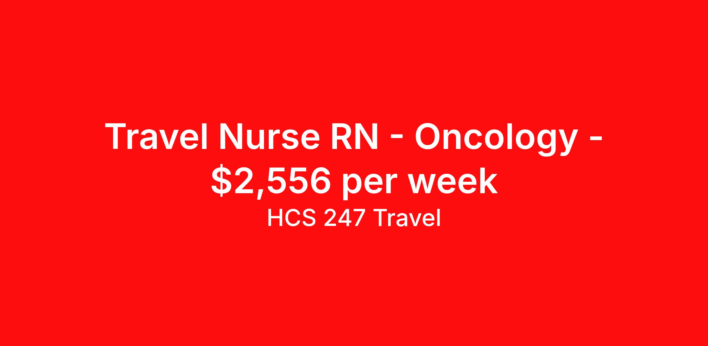 HCS 247 Travel is seeking a travel nurse RN Oncology for a travel nursing job in Beverly, Massachusetts. Job Description & Requirements Specialty: Oncology Discipline: RN Start Date: 04/06/2026 Duration: 12 weeks 40 hours per week Shift: 8 hours, flexible Employment Type: Travel HCS 247 Travel Job ID 62484895. Pay package is based on 8 hour shifts and 40 hours per week (subject to confirmation) with tax-free stipend amount to be determined. About HCS 247 Travel HCS 24/7 is a national healthcare staffing organization specializing in the placement of Registered Nurses and Allied health professionals across acute care and other clinical settings. We support travel assignments, local short- and long-term contracts, per diem, temp-to-perm, and direct hire opportunities nationwide. Our clinical coverage includes Registered Nurse specialties such as ER, ICU, Med-Surg, Telemetry, Step-Down, OR, PACU, L&D, Mother/Baby, NICU, Cath Lab, Endoscopy, and more along with a full range of allied and imaging professionals, including Respiratory Therapists, Surgical Technicians, X-Ray Techs, CT Techs, MRI Techs, Interventional Radiology (IR) Techs, Cath Lab Techs, Ultrasound/Sonographers, Mammography Techs, and Nuclear Medicine Techs. With competitive compensation and benefits, consistent opportunities, and a clinician-first approach backed by top-rated customer service, HCS 24/7 delivers a seamless experience from initial application through assignment completion. Benefits Holiday Pay Guaranteed Hours Continuing Education Mileage reimbursement Referral bonus Medical benefits Dental benefits Vision benefits License and certification reimbursement Life insurance Benefits start day 1 Weekly pay