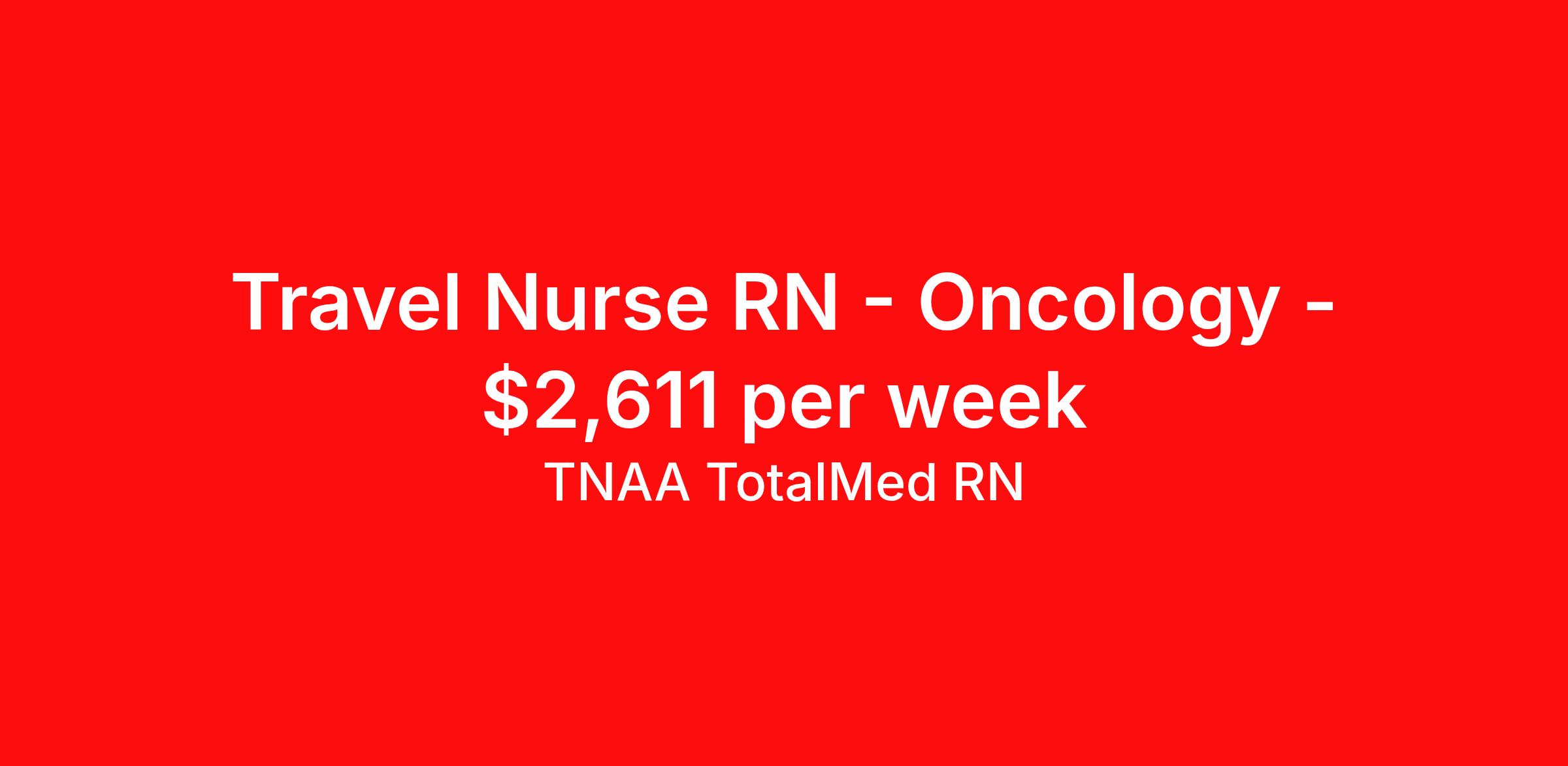TNAA TotalMed RN is seeking a travel nurse RN Oncology for a travel nursing job in Pagosa Springs, Colorado. Job Description & Requirements Specialty: Oncology Discipline: RN Start Date: 04/20/2026 Duration: 13 weeks 40 hours per week Shift: 10 hours, days Employment Type: Travel 1391034 About TNAA TotalMed RN TotalMed is a Top Ten, travel nursing and healthcare staffing agency with the mission of igniting purpose in healthcare. The organization staffs nurses, therapists, pharmacists, and other clinicians of all specialties in all 50 states. They offer local and travel jobs and match caregivers with the right organization to assist both facilities and patients. As an organization, they focus on putting highly-skilled staff into facilities to ensure adequate staffing for a better patient experience. TotalMed specializes in recruiting and placing healthcare professionals in travel, PRN, and permanent positions across the country in Nursing and Allied Health. Throughout 2020, the organization filled roles at even the most short-staffed facilities during the most challenging time in healthcare. By matching the right travel healthcare professional with the right organization, TotalMed continues to offer a lifeline to facilities and their patients. Benefits Weekly pay Guaranteed Hours Continuing Education 401k retirement plan Sick pay Wellness and fitness programs Referral bonus Employee assistance programs Medical benefits Dental benefits Vision benefits Benefits start day 1