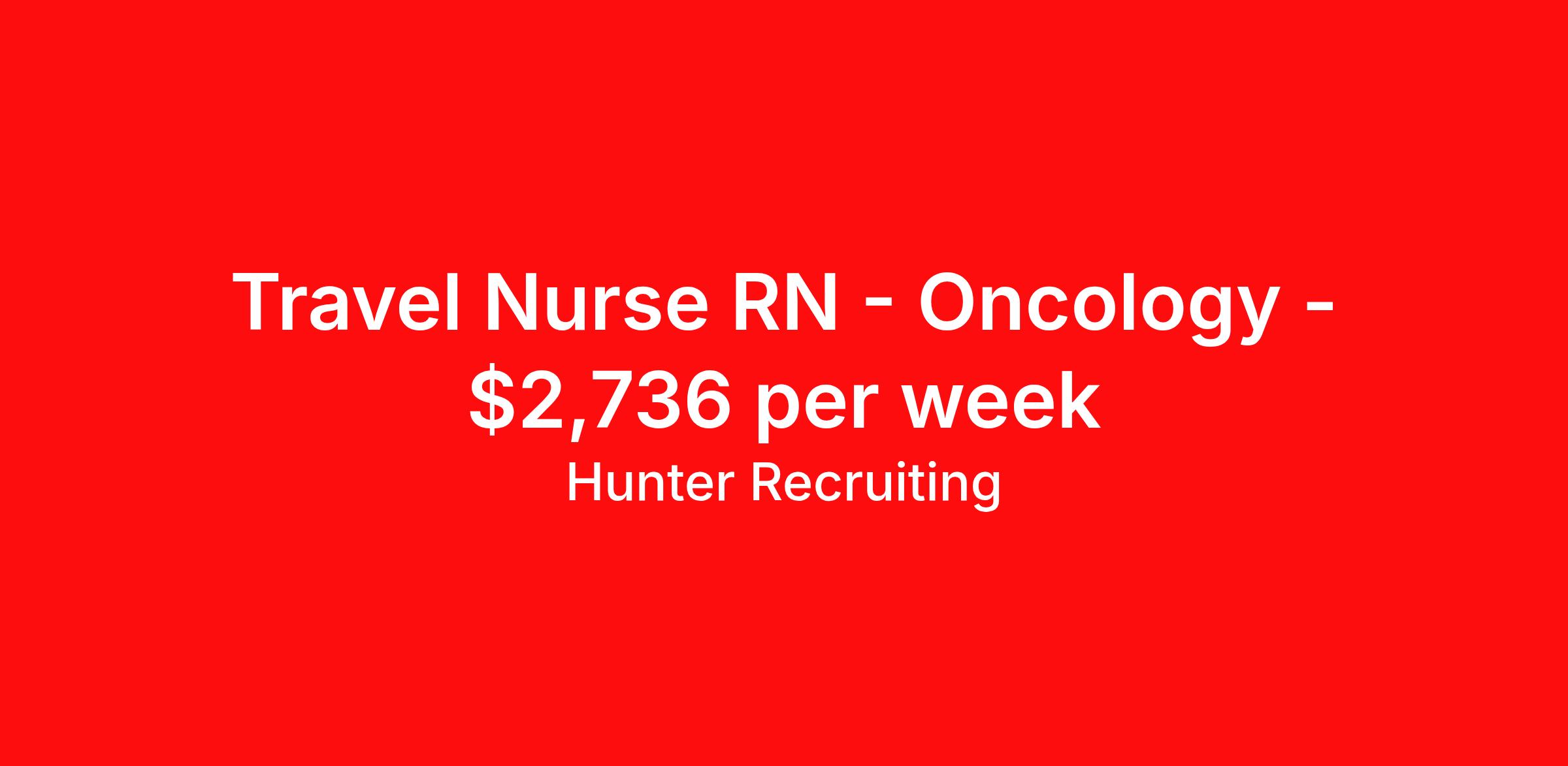 Hunter Recruiting is seeking a travel nurse RN Oncology for a travel nursing job in Cleveland, Ohio. Job Description & Requirements Specialty: Oncology Discipline: RN Start Date: 04/28/2026 Duration: 13 weeks 36 hours per week Shift: 12 hours, nights Employment Type: Travel Surgical Oncology RN / MICU Step Down Unit - 3x12 Nights Requirement: Oncology, Step Down, Surgical, Telemetry 2 years of experience required BLS Certification is a requirement Ohio license in hand Surgical Oncology RN / MICU Step Down Unit - 3x12 Nights Requirement: Oncology, Step Down, Surgical, Telemetry 2 years of experience required BLS Certification is a requirement Ohio license in hand About Hunter Recruiting Founded in 2006, Hunter Recruiting is a national technical staffing leader. Hunter helps qualified job seekers find employers throughout the United States. Hunter Recruiting provides job placement for professionals in technical fields and executive positions with Fortune 1000 employers. Benefits Medical benefits Dental benefits Vision benefits