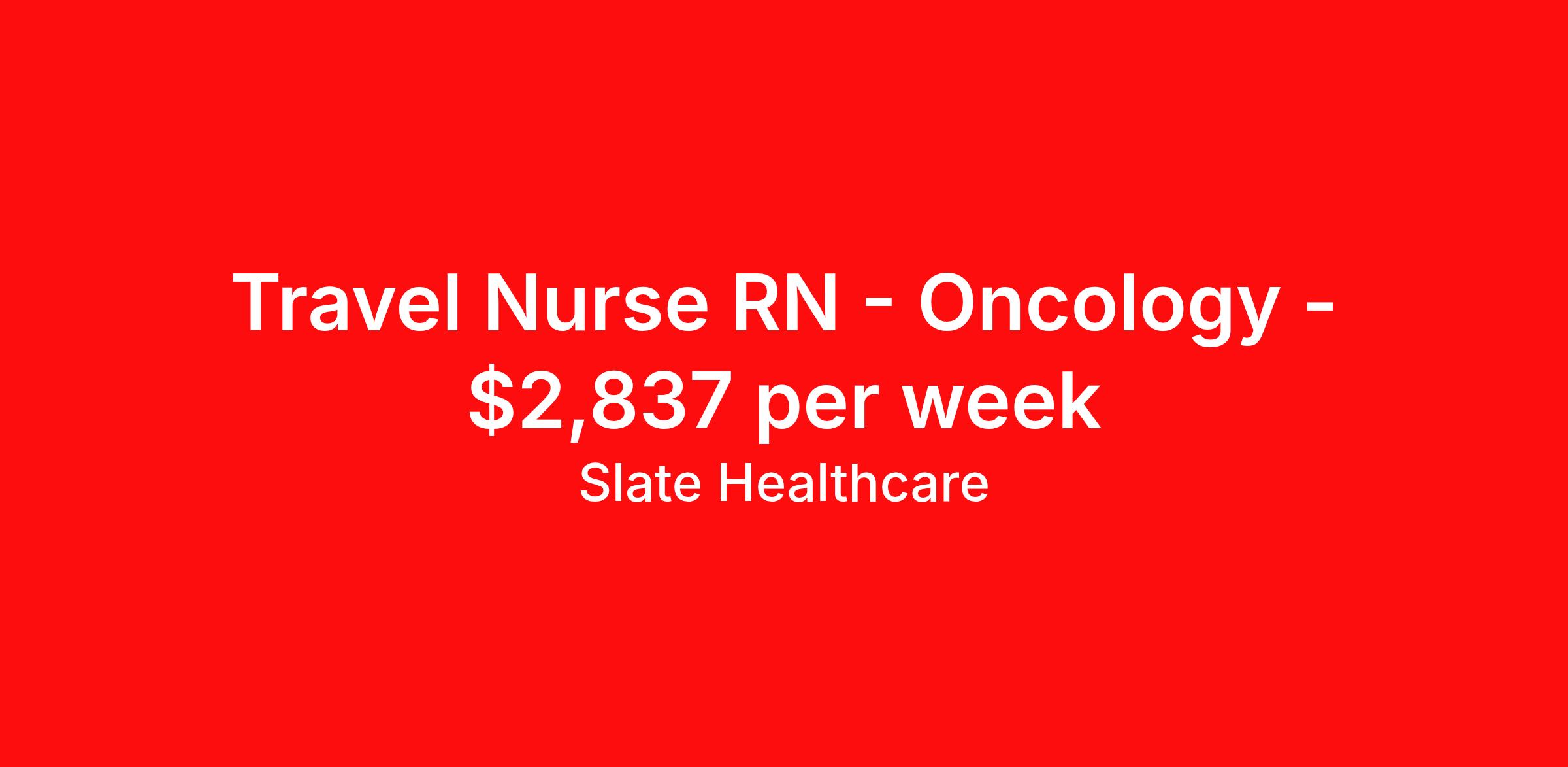 Slate Healthcare is seeking a travel nurse RN Oncology for a travel nursing job in Chico, California. Job Description & Requirements Specialty: Oncology Discipline: RN Start Date: ASAP Duration: 13 weeks 36 hours per week Shift: 12 hours, nights Employment Type: Travel Profession:RN, JobSpecialty:Oncology, Shift:3x12 NOC, Duration:13 weeks Slate Healthcare Job ID 4467c2e1-124b-46e5-8dd3-42e256ffd068. Pay package is based on 12 hour shifts and 36 hours per week (subject to confirmation) with tax-free stipend amount to be determined. About Slate Healthcare Slate Healthcare is a premier travel healthcare staffing agency, connecting healthcare professionals with thousands of opportunities at top-tier hospitals and facilities across the country. We’re committed to supporting nurses and allied health professionals in building stable, fulfilling careers—while embracing the freedom and excitement that comes with travel. Our goal is simple: to offer flexibility, competitive pay, and personalized placements that align with each clinician’s lifestyle and career goals. At Slate, we empower our professionals to choose when and where they work, while ensuring they receive the highest compensation possible—because we believe that exceptional care starts with empowered caregivers.