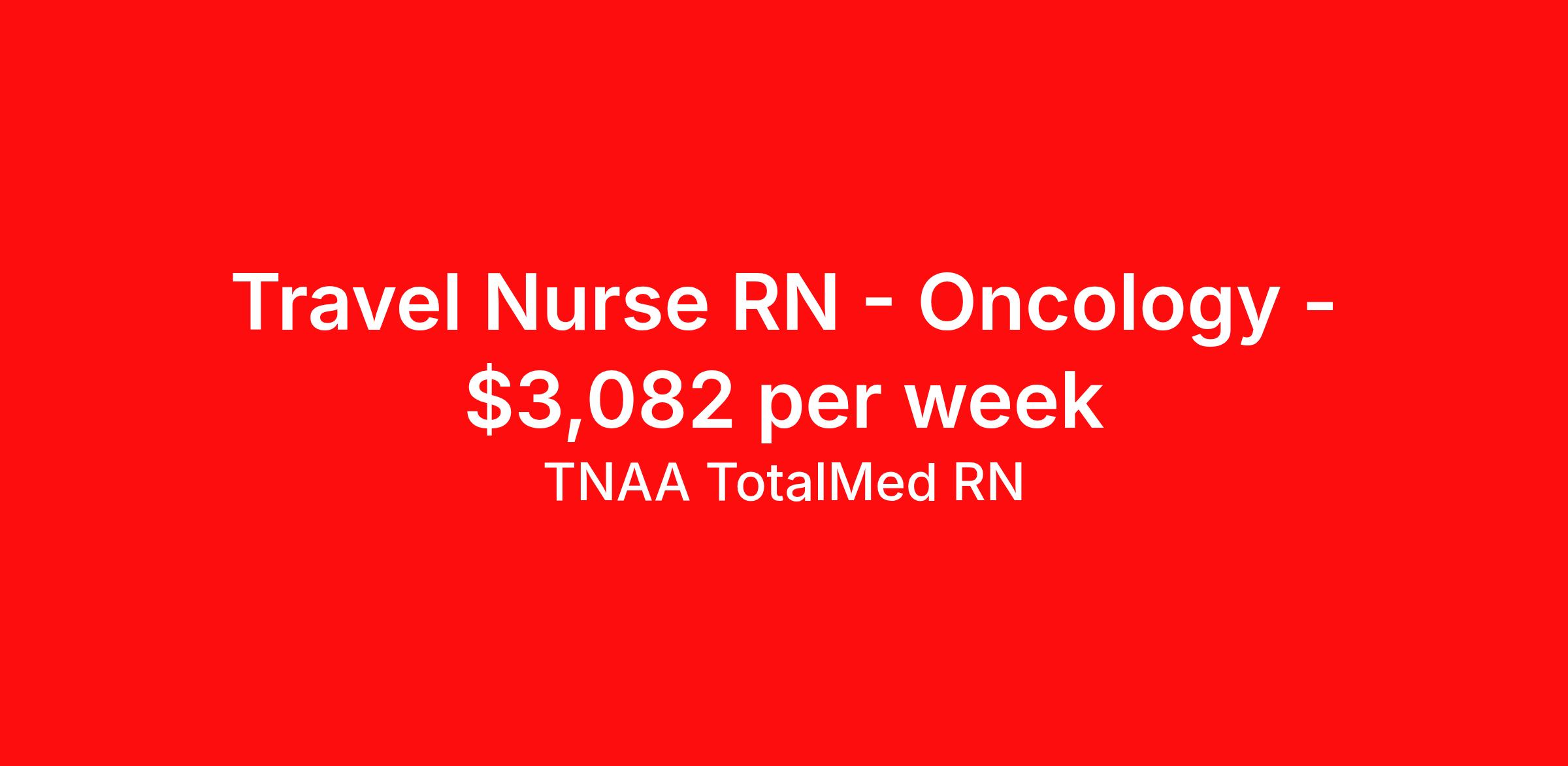 TNAA TotalMed RN is seeking a travel nurse RN Oncology for a travel nursing job in Palo Alto, California. Job Description & Requirements Specialty: Oncology Discipline: RN Start Date: 03/30/2026 Duration: 13 weeks 40 hours per week Shift: 10 hours, days Employment Type: Travel About TNAA TotalMed RN TotalMed is a Top Ten, travel nursing and healthcare staffing agency with the mission of igniting purpose in healthcare. The organization staffs nurses, therapists, pharmacists, and other clinicians of all specialties in all 50 states. They offer local and travel jobs and match caregivers with the right organization to assist both facilities and patients. As an organization, they focus on putting highly-skilled staff into facilities to ensure adequate staffing for a better patient experience. TotalMed specializes in recruiting and placing healthcare professionals in travel, PRN, and permanent positions across the country in Nursing and Allied Health. Throughout 2020, the organization filled roles at even the most short-staffed facilities during the most challenging time in healthcare. By matching the right travel healthcare professional with the right organization, TotalMed continues to offer a lifeline to facilities and their patients. Benefits Weekly pay Guaranteed Hours Continuing Education 401k retirement plan Sick pay Wellness and fitness programs Referral bonus Employee assistance programs Medical benefits Dental benefits Vision benefits Benefits start day 1