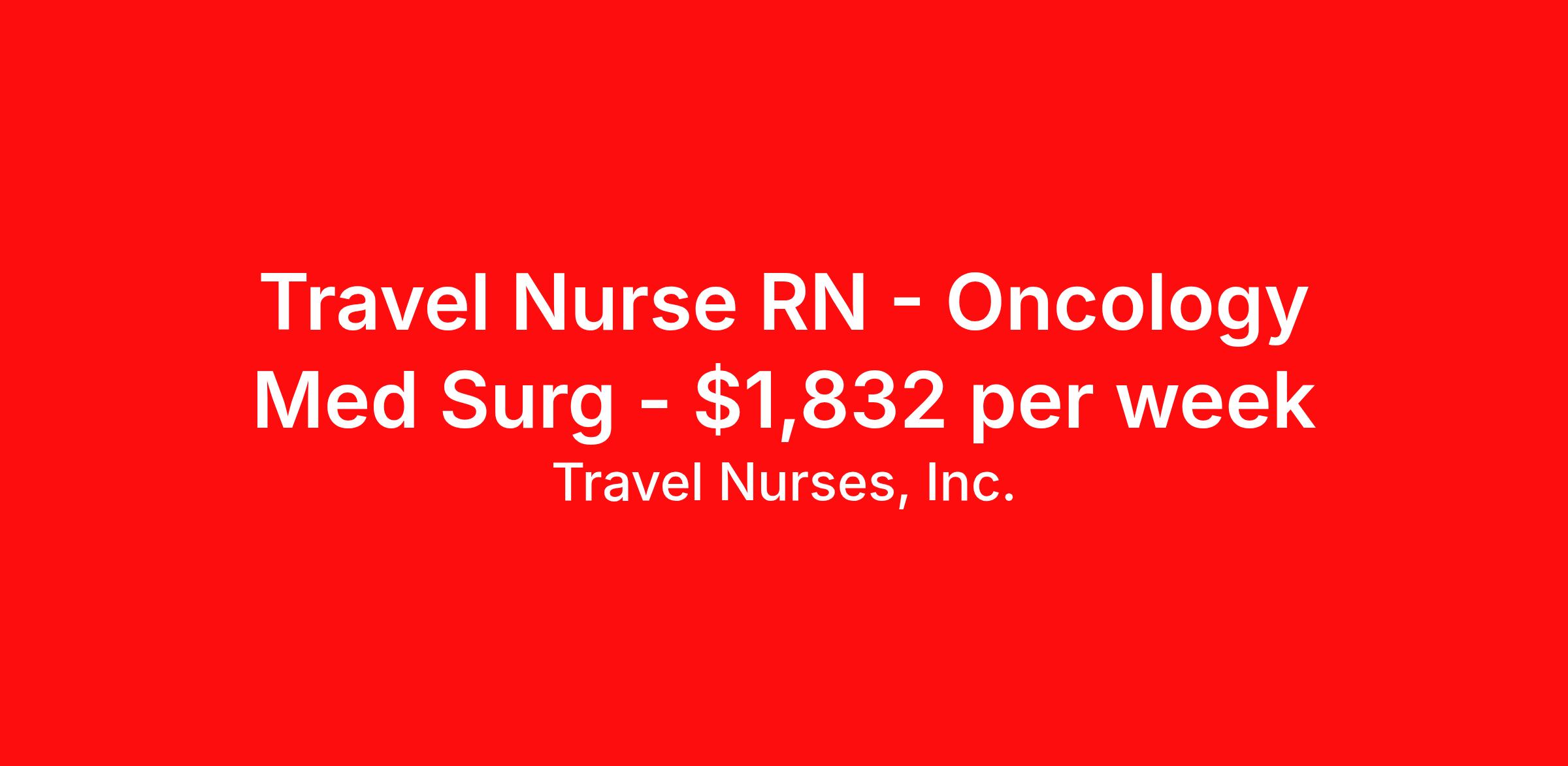 Travel Nurses, Inc. is seeking a travel nurse RN Oncology Med Surg for a travel nursing job in Anderson, South Carolina. Job Description & Requirements Specialty: Oncology Discipline: RN Start Date: 04/06/2026 Duration: 13 weeks 36 hours per week Shift: 12 hours Employment Type: Travel Travel Nurses, Inc. Job ID 309473. Pay package is based on 12 hour shifts and 36 hours per week (subject to confirmation) with tax-free stipend amount to be determined. Posted job title: Medical Surgical Oncology Registered Nurse About Travel Nurses, Inc. Travel Nurses, Inc. is a leading healthcare staffing agency that provides healthcare professionals with opportunities to work across the country. Founded by nurses in 1988, TNI has more than 30 years of experience in the industry. The agency initially focused on staffing operating room settings in the MidSouth. However, this quickly evolved to encompass all nursing specialties and allied health fields nationwide. At the heart of our mission is a profound respect for nurses, whom we consider the cornerstone of healthcare. This acknowledgment extends beyond the nursing profession alone. Travel Nurses, Inc. now proudly embraces a wide array of healthcare professionals, recognizing their crucial roles in our collective mission. Travel Nurses, Inc. is dedicated to providing comprehensive support and opportunities that will help facilitate complete career mobility in the healthcare field. Our commitment to transparency ensures that all professionals, not just nurses, can confidently accept any assignment without financial uncertainties. We prioritize our professionals’ well-being with comprehensive benefits packages, including day-one healthcare coverage, competitive salaries, bonuses and incentives. This underscores our unwavering commitment to offering the best possible rewards and support for all the professionals we serve. Benefits Weekly pay Continuing Education 401k retirement plan Wellness and fitness programs Mileage reimbursement Referral bonus Employee assistance programs Medical benefits Dental benefits Vision benefits Benefits start day 1 License and certification reimbursement Life insurance Retention bonus