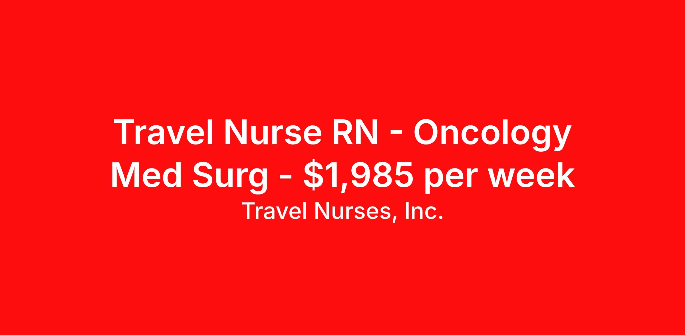 Travel Nurses, Inc. is seeking a travel nurse RN Oncology Med Surg for a travel nursing job in Memphis, Tennessee. Job Description & Requirements Specialty: Oncology Discipline: RN Start Date: 03/23/2026 Duration: 13 weeks 36 hours per week Shift: 12 hours Employment Type: Travel Travel Nurses, Inc. Job ID 302925. Pay package is based on 12 hour shifts and 36 hours per week (subject to confirmation) with tax-free stipend amount to be determined. Posted job title: Medical Surgical Oncology Registered Nurse About Travel Nurses, Inc. Travel Nurses, Inc. is a leading healthcare staffing agency that provides healthcare professionals with opportunities to work across the country. Founded by nurses in 1988, TNI has more than 30 years of experience in the industry. The agency initially focused on staffing operating room settings in the MidSouth. However, this quickly evolved to encompass all nursing specialties and allied health fields nationwide. At the heart of our mission is a profound respect for nurses, whom we consider the cornerstone of healthcare. This acknowledgment extends beyond the nursing profession alone. Travel Nurses, Inc. now proudly embraces a wide array of healthcare professionals, recognizing their crucial roles in our collective mission. Travel Nurses, Inc. is dedicated to providing comprehensive support and opportunities that will help facilitate complete career mobility in the healthcare field. Our commitment to transparency ensures that all professionals, not just nurses, can confidently accept any assignment without financial uncertainties. We prioritize our professionals’ well-being with comprehensive benefits packages, including day-one healthcare coverage, competitive salaries, bonuses and incentives. This underscores our unwavering commitment to offering the best possible rewards and support for all the professionals we serve. Benefits Weekly pay Continuing Education 401k retirement plan Wellness and fitness programs Mileage reimbursement Referral bonus Employee assistance programs Medical benefits Dental benefits Vision benefits Benefits start day 1 License and certification reimbursement Life insurance Retention bonus