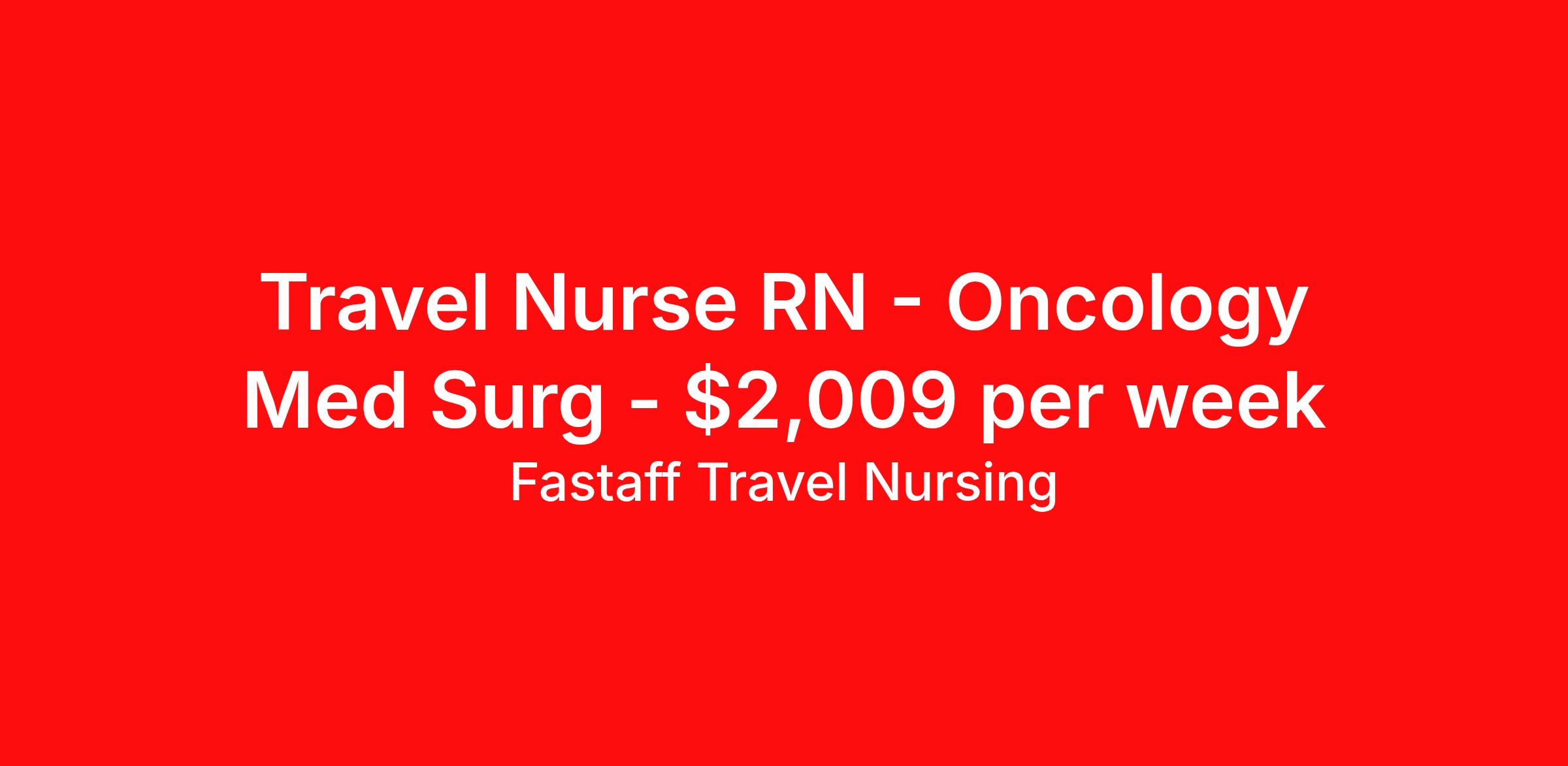 Fastaff Travel Nursing is seeking a travel nurse RN Oncology Med Surg for a travel nursing job in Asheville, North Carolina. Job Description & Requirements Specialty: Oncology Discipline: RN Start Date: ASAP Duration: 13 weeks 36 hours per week Shift: 12 hours, nights Employment Type: Travel About this Job As an Oncology Nurse, you'll provide and supervise nursing care for cancer patients. Oncology RNs monitor patient condition, administer medications, and you'll educate cancer patients about treatment options and particularities of the disease. Med Surgical Oncology RN requirements Travel nurses work for a limited amount of time at a particular location, providing patient care and support before moving on to their next exciting adventure. Travel healthcare professionals are experienced caregivers who adapt quickly to change and enjoy learning new things. Take your skills on the road and explore somewhere new—all while earning a great living! Basic travel nursing requirements include: 1-2 years recent experience in the job's primary area of care Active license or appropriate accreditation in one of the 50 US states Additional requirements & certifications as may be requested by the specificfacility/unit An enthusiastic, adventurous spirit with a desire to help Travel nursing in Asheville, NC Working in North Carolina offers you the opportunity to enjoy sunrise over the mountains on the same day you watch the sunset on the Outer Banks! The Blue Ridge Mountains cover the western half of the state and offer stunning views. On your day off, take a Segway tour of downtown Charlotte, visit the Biltmore Estate in Asheville, drive the famous Tail of the Dragon mountain pass, or kayak through the Cedar Island National Wildlife Refuge. Why become a Fastaff Traveler? More than thirty years ago, Fastaff pioneered the practice of Rapid Response® travel nurse staffing. Since then, the company has grown to become the leading provider of urgent and crucial temporary registered nurses to help hospitals provide continuous, high-quality patient care, while offering premium pay to registered nurses. In partnering with many of the nation’s largest and most prestigious healthcare facilities as well as small community hospitals, Fastaff provides enriching employment opportunities to RNs while also providing the highest pay in the industry to meet acute staffing needs and provide unparalleled patient care. By applying for this job, you agree to receive calls, AI-generated calls, text messages, or emails from Ingenovis Health and its affiliates, and contracted partners. Frequency varies for text messages.Message and data rates may apply. Carriers are not liable for delayed or undelivered messages. You can reply STOP to cancel and HELP for help.You can access our privacy policy at Ingenovis uses AI technology to extract specific information to their systems. Fastaff Travel Nursing Job ID 448005. Pay package is based on 12 hour shifts and 36 hours per week (subject to confirmation) with tax-free stipend amount to be determined. Posted job title: Med Surgical Oncology RN About Fastaff Travel Nursing More than two decades ago, Fastaff pioneered the practice of Rapid Response ® travel nurse staffing. Since then, the company has grown to become the leading provider of urgent and crucial temporary registered nurses to help hospitals provide continuous, high-quality patient care, while offering premium pay to registered nurses. In partnering with many of the nation’s largest and most prestigious healthcare facilities as well as small community hospitals, Fastaff provides enriching employment opportunities to RNs while also providing the highest pay in the industry to meet acute staffing needs and provide unparalleled patient care. Fastaff® Travel Nursing is an equal opportunity employer.