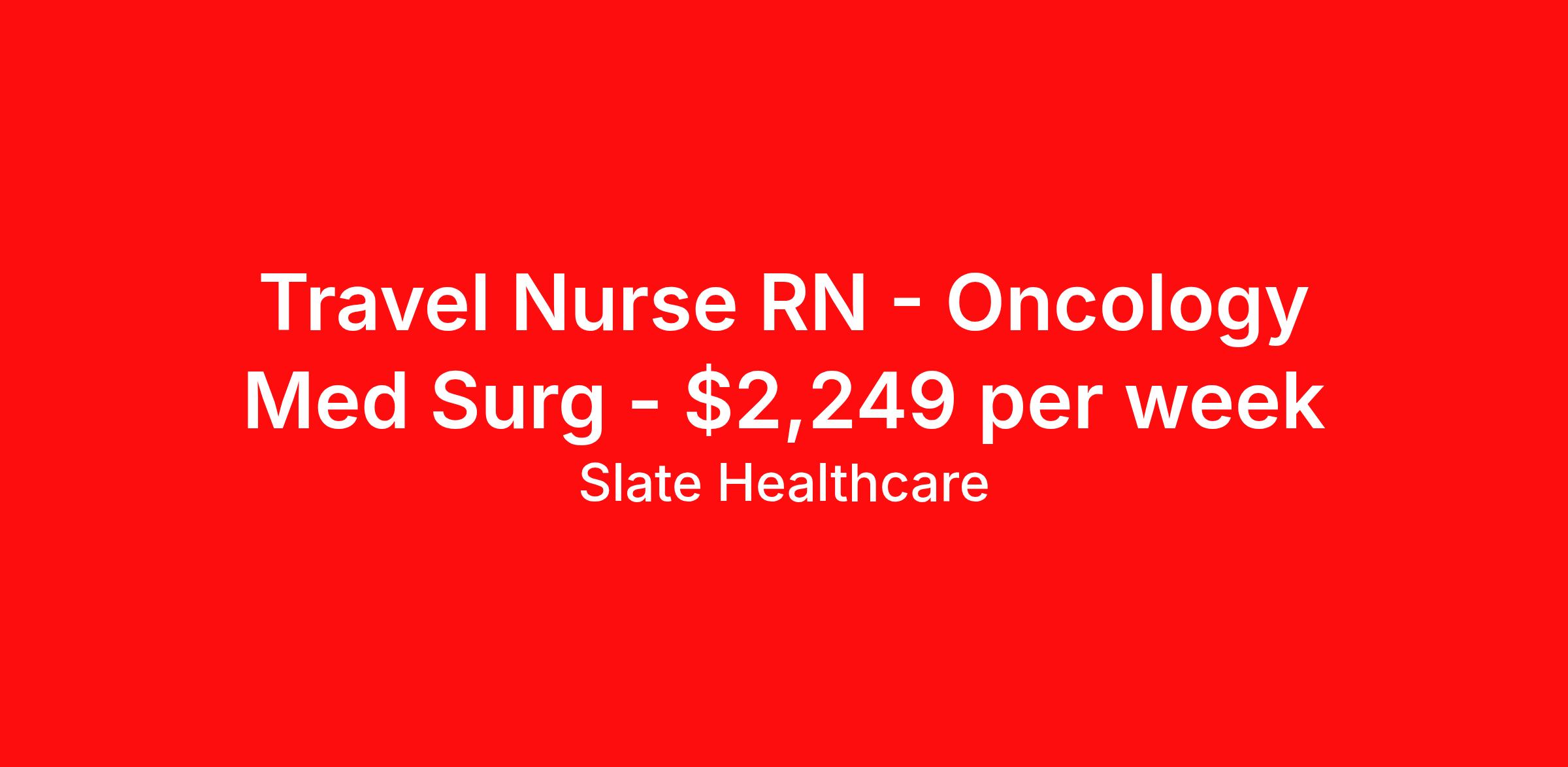 Slate Healthcare is seeking a travel nurse RN Oncology Med Surg for a travel nursing job in Terre Haute, Indiana. Job Description & Requirements Specialty: Oncology Discipline: RN Start Date: ASAP Duration: 13 weeks 36 hours per week Shift: 12 hours, nights Employment Type: Travel Profession:RN, JobSpecialty:Med Surg Oncology, Shift:3x12 Nights, Duration:13 weeks Slate Healthcare Job ID 80d2a57d-b010-463d-a145-e6e0aafd65a3. Pay package is based on 12 hour shifts and 36 hours per week (subject to confirmation) with tax-free stipend amount to be determined. About Slate Healthcare Slate Healthcare is a premier travel healthcare staffing agency, connecting healthcare professionals with thousands of opportunities at top-tier hospitals and facilities across the country. We’re committed to supporting nurses and allied health professionals in building stable, fulfilling careers—while embracing the freedom and excitement that comes with travel. Our goal is simple: to offer flexibility, competitive pay, and personalized placements that align with each clinician’s lifestyle and career goals. At Slate, we empower our professionals to choose when and where they work, while ensuring they receive the highest compensation possible—because we believe that exceptional care starts with empowered caregivers.