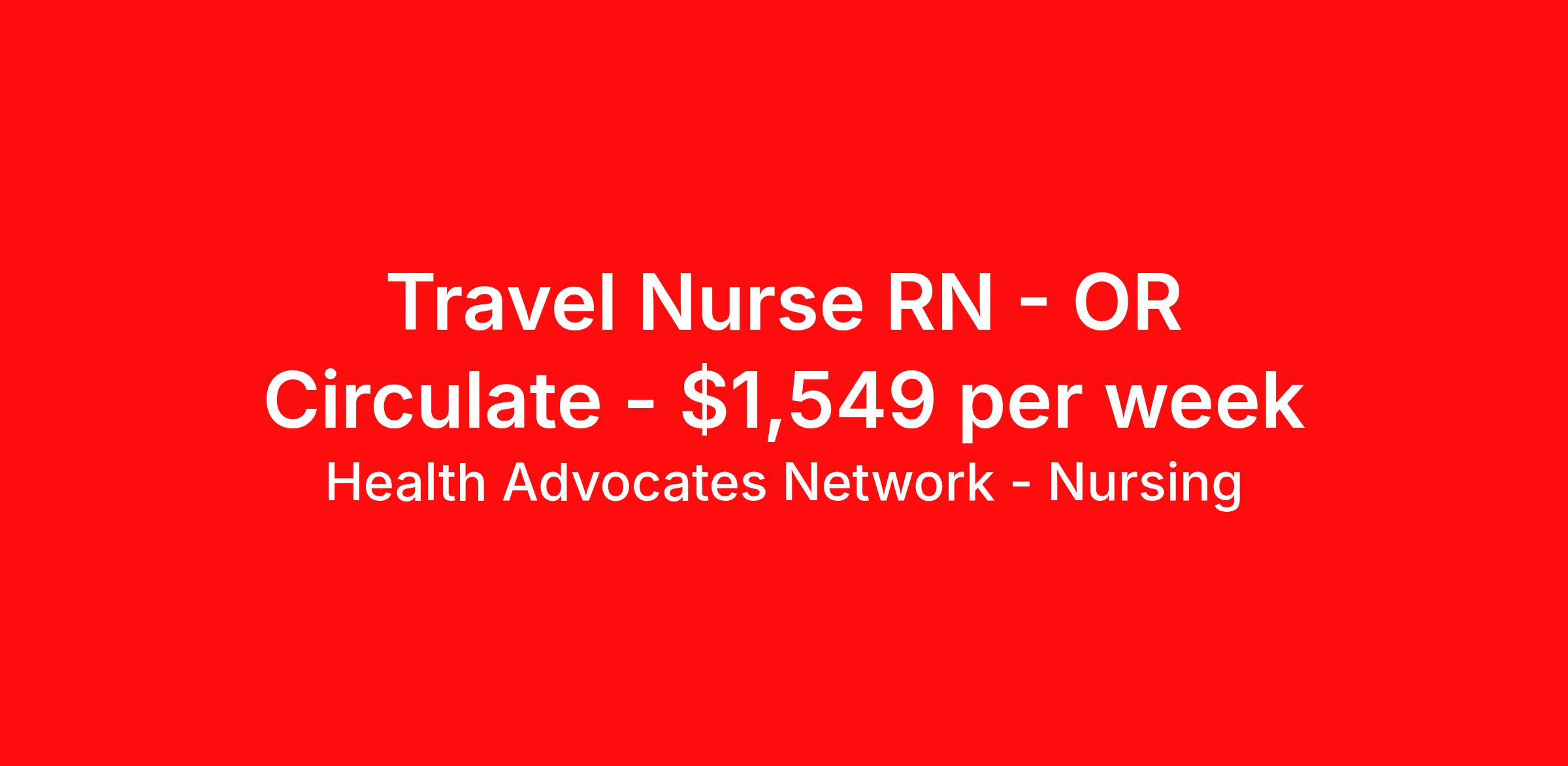 Health Advocates Network - Nursing is seeking a travel nurse RN OR Circulate for a travel nursing job in Grand Junction, Colorado. Job Description & Requirements Specialty: OR Circulate Discipline: RN Start Date: 04/06/2026 Duration: 13 weeks 36 hours per week Shift: 12 hours Employment Type: Travel HANStaff Job ID 521521. Pay package is based on 12 hour shifts and 36 hours per week (subject to confirmation) with tax-free stipend amount to be determined. Posted job title: RN - OR Circulator About Health Advocates Network - Nursing Health Advocates Network was founded on the basis of a shared aspiration, to improve the way healthcare staffing is done. We are a company established and led by nurses. Our flexible approach enables us to develop solutions customized to your specific needs. From short- and long-term travel contracts to local and per diem assignments and more, we are here to get you to your next adventure! By solving challenges, providing the best placements, and advocating for you, we stand to help you thrive and pave the path forward in your career. Click on the videos below to learn more about our values!