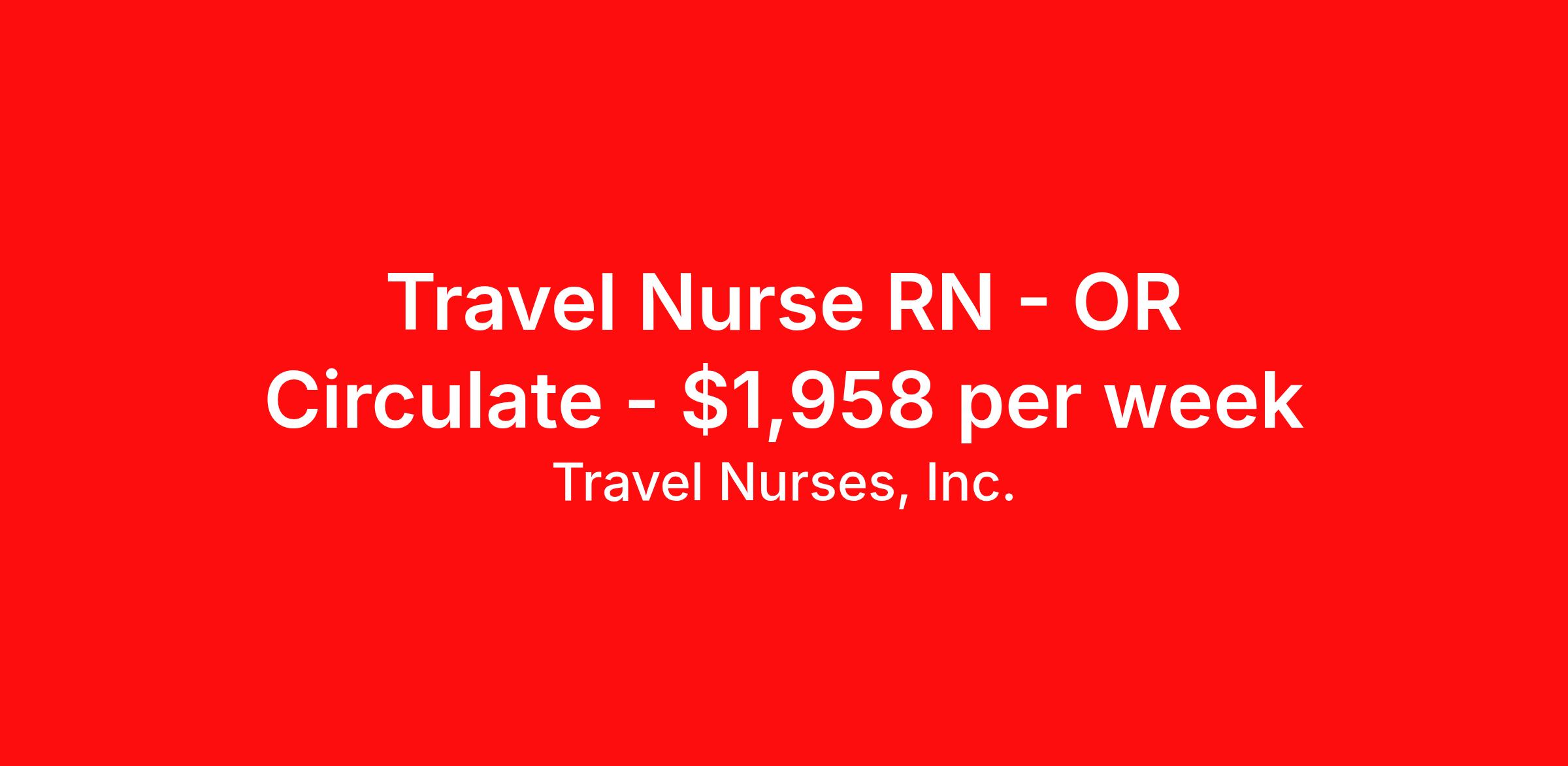 Travel Nurses, Inc. is seeking a travel nurse RN OR Circulate for a travel nursing job in Augusta, Georgia. Job Description & Requirements Specialty: OR Circulate Discipline: RN Start Date: 03/23/2026 Duration: 13 weeks 36 hours per week Shift: 12 hours Employment Type: Travel Travel Nurses, Inc. Job ID 306873. Pay package is based on 12 hour shifts and 36 hours per week (subject to confirmation) with tax-free stipend amount to be determined. Posted job title: Operating Room Registered Nurse About Travel Nurses, Inc. Travel Nurses, Inc. is a leading healthcare staffing agency that provides healthcare professionals with opportunities to work across the country. Founded by nurses in 1988, TNI has more than 30 years of experience in the industry. The agency initially focused on staffing operating room settings in the MidSouth. However, this quickly evolved to encompass all nursing specialties and allied health fields nationwide. At the heart of our mission is a profound respect for nurses, whom we consider the cornerstone of healthcare. This acknowledgment extends beyond the nursing profession alone. Travel Nurses, Inc. now proudly embraces a wide array of healthcare professionals, recognizing their crucial roles in our collective mission. Travel Nurses, Inc. is dedicated to providing comprehensive support and opportunities that will help facilitate complete career mobility in the healthcare field. Our commitment to transparency ensures that all professionals, not just nurses, can confidently accept any assignment without financial uncertainties. We prioritize our professionals’ well-being with comprehensive benefits packages, including day-one healthcare coverage, competitive salaries, bonuses and incentives. This underscores our unwavering commitment to offering the best possible rewards and support for all the professionals we serve. Benefits Weekly pay Continuing Education 401k retirement plan Wellness and fitness programs Mileage reimbursement Referral bonus Employee assistance programs Medical benefits Dental benefits Vision benefits Benefits start day 1 License and certification reimbursement Life insurance Retention bonus