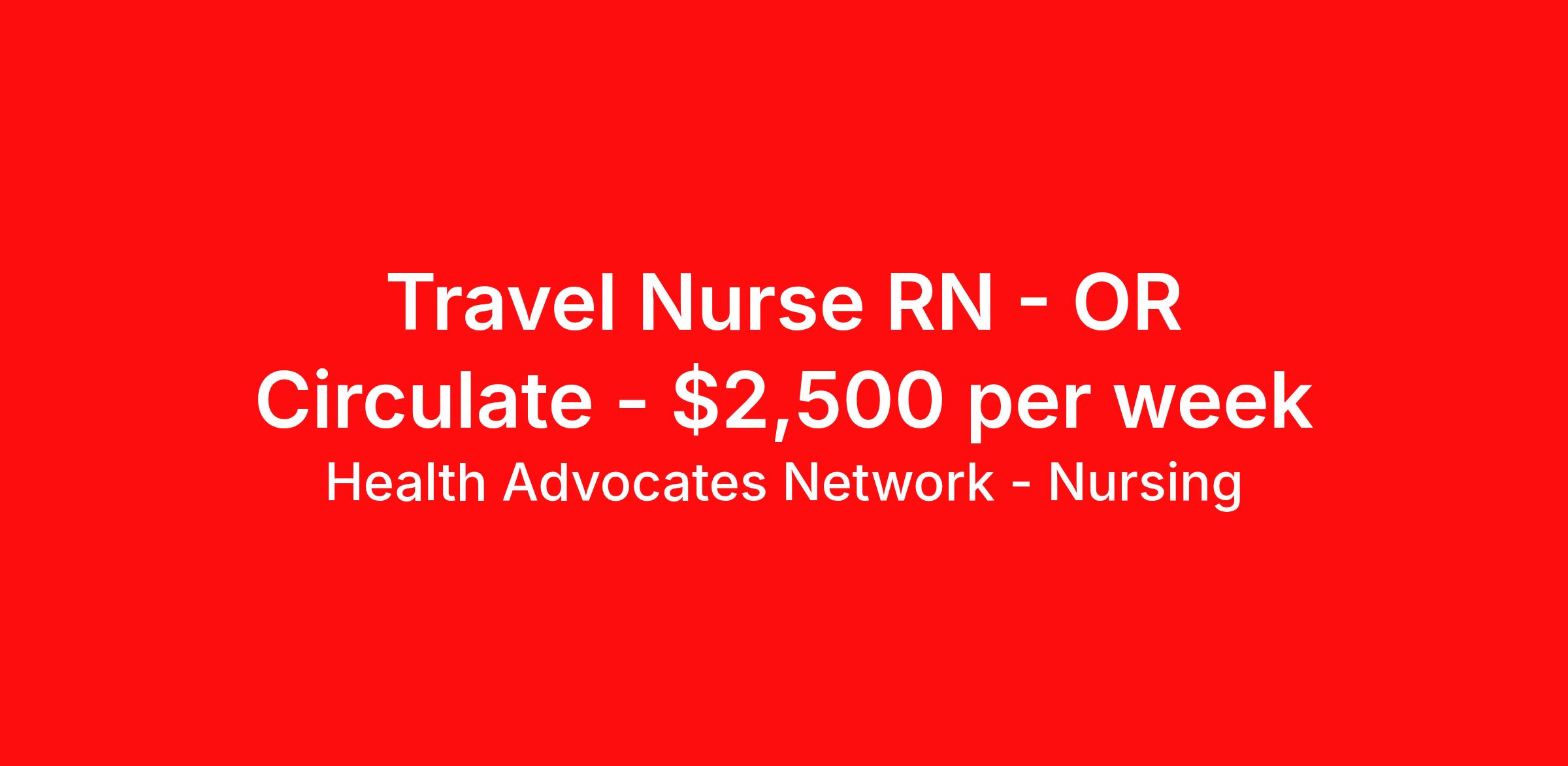 Health Advocates Network - Nursing is seeking a travel nurse RN OR Circulate for a travel nursing job in Morristown, Vermont. Job Description & Requirements Specialty: OR Circulate Discipline: RN Start Date: 04/06/2026 Duration: 13 weeks 36 hours per week Shift: 12 hours, rotating Employment Type: Travel HANStaff Job ID 522802. Pay package is based on 12 hour shifts and 36 hours per week (subject to confirmation) with tax-free stipend amount to be determined. Posted job title: RN - OR Circulator About Health Advocates Network - Nursing Health Advocates Network was founded on the basis of a shared aspiration, to improve the way healthcare staffing is done. We are a company established and led by nurses. Our flexible approach enables us to develop solutions customized to your specific needs. From short- and long-term travel contracts to local and per diem assignments and more, we are here to get you to your next adventure! By solving challenges, providing the best placements, and advocating for you, we stand to help you thrive and pave the path forward in your career. Click on the videos below to learn more about our values!