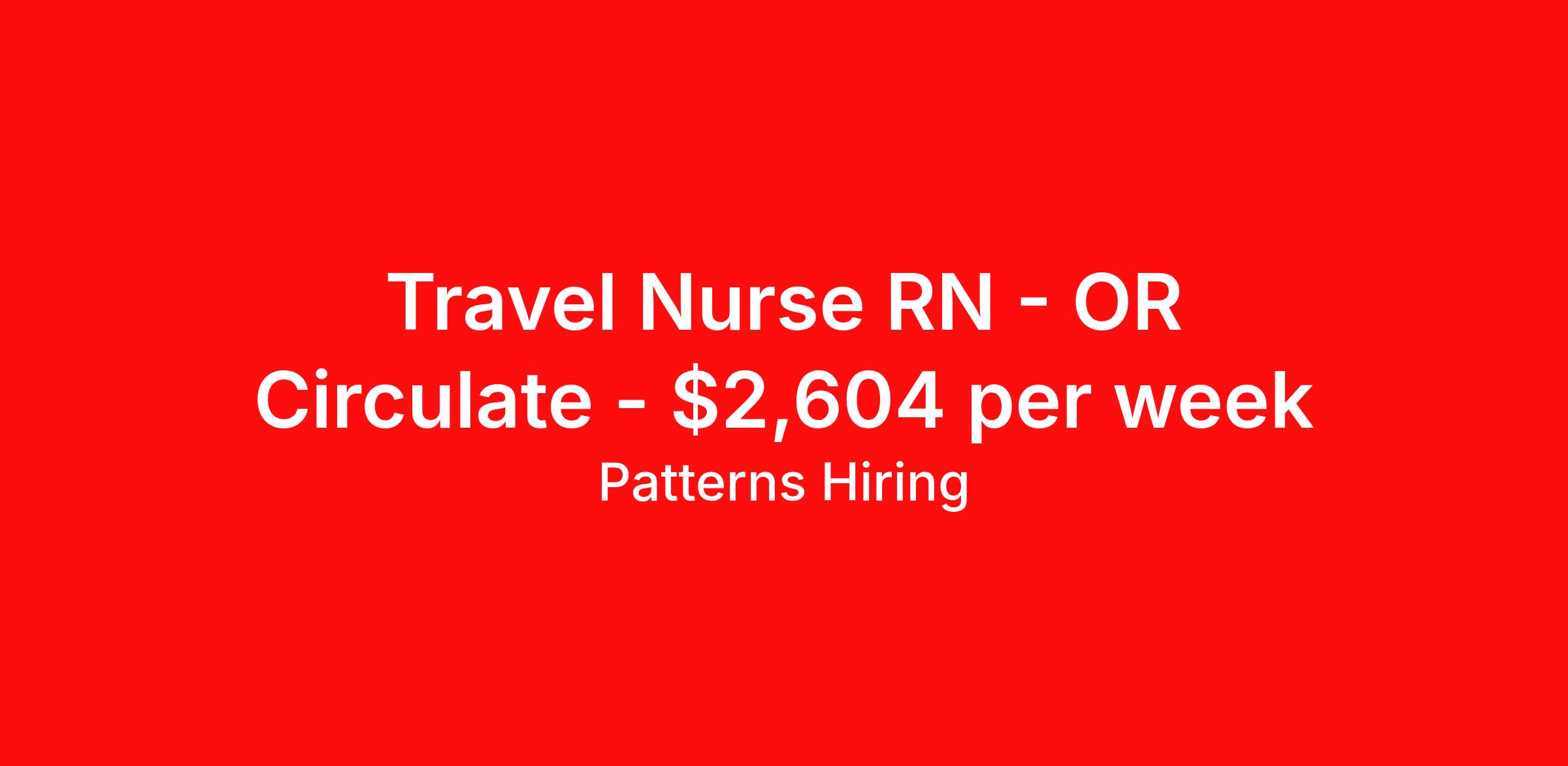 Patterns Hiring is seeking a travel nurse RN OR Circulate for a travel nursing job in Clearlake, California. Job Description & Requirements Specialty: OR Circulate Discipline: RN Start Date: 04/13/2026 Duration: 13 weeks 40 hours per week Shift: 10 hours, days Employment Type: Travel Clear Lake, CA | ️ 13 Weeks | ⏱️ 4×10-Hour Days (6:30a–5:00p) Seeking an experienced Registered Nurse – OR Circulator with minimum 3 years recent OR experience (must have worked in specialty within the last 3 months). The RN will support perioperative patient care, circulating during surgical procedures, ensuring sterile technique, and collaborating with surgical teams for safe and efficient operations. Must be comfortable with call requirements and adaptable to schedule changes. Certifications required: Active CA RN License AHA BLS & ACLS (PALS preferred; CNOR/other specialty certs preferred) About Patterns Hiring Patterns Inc. is a talent solutions and staffing organization supporting clients across healthcare and allied domains. We partner closely with hospitals, healthcare systems, and organizations to deliver high-quality professionals for contingent and permanent roles. Our teams operate with a strong focus on transparency, accountability, and long-term career alignment. We believe successful placements are built on understanding both client needs and candidate goals, not just filling roles quickly. At Patterns, candidates can expect clear communication, ethical hiring practices, and consistent support throughout the hiring process. We value professionalism, collaboration, and growth, and we strive to create opportunities where talent can build meaningful and sustainable careers. Benefits Referral bonus