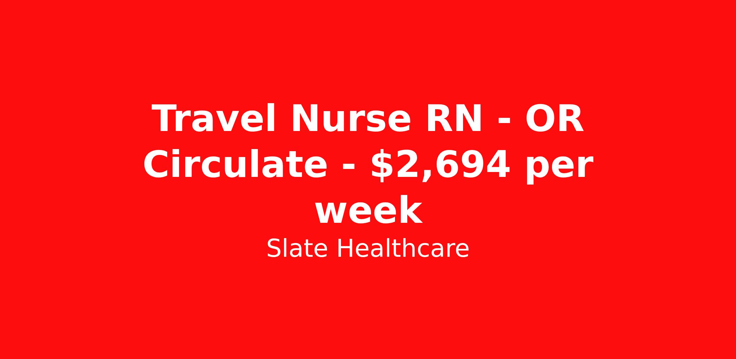 Slate Healthcare is seeking a travel nurse RN OR Circulate for a travel nursing job in Morristown, Vermont. Job Description & Requirements Specialty: OR Circulate Discipline: RN Start Date: 04/06/2026 Duration: 13 weeks 40 hours per week Shift: 8 hours, rotating Employment Type: Travel Profession:RN, JobSpecialty:Circulator OR, Shift:Rotating, Duration:13 weeks Slate Healthcare Job ID 39e73600-79e7-4612-9fea-aa4351883f08. Pay package is based on 8 hour shifts and 40 hours per week (subject to confirmation) with tax-free stipend amount to be determined. About Slate Healthcare Slate Healthcare is a premier travel healthcare staffing agency, connecting healthcare professionals with thousands of opportunities at top-tier hospitals and facilities across the country. We’re committed to supporting nurses and allied health professionals in building stable, fulfilling careers—while embracing the freedom and excitement that comes with travel. Our goal is simple: to offer flexibility, competitive pay, and personalized placements that align with each clinician’s lifestyle and career goals. At Slate, we empower our professionals to choose when and where they work, while ensuring they receive the highest compensation possible—because we believe that exceptional care starts with empowered caregivers.