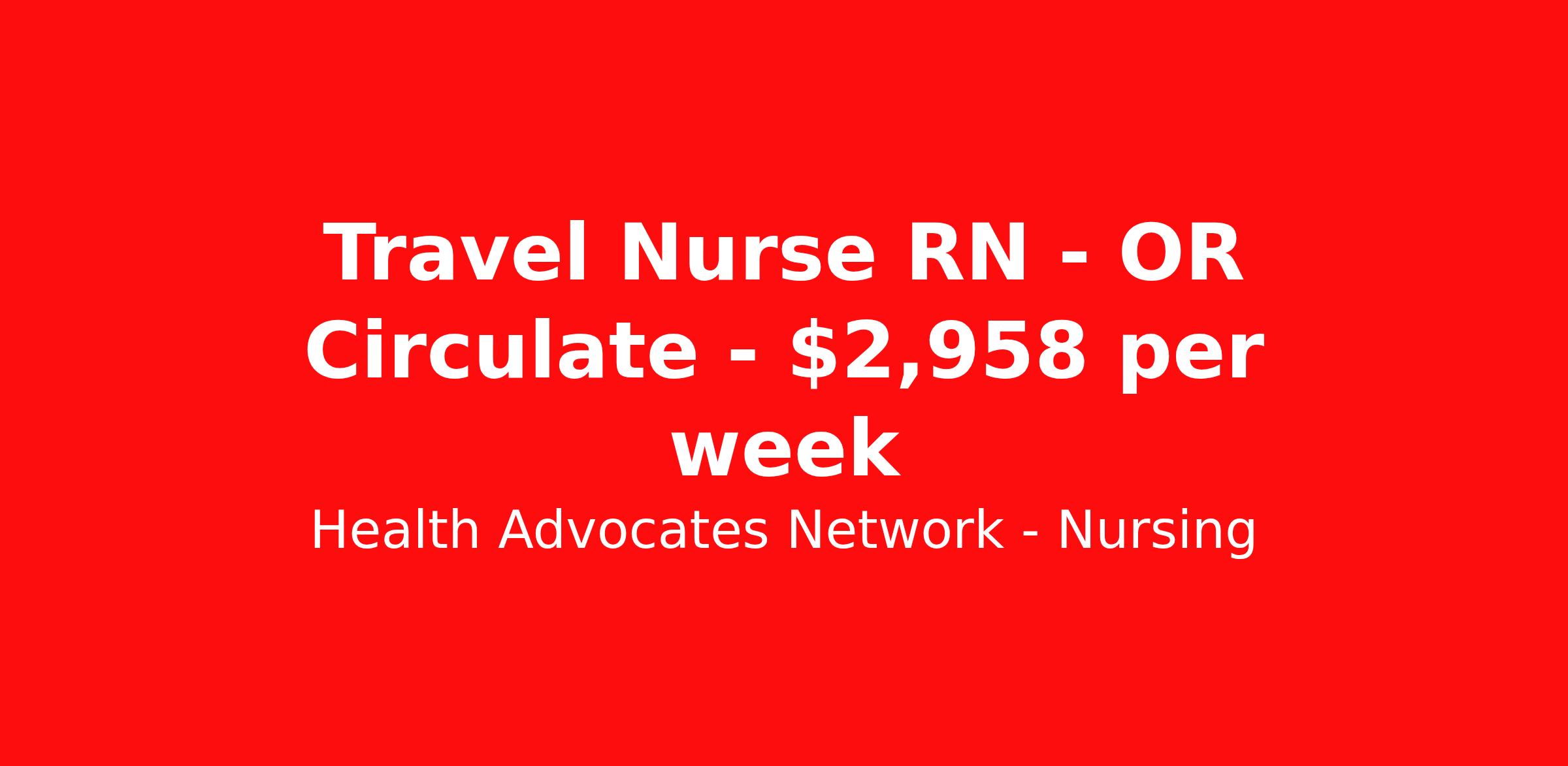 Health Advocates Network - Nursing is seeking a travel nurse RN OR Circulate for a travel nursing job in Hermiston, Oregon. Job Description & Requirements Specialty: OR Circulate Discipline: RN Start Date: ASAP Duration: 13 weeks 40 hours per week Shift: 8 hours, days Employment Type: Travel RN – OR Circulator Registered Nurse - Health Advocates Network is urgently hiring OR Circulator RNs with at least 2 years of recent experience! IMMEDIATE STARTS! Travel packages up to $2958 weekly Shift: 8 hour DAY shifts available 13 week contracts available Specialty: OR Circulator Registered Nurse (RN) Requirements: Active OR State Registered Nurse License Valid BLS Graduate of an Accredited School of Nursing Additional certifications may be required Benefits We Offer: Competitive pay rates, Referral Bonus, Medical, Dental and Vision. Travel reimbursement and per diem allowances, Employee discounts, educational opportunities, and more! To apply for this job now or to find out more about other opportunities with Health Advocates Network, Inc. reply to this posting, contact us at or call/text XXX-XXX-XXXX. We can provide you unparalleled access to exciting career opportunities. Health Advocates Network, Inc . is an equal opportunity employer. All qualified applicants shall receive consideration for employment without regard to any legally protected basis protected by applicable federal or state law except where a bona fide occupational qualification applies. Refer a Registered Nurse for a $1000.00 bonus opportunity! HANStaff Job ID 502106. Pay package is based on 8 hour shifts and 40 hours per week (subject to confirmation) with tax-free stipend amount to be determined. Posted job title: RN - OR Circulator About Health Advocates Network - Nursing Health Advocates Network was founded on the basis of a shared aspiration, to improve the way healthcare staffing is done. We are a company established and led by nurses. Our flexible approach enables us to develop solutions customized to your specific needs. From short- and long-term travel contracts to local and per diem assignments and more, we are here to get you to your next adventure! By solving challenges, providing the best placements, and advocating for you, we stand to help you thrive and pave the path forward in your career. Click on the videos below to learn more about our values!